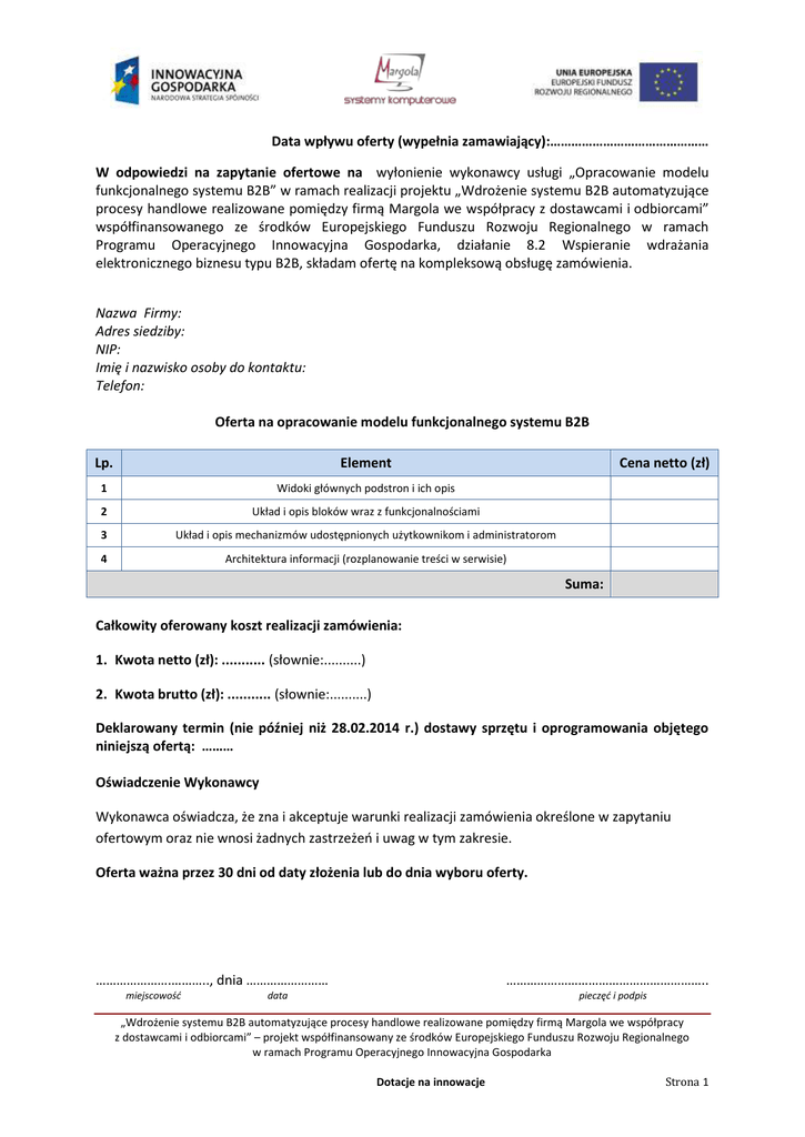 Data wpływu oferty (wypełnia zamawiający):……………………………………… W odpowiedzi na zapytanie ofertowe na wyłonienie wykonawcy usługi „Opracowanie modelu funkcjonalnego systemu B2B” w ramach realizacji projektu „Wdrożenie systemu B2B automatyzujące procesy handlowe realizowane pomiędzy firmą Margola we współpracy z dostawcami i odbiorcami” współfinansowanego ze środków Europejskiego Funduszu Rozwoju Regionalnego w ramach Programu Operacyjnego Innowacyjna Gospodarka, działanie 8.2 Wspieranie wdrażania elektronicznego biznesu typu B2B, składam ofertę na kompleksową obsługę zamówienia. Nazwa Firmy: Adres siedziby: NIP: Imię i nazwisko osoby do kontaktu: Telefon: Oferta na opracowanie modelu funkcjonalnego systemu B2B Lp. Element Cena netto (zł) 1 Widoki głównych podstron i ich opis 2 Układ i opis bloków wraz z funkcjonalnościami 3 Układ i opis mechanizmów udostępnionych użytkownikom i administratorom 4 Architektura informacji (rozplanowanie treści w serwisie) Suma: Całkowity oferowany koszt realizacji zamówienia: 1. Kwota netto (zł): ........... (słownie:..........) 2. Kwota brutto (zł): ........... (słownie:..........) Deklarowany termin (nie później niż 28.02.2014 r.) dostawy sprzętu i oprogramowania objętego niniejszą ofertą: ……… Oświadczenie Wykonawcy Wykonawca oświadcza, że zna i akceptuje warunki realizacji zamówienia określone w zapytaniu ofertowym oraz nie wnosi żadnych zastrzeżeń i uwag w tym zakresie. Oferta ważna przez 30 dni od daty złożenia lub do dnia wyboru oferty. ………………….……….., dnia …………………… miejscowość ………………………………………………….. data pieczęć i podpis „Wdrożenie systemu B2B automatyzujące procesy handlowe realizowane pomiędzy firmą Margola we współpracy z dostawcami i odbiorcami” – projekt współfinansowany ze środków Europejskiego Funduszu Rozwoju Regionalnego w ramach Programu Operacyjnego Innowacyjna Gospodarka Dotacje na innowacje Strona 1