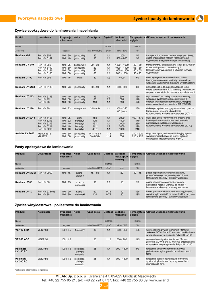tworzywa narzędziowe żywice i pasty do laminowania Żywice epoksydowe do laminowania i napełniania Produkt Utwardzacz Proporcja Kolor mieszania Czas życia Gęstość Lepkość mieszanki Norma ISO1183 Jednostka wagowo Temperatura Główne własności / zastosowanie * ugięcia ISO 75 min - 500ml,25oC g/cm3 mPas, 25oC o C RenLam M-1 Ren HY 956 Ren HY 5162 100 : 20 100 : 40 jasnożółty jasnożółty 30 30 1.1 1.1 1200 500 – 600 50 50 transparentna, utwardzalna w temp. pokojowej, dobra impregnacja włókien / laminaty oraz wypełnienia z użyciem różnych wypełniaczy RenLam CY 219 Ren HY 956 Ren HY 5162 Ren HY 5161 Ren HY 5160 100 : 25 100 : 50 100 : 50 100 : 50 bezbarwny jasnożółty jasnożółty jasnożółty 20 – 30 20 40 80 1.1 1.1 1.1 1.1 1400 – 1600 1000 – 1100 1000 – 1100 900 - 1000 40 – 50 55 – 60 50 – 55 45 - 50 transparentna, utwardzalna w temp. pok., wybór różnej reaktywności utwardzaczy / laminaty oraz wypełnienia z użyciem różnych wypełniaczy RenLam LY 90 Ren HY 956 100 : 16 biały 30 1.3 4500 60 duża wytrzymałość mechaniczna, dobra impregnacja włókien / laminaty i konstrukcje wsporcze, wypełnienie z różnymi wypełniaczami RenLam LY 5138 Ren HY 5138 100 : 23 jasnożółty 60 – 90 1.1 500 - 600 80 niska lepkość, odp. na podwyższone temp., dobre utwardzanie w RT / laminaty i konstrukcje wsporcze, wypełnienie z różnymi wypełniaczami RenLam LY 113 Ren HY 5158 Ren HY 97-1 Ren HY 98 100 : 19 100 : 30 100 : 30 jasnożółty jasnożółty jasnożółty 45 80 190 1.0 1.1 1.1 600 390 390 120 120 120 wytrzymałość na podwyższone temperatury, wspaniałe zwilżanie/ niskolepki system o dobrych własnościach termicznych, wstępne utwardzanie i rozformowanie w RT (25±3oC) RenLam LY 120 Ren HY 99 100 : 23 transparent 3.5 – 4 h 1.1 300 – 350 80 (40oC) 150 niskolepki system infuzyjny o dużej wytrzym. na temperaturę, wstępne utwardzanie i rozformowanie w niskiej temperaturze (40oC) RenLam LY 5210 Ren HY 5158 Ren HY 5213 Ren HY 5212 Ren HY 5211 Ren HY 5210 100 : 25 100 : 32 100 : 40 100 : 40 100 : 40 żółty bursztyn bursztyn bursztyn bursztyn 150 120 12 h 24 h 48 h 1.1 1.1 1.1 1.2 1.1 3000 1800 2000 2400 1300 160 – 170 170 220 190 210 długi czas życia / formy do pre-pregów oraz inne wysokotemperaturowe zastosowania narzędziowe, wstępne utwardzanie i rozformowanie w niskiej temperaturze (50 oC) Araldite LY 8615 Aradur 8615 XB 5173 100 : 50 100 : 38 jasnożółty jasnożółty 14 – 16.5 h 5 – 6.5 h 1.13 1.14 550 350 210 – 220 210 – 220 długi czas życia, niskolepki / infuzyjny system wysokotemperaturowy na formy, wstępne utwardzanie i rozformowanie w 50 oC Pasty epoksydowe do laminowania Produkt Utwardzacz Proporcja Kolor mieszania Czas życia Gęstość Zalecana Temperatura Główne własności / zastosowanie * maks. grub. ugięcia warstwy Norma ISO1183 Jednostka wagowo ISO 75 min - 500ml,25oC g/cm3 mm o C RenLam LV 572-2 Ren HY 2959 100 : 15 szaro zielony 45 – 60 1.1 20 40 – 45 pasta napełniona włóknami szklanymi, przetwórstwo ręczne, warstwy do 20mm / laminowane skorupy i struktury wsporcze RenLam LV 06 Ren HY 06 100 : 15 szaro niebieski 90 1.1 15 70 pasta napełniona włóknami szklanymi, nakładanie ręczne, warstwy do 15mm / laminowane skorupy i struktury wsporcze RenLam LV 10 Ren HY 97 Blue Ren HY 98 100 : 20 100 : 20 szaro niebieski 60 120 0.75 0.75 10 20 125 125 Lekka pasta napełniona włóknami węglowymi, wysoka wytrzymałość na temp. / lekkie, sztywne laminowane skorupy i struktury wsporcze Żywice winyloestrowe i poliestrowe do laminowania Produkt Katalizator Proporcja Kolor mieszania Czas życia Gęstość Lepkość mieszanki Norma ISO1183 Jednostka wagowo Temperatura Główne własności / zastosowania * ugięcia ISO 75 min - 500ml,25oC g/cm3 mPas, 25oC o 30 1.1 600 - 850 105 winyloestrowa żywica formierska / formy z żelkotem GCVN Serie X, warstwa przekładkowa w bez-skurczowym systemie Polymold LV150 20 1.12 600 - 900 145 winyloestrowa żywica formierska / formy z żelkotem GCVN Serie X, warstwa przekładkowa w bez-skurczowym systemie Polymold LV200 C VE 100 STD MEKP 50 100 : 1.5 VE 900 ACC MEKP 50 100 : 1.5 Polymold LV 150 RC MEKP 50 100 : 1.5 niebieski / biały po utwardz. 25 1.4 900 - 1300 90 Polymold LV 200 RC MEKP 50 100 : 1.5 niebieski / biały po utwardz. 25 1.4 900 - 1300 145 fioletowy specjalna izoftalowa formierska żywica poliestrowa / wykonywanie bez-skurczowych form specjalna epoksy-nowolakowa formierska żywica winyloestrowa / wykonywanie bezskurczowych form *Ostateczna odporność na temperaturę MILAR Sp. z o.o. ul. Graniczna 47, 05-825 Grodzisk Mazowiecki tel: +48 22 755 85 21, tel: +48 22 724 87 37, fax: +48 22 755 80 09, www.milar.pl 2.2-3