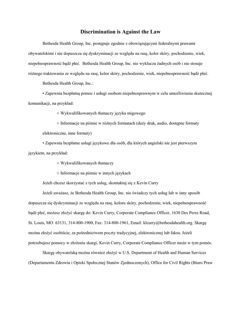 Discrimination is Against the Law Bethesda Health Group, Inc. postępuje zgodnie z obowiązującymi federalnymi prawami obywatelskimi i nie dopuszcza się dyskryminacji ze względu na rasę, kolor skóry, pochodzenie, wiek, niepełnosprawność bądź płeć. Bethesda Health Group, Inc. nie wyklucza żadnych osób i nie stosuje różnego traktowania ze względu na rasę, kolor skóry, pochodzenie, wiek, niepełnosprawność bądź płeć. Bethesda Health Group, Inc.: • Zapewnia bezpłatną pomoc i usługi osobom niepełnosprawnym w celu umożliwienia skutecznej komunikacji, na przykład: ○ Wykwalifikowanych tłumaczy języka migowego ○ Informacje na piśmie w różnych formatach (duży druk, audio, dostępne formaty elektroniczne, inne formaty) • Zapewnia bezpłatne usługi językowe dla osób, dla których angielski nie jest pierwszym językiem, na przykład: ○ Wykwalifikowanych tłumaczy ○ Informacje na piśmie w innych językach Jeżeli chcesz skorzystać z tych usług, skontaktuj się z Kevin Curry Jeżeli uważasz, że Bethesda Health Group, Inc. nie świadczy tych usług lub w inny sposób dopuszcza się dyskryminacji ze względu na rasę, koloru skóry, pochodzenie, wiek, niepełnosprawność bądź płeć, możesz złożyć skargę do: Kevin Curry, Corporate Compliance Officer, 1630 Des Peres Road, St. Louis, MO 63131, 314-800-1900, Fax: 314-800-1961, Email: [email protected]. Skargę można złożyć osobiście, za pośrednictwem poczty tradycyjnej, elektronicznej lub faksu. Jeżeli potrzebujesz pomocy w złożeniu skargi, Kevin Curry, Corporate Compliance Officer może w tym pomóc. Skargę obywatelską można również złożyć w U.S. Department of Health and Human Services (Departamentu Zdrowia i Opieki Społecznej Stanów Zjednoczonych), Office for Civil Rights (Biuro Praw Obywatelskich), drogą elektroniczną za pośrednictwem Office for Civil Rights Complaint Portal na stronie https://ocrportal.hhs.gov/ocr/portal/lobby.jsf, pocztą tradycyjną lub dzwoniąc pod numer telefonu: U.S. Department of Health and Human Services 200 Independence Avenue, SW Room 509F, HHH Building Washington, D.C. 20201 1-800-368-1019, 800-537-7697 (TDD) Formularze skarg są dostępne na stronie http://www.hhs.gov/ocr/office/file/index.html.