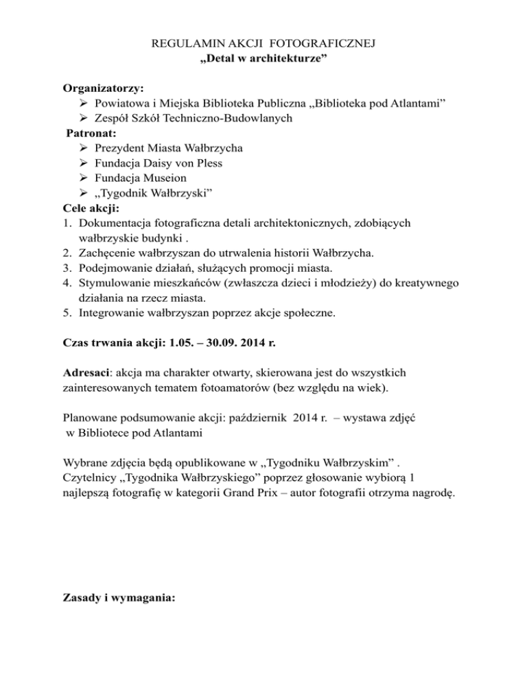 REGULAMIN AKCJI FOTOGRAFICZNEJ „Detal w architekturze” Organizatorzy: Powiatowa i Miejska Biblioteka Publiczna „Biblioteka pod Atlantami” Zespół Szkół Techniczno-Budowlanych Patronat: Prezydent Miasta Wałbrzycha Fundacja Daisy von Pless Fundacja Museion „Tygodnik Wałbrzyski” Cele akcji: 1. Dokumentacja fotograficzna detali architektonicznych, zdobiących wałbrzyskie budynki . 2. Zachęcenie wałbrzyszan do utrwalenia historii Wałbrzycha. 3. Podejmowanie działań, służących promocji miasta. 4. Stymulowanie mieszkańców (zwłaszcza dzieci i młodzieży) do kreatywnego działania na rzecz miasta. 5. Integrowanie wałbrzyszan poprzez akcje społeczne. Czas trwania akcji: 1.05. – 30.09. 2014 r. Adresaci: akcja ma charakter otwarty, skierowana jest do wszystkich zainteresowanych tematem fotoamatorów (bez względu na wiek). Planowane podsumowanie akcji: październik 2014 r. – wystawa zdjęć w Bibliotece pod Atlantami Wybrane zdjęcia będą opublikowane w „Tygodniku Wałbrzyskim” . Czytelnicy „Tygodnika Wałbrzyskiego” poprzez głosowanie wybiorą 1 najlepszą fotografię w kategorii Grand Prix – autor fotografii otrzyma nagrodę. Zasady i wymagania: 1. Każdy z zainteresowanych musi nadesłać 1 wydrukowane zdjęcie w formacie 20 x 30 cm (odpowiednik formatu A4). 2. Każdy, biorący udział w akcji ma obowiązek dostarczyć również płytę CD, zawierającą opisane zdjęcie, w formacie JPG, w maksymalnej rozdzielczości . 3. Zdjęcia nie mogą być modyfikowane w jakimkolwiek programie graficznym ani fotograficznym. Zdjęcie, w którym autor wykorzysta program, ulepszający fotografię, będzie zdyskwalifikowane. 4. Tematem zdjęcia musi być detal architektoniczny, zdobiący wybrany budynek miasta (np. herb, napis, monogram, cyfry, tarcza, ornament roślinny, płaskorzeźba, fresk). 5. Zdjęcie wraz z płytą powinno być dostarczone pocztą (lub złożone osobiście) do Zespołu Szkół Techniczno-Budowlanych, 58-302 Wałbrzych, ul. Przywodna 1 (sekretariat lub biblioteka szkolna) do dnia 30.09.2014 r. 6. Do fotografii należy dołączyć informacje: imię i nazwisko oraz pocztowy adres korespondencyjny autora zdjęcia (ewentualnie tylko adres e-mailowy), a także adres budynku, który znajduje się na zdjęciu. 7. Organizatorzy zastrzegają sobie prawo do nieodpłatnego wykorzystania prac w publikacjach związanych z akcją. 8. Prace przechodzą na własność organizatorów, którzy mają prawo do nieodpłatnego wykorzystania ich na wybranych przez siebie polach eksploatacji. 9. Przekazanie prac organizatorom jest równoznaczne ze znajomością regulaminu i jego akceptacją. 10. O zakwalifikowaniu prac na wystawę zadecyduje jury powołane przez Organizatorów. 11.Autorzy fotografii, uczestnicząc w akcji, wyrażają zgodę na wykorzystanie i przetwarzanie własnych danych osobowych przez Organizatorów na wystawie kończącej akcję oraz w wydawnictwach reklamowych i promocyjnych Wałbrzycha (zgodnie z Ustawą o ochronie danych osobowych – Dz.U. 1997 r. nr 133, poz. 833, z późn. zm.)