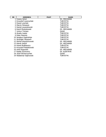 NR 1 2 3 4 5 6 7 8 9 10 11 12 13 14 15 16 17 18 19 KIEROWCA Cezary Góral Krzysztof Leszczyński Paweł Lutyński Marcin Panasiuk Daniel Lewandowski Kamil Modzelewski Jurkun Tomasz Alvatis Juakis Peter Rawinis Sergijus Zygimintas Wrangler Wojciech Michał Wojciechowski Marek Soboń Paweł Budkiewicz Krzysztof Radzikowski Arek Rogowski Radek Sychowicz Józef Skwierczyński Waldemar Dąbrowski PILOT KLASA EX. MECHANIK TURYSTYK TURYSTYK TURYSTYK TURYSTYK EX. MECHANIK QUAD TURYSTYK TURYSTYK TURYSTYK TURYSTYK EX. MECHANIK EX. MECHANIK TURYSTYK TURYSTYK EX. MECHANIK EX. ELEKTRYK QUAD TURYSTYK
