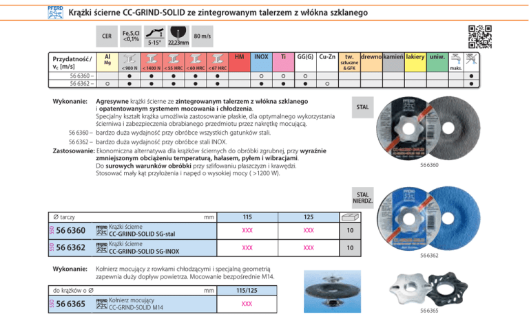 Krążki ścierne CC-GRIND-SOLID ze zintegrowanym talerzem z włókna szklanego CER Przydatność / vc [m/s] 56 6360 – 56 6362 – Fe,S,CI <0,1% 5-15° 22,23mm 80 m/s HM Al INOX Ti GG(G) Cu-Zn < 900 N ○ ● ● < 1400 N < 55 HRC < 60 HRC < 67 HRC ● ● ● ● ● ● tw. drewno kamień lakiery uniw. sztuczne & GFK Mg ● ● ○ ● ○ ● ○ ● maks. ● ● ○ Agresywne krążki ścierne ze zintegrowanym talerzem z włókna szklanego i opatentowanym systemem mocowania i chłodzenia. Specjalny kształt krążka umożliwia zastosowanie płaskie, dla optymalnego wykorzystania ścierniwa i zabezpieczenia obrabianego przedmiotu przez nakrętkę mocującą. 56 6360 – bardzo duża wydajność przy obróbce wszystkich gatunków stali. 56 6362 – bardzo duża wydajność przy obróbce stali INOX. Zastosowanie: Ekonomiczna alternatywa dla krążków ściernych do obróbki zgrubnej, przy wyraźnie zmniejszonym obciążeniu temperaturą, hałasem, pyłem i wibracjami. Do surowych warunków obróbki przy szlifowaniu płaszczyzn i krawędzi. Stosować mały kąt przyłożenia i napęd o wysokiej mocy ( >1200 W). Wykonanie: STAL 56 6360 STAL NIERDZ. 55O 56 6360 55O ⌀ tarczy 56 6362 Wykonanie: mm Krążki ścierne CC-GRIND-SOLID SG-stal Krążki ścierne CC-GRIND-SOLID SG-INOX 55O 125 XXX XXX 10 XXX XXX 10 56 6362 Kołnierz mocujący z rowkami chłodzącymi i specjalną geometrią zapewnia duży dopływ powietrza. Mocowanie bezpośrednie M14. do krążków o ⌀ 56 6365 115 mm Kołnierz mocujący CC-GRIND-SOLID M14 115/125 XXX 56 6365
