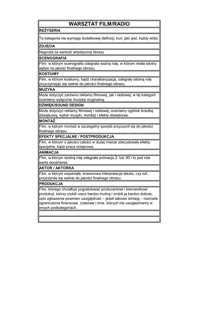 WARSZTAT FILM/RADIO REŻYSERIA Ta kategoria nie wymaga dodatkowej definicji; koń, jaki jest, każdy widzi. ZDJĘCIA Nagroda za wartość artystyczną obrazu SCENOGRAFIA Film, w którym scenografia odegrała ważną rolę, w którym miała istotny wpływ na jakość finalnego obrazu. KOSTIUMY Film, w którym kostiumy, bądź charakteryzacja, odegrały istotną rolę przyczyniając się walnie do jakości finalnego obrazu. MUZYKA Może dotyczyć zarówno reklamy filmowej, jak i radiowej; w tej kategorii oceniamy wyłącznie muzykę oryginalną. DŹWIĘK/SOUND DESIGN Może dotyczyć reklamy filmowej i radiowej, oceniamy ogólnie ścieżkę dźwiękową, wybór muzyki, montaż i efekty dźwiękowe. MONTAŻ Film, w którym montaż w szczególny sposób przyczynił się do jakości finalnego obrazu. EFEKTY SPECJALNE / POSTPRODUKCJA Film, w którym o jakości całości w dużej mierze zdecydowały efekty specjalne, bądź praca onlajnowa. ANIMACJA Film, w którym istotną rolę odegrała animacja 2- lub 3D i to jest rola warta docenienia. AKTOR / AKTORKA Film, w którym wspaniała, brawurowa interpretacja tekstu, czy roli, przyczyniła się walnie do jakości finalnego obrazu. PRODUKCJA Film, którego chciałbyś pogratulować producentowi i kierownikowi produkcji, którzy zrobili rzecz bardzo trudną i zrobili ją bardzo dobrze; opis zgłoszenia powinien uwzględniać – jeżeli takowe istnieją – rozmaite ograniczenia finansowe, czasowe i inne, których nie uwzględniamy w innych podkategoriach.