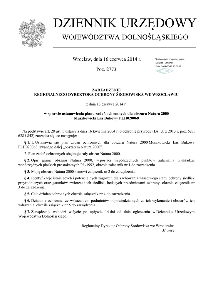 DZIENNIK URZĘDOWY WOJEWÓDZTWA DOLNOŚLĄSKIEGO Wrocław, dnia 16 czerwca 2014 r. Elektronicznie podpisany przez: Matylda Furmanek Poz. 2773 Data: 2014-06-16 15:01:19 ZARZĄDZENIE REGIONALNEGO DYREKTORA OCHRONY ŚRODOWISKA WE WROCŁAWIU z dnia 13 czerwca 2014 r. w sprawie ustanowienia planu zadań ochronnych dla obszaru Natura 2000 Muszkowicki Las Bukowy PLH020068 Na podstawie art. 28 ust. 5 ustawy z dnia 16 kwietnia 2004 r. o ochronie przyrody (Dz. U. z 2013 r. poz. 627, 628 i 842) zarządza się, co następuje: § 1. 1. Ustanawia się plan zadań ochronnych dla obszaru Natura 2000 Muszkowicki Las Bukowy PLH020068, zwanego dalej „obszarem Natura 2000”. 2. Plan zadań ochronnych obejmuje cały obszar Natura 2000. § 2. Opis granic obszaru Natura 2000, w postaci współrzędnych punktów załamania w układzie współrzędnych płaskich prostokątnych PL-1992, określa załącznik nr 1 do zarządzenia. § 3. Mapę obszaru Natura 2000 stanowi załącznik nr 2 do zarządzenia. § 4. Identyfikację istniejących i potencjalnych zagrożeń dla zachowania właściwego stanu ochrony siedlisk przyrodniczych oraz gatunków zwierząt i ich siedlisk, będących przedmiotami ochrony, określa załącznik nr 3 do zarządzenia. § 5. Cele działań ochronnych określa załącznik nr 4 do zarządzenia. § 6. Działania ochronne, ze wskazaniem podmiotów odpowiedzialnych za ich wykonanie i obszarów ich wdrażania, określa załącznik nr 5 do zarządzenia. § 7. Zarządzenie wchodzi w życie po upływie 14 dni od dnia ogłoszenia w Dzienniku Urzędowym Województwa Dolnośląskiego. Regionalny Dyrektor Ochrony Środowiska we Wrocławiu: M. Jęcz Dziennik Urzędowy Województwa Dolnośląskiego –2– Poz. 2773 Załącznik nr 1 do zarządzenia Regionalnego Dyrektora Ochrony Środowiska we Wrocławiu z dnia 13 czerwca 2014 r. Opis granic obszaru Natura 2000 Muszkowicki Las Bukowy PLH020068 w postaci współrzędnych punktów załamania w układzie współrzędnych płaskich prostokątnych PL-1992. Lp. X Y Lp. X Y Lp. X Y Lp. X Y 1 310724,15 355564,06 18 309980,43 355278,60 35 309061,31 354272,65 52 309414,68 352709,12 2 310689,75 355613,06 19 309999,34 355221,86 36 309056,15 354227,94 53 309650,27 352532,00 3 310675,14 355657,77 20 309923,68 354986,28 37 309046,69 354192,69 54 309748,28 352462,36 4 310526,39 355709,36 21 309940,88 354918,35 38 309029,50 354158,30 55 309846,30 352449,89 5 310406,88 355742,03 22 309933,14 354877,08 39 309001,55 354115,31 56 309847,16 352408,19 6 310347,56 355751,49 23 309850,60 354613,99 40 309124,93 353921,85 57 309872,95 352406,47 7 310342,40 355766,97 24 309567,73 354663,85 41 309214,78 353820,83 58 309875,53 352424,09 8 310295,97 355783,30 25 309502,38 354667,29 42 309492,06 353617,92 59 309888,43 352427,96 9 310214,29 355801,36 26 309268,52 354704,26 43 309484,76 353458,85 60 309900,04 352427,53 10 310207,41 355815,97 27 309218,65 354718,88 44 309609,43 353304,09 61 309913,36 352422,81 11 310156,68 355820,27 28 309150,73 354718,02 45 309541,50 353210,37 62 309921,96 352430,11 12 310124,01 355802,22 29 309131,81 354553,80 46 309544,08 353192,75 63 309950,76 352436,13 13 310093,92 355767,83 30 309031,22 354523,71 47 309514,85 353169,10 64 309959,79 352487,72 14 310061,25 355767,83 31 309032,08 354447,19 48 309496,79 353149,33 65 309963,66 352608,95 15 310068,12 355595,87 32 309038,95 354399,90 49 309474,87 353117,95 66 309963,23 352702,24 16 310004,50 355315,58 33 309049,27 354337,99 50 309310,65 352998,01 67 309961,94 352727,60 17 309995,90 355291,50 34 309057,87 354302,74 51 309481,75 352843,24 68 309953,34 352766,72 Dziennik Urzędowy Województwa Dolnośląskiego –3– Lp. X Y Lp. X Y 69 310083,17 352779,19 94 310148,95 354552,94 70 310178,18 352792,95 95 310253,84 354862,47 71 310193,22 352691,49 96 310396,57 355091,17 72 310206,12 352663,55 97 310338,96 355141,90 73 310241,37 352628,73 98 310442,13 355236,47 74 310304,14 352639,47 99 310422,36 355245,93 75 310277,05 352716,85 100 310412,62 355267,23 76 310240,94 352805,84 101 310389,91 355275,41 77 310214,29 352883,65 102 310424,94 355307,84 78 310185,92 352970,06 103 310632,15 355418,75 79 310173,88 353029,39 104 310709,53 355504,73 80 310159,26 353083,56 105 310724,15 355564,06 81 310002,78 353167,81 82 309996,76 353242,62 83 309989,88 353278,73 84 309980,43 353308,82 85 309959,79 353354,39 86 309925,40 353417,15 87 309900,47 353457,56 88 309891,87 353487,66 89 309883,27 353574,50 90 309871,23 353727,54 91 309961,51 353971,72 92 310018,26 354142,82 93 310104,24 354421,39 Poz. 2773 Dziennik Urzędowy Województwa Dolnośląskiego –4– Poz. 2773 Załącznik nr 2 do zarządzenia Regionalnego Dyrektora Ochrony Środowiska we Wrocławiu z dnia 13 czerwca 2014 r. Mapa obszaru Natura 2000 Muszkowicki Las Bukowy PLH020068. Dziennik Urzędowy Województwa Dolnośląskiego –5– Poz. 2773 Załącznik nr 3 do zarządzenia Regionalnego Dyrektora Ochrony Środowiska we Wrocławiu z dnia 13 czerwca 2014 r. Identyfikacja istniejących i potencjalnych zagrożeń dla zachowania właściwego stanu ochrony siedlisk przyrodniczych oraz gatunków zwierząt i ich siedlisk będących przedmiotami ochrony. Przedmiot ochrony *7220 Źródliska wapienne ze zbiorowiskami Cratoneurion commutati Zagrożenia Opis zagrożenia Zagrożenia istniejące: J02.07.02 Pobór wód Dwa stanowiska źródlisk zlokalizowane w granicach rezerwatu Muszkowicki Las Bukowy położone są w podziemnych na potrzeby bezpośrednim sąsiedztwie ujęcia wody dla wsi Muszkowice. Pobór wody na cele bytowe mieszkańców wsi, publicznego zaopatrzenia powoduje spadek poziomu wód gruntowych, co powoduje osuszanie siedliska. w wodę J03.01 Zmniejszenie lub utrata określonych cech siedliska Źródliska wapienne są bardzo wrażliwymi podmokłymi siedliskami, wobec czego prowadzenie wszelkich prac leśnych w miejscach, gdzie zostało stwierdzono występowanie płatów siedliska, powoduje niszczenie delikatnej struktury siedliska. I02 Problematyczne gatunki rod