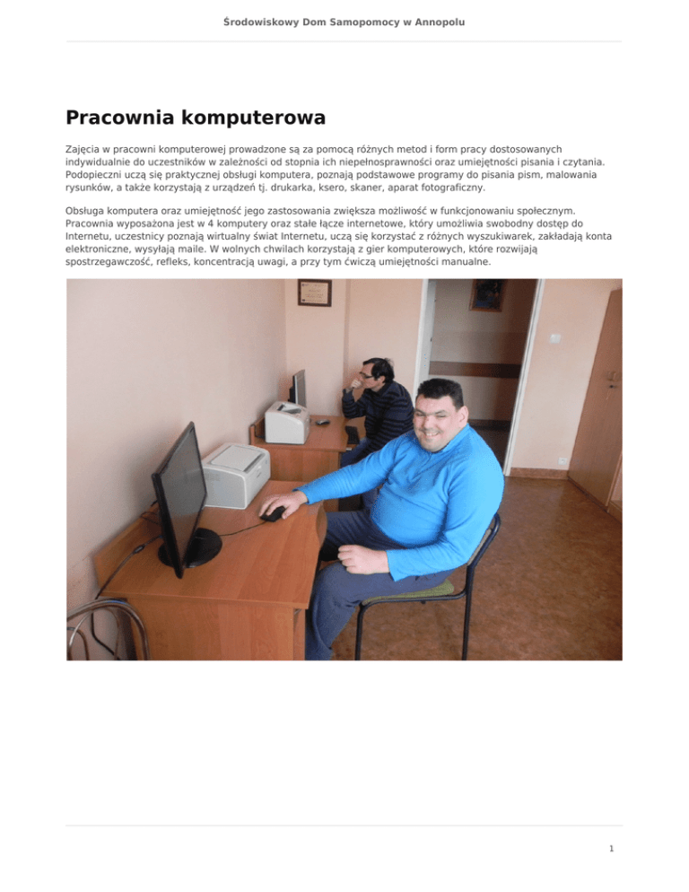 Środowiskowy Dom Samopomocy w Annopolu Pracownia komputerowa Zajęcia w pracowni komputerowej prowadzone są za pomocą różnych metod i form pracy dostosowanych indywidualnie do uczestników w zależności od stopnia ich niepełnosprawności oraz umiejętności pisania i czytania. Podopieczni uczą się praktycznej obsługi komputera, poznają podstawowe programy do pisania pism, malowania rysunków, a także korzystają z urządzeń tj. drukarka, ksero, skaner, aparat fotograficzny. Obsługa komputera oraz umiejętność jego zastosowania zwiększa możliwość w funkcjonowaniu społecznym. Pracownia wyposażona jest w 4 komputery oraz stałe łącze internetowe, który umożliwia swobodny dostęp do Internetu, uczestnicy poznają wirtualny świat Internetu, uczą się korzystać z różnych wyszukiwarek, zakładają konta elektroniczne, wysyłają maile. W wolnych chwilach korzystają z gier komputerowych, które rozwijają spostrzegawczość, refleks, koncentracją uwagi, a przy tym ćwiczą umiejętności manualne. 1 Środowiskowy Dom Samopomocy w Annopolu 2 Środowiskowy Dom Samopomocy w Annopolu 3