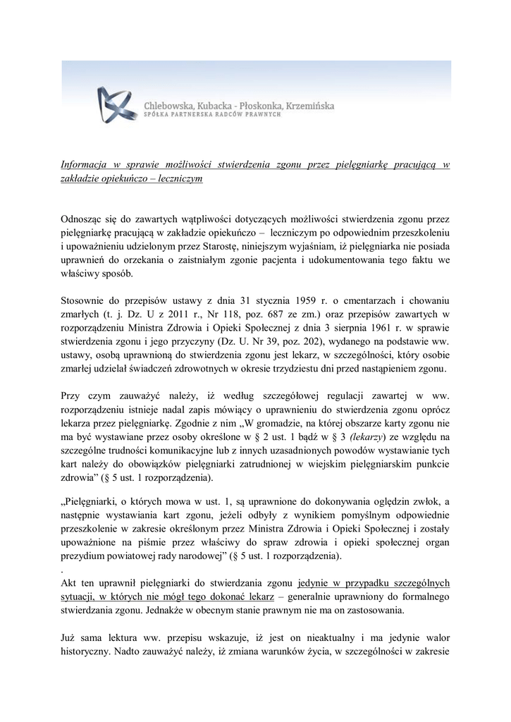 Informacja w sprawie możliwości stwierdzenia zgonu przez pielęgniarkę pracującą w zakładzie opiekuńczo – leczniczym Odnosząc się do zawartych wątpliwości dotyczących możliwości stwierdzenia zgonu przez pielęgniarkę pracującą w zakładzie opiekuńczo – leczniczym po odpowiednim przeszkoleniu i upoważnieniu udzielonym przez Starostę, niniejszym wyjaśniam, iż pielęgniarka nie posiada uprawnień do orzekania o zaistniałym zgonie pacjenta i udokumentowania tego faktu we właściwy sposób. Stosownie do przepisów ustawy z dnia 31 stycznia 1959 r. o cmentarzach i chowaniu zmarłych (t. j. Dz. U z 2011 r., Nr 118, poz. 687 ze zm.) oraz przepisów zawartych w rozporządzeniu Ministra Zdrowia i Opieki Społecznej z dnia 3 sierpnia 1961 r. w sprawie stwierdzenia zgonu i jego przyczyny (Dz. U. Nr 39, poz. 202), wydanego na podstawie ww. ustawy, osobą uprawnioną do stwierdzenia zgonu jest lekarz, w szczególności, który osobie zmarłej udzielał świadczeń zdrowotnych w okresie trzydziestu dni przed nastąpieniem zgonu. Przy czym zauważyć należy, iż według szczegółowej regulacji zawartej w ww. rozporządzeniu istnieje nadal zapis mówiący o uprawnieniu do stwierdzenia zgonu oprócz lekarza przez pielęgniarkę. Zgodnie z nim „W gromadzie, na której obszarze karty zgonu nie ma być wystawiane przez osoby określone w § 2 ust. 1 bądź w § 3 (lekarzy) ze względu na szczególne trudności komunikacyjne lub z innych uzasadnionych powodów wystawianie tych kart należy do obowiązków pielęgniarki zatrudnionej w wiejskim pielęgniarskim punkcie zdrowia” (§ 5 ust. 1 rozporządzenia). „Pielęgniarki, o których mowa w ust. 1, są uprawnione do dokonywania oględzin zwłok, a następnie wystawiania kart zgonu, jeżeli odbyły z wynikiem pomyślnym odpowiednie przeszkolenie w zakresie określonym przez Ministra Zdrowia i Opieki Społecznej i zostały upoważnione na piśmie przez właściwy do spraw zdrowia i opieki społecznej organ prezydium powiatowej rady narodowej” (§ 5 ust. 1 rozporządzenia). . Akt ten uprawnił pielęgniarki do stwierdzania zgonu jedynie w przypadku szczególnych sytuacji, w których nie mógł tego dokonać lekarz – generalnie uprawniony do formalnego stwierdzania zgonu. Jednakże w obecnym stanie prawnym nie ma on zastosowania. Już sama lektura ww. przepisu wskazuje, iż jest on nieaktualny i ma jedynie walor historyczny. Nadto zauważyć należy, iż zmiana warunków życia, w szczególności w zakresie łatwości przemieszczania się i możliwości przybycia lekarza sprawia, iż przepis ten nie odpowiadam dzisiejszym realiom. Także rozporządzenie Ministra Zdrowia z dnia 7 listopada 2007 r. w sprawie rodzaju i zakresu świadczeń zapobiegawczych, diagnostycznych, leczniczych i rehabilitacyjnych udzielanych przez pielęgniarkę albo położną samodzielnie bez zlecenia lekarskiego (Dz. U. Nr 210, poz. 1540) nie uprawnia pielęgniarek do formalnego stwierdzenia zgonu i wystawienia kart zgonu.