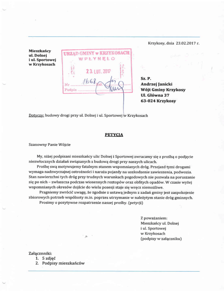 Podpisy mieszkaric6w ul. Dolnej i ul. Sportowej w Krzykosach