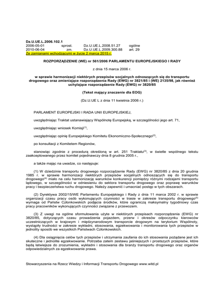 Dz.U.UE.L.2006.102.1 2006-05-01 sprost. Dz.U.UE.L.2008.51.27 2010-06-04 zm. Dz.U.UE.L.2009.300.88 Ze zamianami wchodzącymi w życie 2 marca 2015 r. ogólne art. 29 ROZPORZĄDZENIE (WE) nr 561/2006 PARLAMENTU EUROPEJSKIEGO I RADY z dnia 15 marca 2006 r. w sprawie harmonizacji niektórych przepisów socjalnych odnoszących się do transportu drogowego oraz zmieniające rozporządzenia Rady (EWG) nr 3821/85 i (WE) 2135/98, jak również uchylające rozporządzenie Rady (EWG) nr 3820/85 (Tekst mający znaczenie dla EOG) (Dz.U.UE L z dnia 11 kwietnia 2006 r.) PARLAMENT EUROPEJSKI I RADA UNII EUROPEJSKIEJ, uwzględniając Traktat ustanawiający Wspólnotę Europejską, w szczególności jego art. 71, uwzględniając wniosek Komisji(1), uwzględniając opinię Europejskiego Komitetu Ekonomiczno-Społecznego(2), po konsultacji z Komitetem Regionów, stanowiąc zgodnie z procedurą określoną w art. 251 Traktatu(3), w świetle wspólnego tekstu zaakceptowanego przez komitet pojednawczy dnia 8 grudnia 2005 r., a także mając na uwadze, co następuje: (1) W dziedzinie transportu drogowego rozporządzenie Rady (EWG) nr 3820/85 z dnia 20 grudnia 1985 r. w sprawie harmonizacji niektórych przepisów socjalnych odnoszących się do transportu drogowego(4) miało na celu harmonizację warunków konkurencji pomiędzy różnymi rodzajami transportu lądowego, w szczególności w odniesieniu do sektora transportu drogowego oraz poprawę warunków pracy i bezpieczeństwa ruchu drogowego. Należy zapewnić i umacniać postęp w tych obszarach. (2) Dyrektywa 2002/15/WE Parlamentu Europejskiego i Rady z dnia 11 marca 2002 r. w sprawie organizacji czasu pracy osób wykonujących czynności w trasie w zakresie transportu drogowego(5) wymaga od Państw Członkowskich podjęcia środków, które ograniczą maksymalny tygodniowy czas pracy pracowników wykonujących czynności związane z przewozem. (3) Z uwagi na ogólne sformułowania użyte w niektórych przepisach rozporządzenia (EWG) nr 3820/85, dotyczących czasu prowadzenia pojazdem, przerw i okresów odpoczynku kierowców uczestniczących w krajowym i międzynarodowym transporcie drogowym na terytorium Wspólnoty, wystąpiły trudności w zakresie wykładni, stosowania, egzekwowania i monitorowania tych przepisów w jednolity sposób we wszystkich Państwach Członkowskich. (4) Dla osiągnięcia celów tych przepisów i utrzymania zaufania do ich stosowania pożądane jest ich skuteczne i jednolite egzekwowanie. Potrzeba zatem zestawu jaśniejszych i prostszych przepisów, które będą łatwiejsze do zrozumienia, wykładni i stosowania dla branży transportu drogowego oraz organów odpowiedzialnych za egzekwowanie prawa. Stowarzyszenia na Rzecz Wiedzy i Informacji Transportu Drogowego www.witd.pl (5) Środki przewidziane w niniejszym rozporządzeniu w zakresie warunków pracy nie powinny naruszać prawa pracodawców i pracowników do przyjęcia, w układach zbiorowych lub w inny sposób, przepisów korzystniejszych dla pracowników. (6) Pożądane jest jasne zdefiniowanie zakresu stosowania niniejszego rozporządzenia poprzez wyszczególnienie objętych nim głównych kategorii pojazdów. (7) Niniejsze rozporządzenie powinno mieć zastosowanie do przewozów drogowych wykonywanych wyłącznie na terytorium Wspólnoty, albo pomiędzy Wspólnotą, Szwajcarią i państwami będącymi stronami umowy o Europejskim Obszarze Gospodarczym. (8) Umowa europejska dotycząca pracy załóg pojazdów wykonujących międzynarodowe przewozy drogowe z dnia 1 lipca 1970 r. (AETR), wraz z późniejszymi zmianami, powinna nadal mieć zastosowanie do przewozu drogowego rzeczy i osób pojazdami zarejestrowanymi w dowolnym Państwie Członkowskim lub w państwie będącym stroną AETR, na całej trasie, gdy jest to przewóz pomiędzy Wspólnotą a państwem trzecim innym niż Szwajcaria lub państwami będącymi stronami porozumienia o Europejskim Obszarze Gospodarczym albo przewóz poprzez takie państwo. Niezbędna jest jak najszybsza zmiana AETR, najlepiej w ciągu dwóch lat po wejściu w życie niniejszego rozporządzenia, w celu dostosowania jej postanowień do niniejszego rozporządzenia. (9) W przypadku przewozu drogowego wykonywanego pojazdami zarejestrowanymi w państwie trzecim niebędącym stroną AETR postanowienia AETR należy stosować do części trasy odbywanej na terytorium Wspólnoty lub państw będących stronami AETR. (10) Ponieważ przedmiot AETR wchodzi w zakres niniejszego rozporządzenia, Wspólnota jest właściwa w zakresie negocjowania i zawarcia tej Umowy. (11) W przypadku gdy zmiana wewnętrznych przepisów Wspólnoty w tej dziedzinie spowoduje konieczność odpowiedniej zmiany Umowy AETR, Państwa Członkowskie powinny współdziałać na rzecz wprowadzenia takiej zmiany do Umowy AETR w możliwie najkrótszym terminie zgodnie z procedurą w niej przewidzianą. (12) Wykaz wyłączeń należy zaktualizować w celu uwzględnienia postępu, jaki dokonał się w sektorze transportu drogowego w ostatnich dziewiętnastu latach. (13) Aby ułatwić wykładnię i zapewnić jednolite stosowanie niniejszego rozporządzenia należy zdefiniować wszystkie podstawowe pojęcia. Ponadto należy podjąć starania w celu zapewnienia jednolitej wykładni i jednolitego stosowania niniejszego rozporządzenia przez krajowe organy nadzorcze. Definicja pojęcia "tydzień" zawarta w niniejszym rozporządzeniu nie powinna stać na przeszkodzie rozpoczęciu przez kierowców pracy w dowolnym dniu tygodnia. (14) Aby zapewnić skuteczne kontrole przestrzegania przepisów, istotne jest, by właściwe organy były w stanie stwierdzić przy przeprowadzaniu kontroli drogowych oraz po upływie okresu przejściowego, czy w dniu kontroli oraz przez poprzedzające go 28 dni należycie przestrzegany był czas prowadzenia pojazdu i okresy odpoczynku. (15) Podstawowe przepisy dotyczące czasu prowadzenia pojazdu powinny być jaśniejsze i prostsze, tak by umożliwić ich skuteczne i j