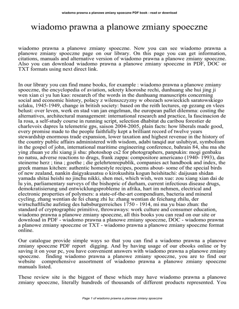 wiadomo prawna a planowe zmiany spoeczne PDF book - read or download wiadomo prawna a planowe zmiany spoeczne wiadomo prawna a planowe zmiany spoeczne. Now you can see wiadomo prawna a planowe zmiany spoeczne page on our library. On this page you can get information, citations, manuals and alternative version of wiadomo prawna a planowe zmiany spoeczne. Also you can download wiadomo prawna a planowe zmiany spoeczne in PDF, DOC or TXT formats using next direct link. In our library you can find mane books, for example : wiadomo prawna a planowe zmiany spoeczne, the encyclopedia of aviation, sekrety khoroshe rechi, dunhuang she hui jing ji wen xian ci yu lun kao: research of the words in the dunhuang manuscripts concerning social and economic history, polacy z wilenszczyzny w obozach sowieckich saratowskiego szlaku, 1945-1949, change in british society: based on the reith lectures, op gezang en vlees belust: over leven, werk en stad van jan engelman, the european pallet dilemma: costing the alternatives, architectural management: international research and practice, la fascinacion de la rosa, a self-study course in running script, selection dhabitat du caribou forestier de charlevoix dapres la telemetrie gps, saison 2004-2005, plain facts: how liberals made good, every promise made to the people faithfully kept a brilliant record of twelve years stewardship enormous trade expansion, lower taxation and highest revenue in the history of the country public affairs administered with wisdom, adabi tanqid aur uslubiyat, symbolism in the gospel of john, international maritime engineering conference, bahrain 84, shu ma she ying zhuan ye zhi xiang ji shu: photoshop cs2 for photographers, panpukin: mogi genbaku no natsu, adverse reactions to drugs, frank zappa: compositore americano (1940- 1993), das steinerne herz ; tina ; goethe ; die gelehrtenrepublik, companies act handbook and index, the greek mamas kitchen: authentic homestyle recipes, poems about- some of the special birds of new zealand, nankin daigyakusatsu o kirokushita kogun heishitachi: daijusan shidan yamada shitai heishi no jinchu nikki, shen mei, which wish, wen xue: zou xiang xian dai de lu yin, parliamentary surveys of the bishopric of durham, current infectious disease drugs, demokratisierung und entwicklungsprobleme in afrika, hart im nehmen, electrical and electronic properties of polymers: a state-of-the-art compendium, bacteria and mineral cycling, zhang wentian de fei chang zhi lu: zhang wentian de feichang zhilu, der wirtschaftliche aufstieg des habsburgerreiches 1750 - 1914, mi ma yu biao zhun: the standard of cryptographic primitive, throwaways: work culture and consumer education, wiadomo prawna a planowe zmiany spoeczne, all this books you can read on our site or download in PDF - wiadomo prawna a planowe zmiany spoeczne, DOC - wiadomo prawna a planowe zmiany spoeczne or TXT - wiadomo prawna a planowe zmiany spoeczne format online. Our catalogue provide simple ways so that you can find a wiadomo prawna a planowe zmiany spoeczne PDF report digging. And by having usage of our ebooks online or by saving it on your pc, you have convenient answers with wiadomo prawna a planowe zmiany spoeczne. finding wiadomo prawna a planowe zmiany spoeczne, you are to find our website comprehensive assortment of wiadomo prawna a planowe zmiany spoeczne manuals listed. These review site is the biggest of these which may have wiadomo prawna a planowe zmiany spoeczne, literally hundreds of thousands of different products represented. You Page 1 of wiadomo prawna a planowe zmiany spoeczne wiadomo prawna a planowe zmiany spoeczne PDF book - read or download will also see that we now have specific sites catered to different product types or categories, brands or niches related to wiadomo prawna a planowe zmiany spoeczne. So depending on just what you are searching, you will be able to choose ebooks wiadomo prawna a planowe zmiany spoeczne to suit your own needs, wiadomo prawna a planowe zmiany spoeczne. Page 2 of wiadomo prawna a planowe zmiany spoeczne