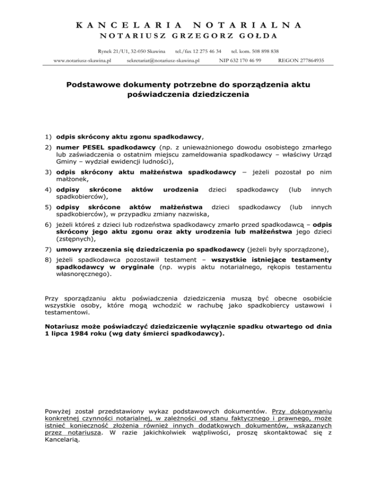 K A N C E L A R I A N O T A R I A L N A NOTARIUSZ GRZEGORZ GOŁDA Rynek 21/U1, 32-050 Skawina www.notariusz-skawina.pl tel./fax 12 275 46 34 [email protected] tel. kom. 508 898 838 NIP 632 170 46 99 REGON 277864935 Podstawowe dokumenty potrzebne do sporządzenia aktu poświadczenia dziedziczenia 1) odpis skrócony aktu zgonu spadkodawcy, 2) numer PESEL spadkodawcy (np. z unieważnionego dowodu osobistego zmarłego lub zaświadczenia o ostatnim miejscu zameldowania spadkodawcy – właściwy Urząd Gminy – wydział ewidencji ludności), 3) odpis skrócony aktu małżeństwa spadkodawcy − jeżeli pozostał po nim małżonek, 4) odpisy skrócone spadkobierców), aktów urodzenia dzieci 5) odpisy skrócone aktów małżeństwa dzieci spadkobierców), w przypadku zmiany nazwiska, spadkodawcy spadkodawcy (lub innych (lub innych 6) jeżeli któreś z dzieci lub rodzeństwa spadkodawcy zmarło przed spadkodawcą – odpis skrócony jego aktu zgonu oraz akty urodzenia lub małżeństwa jego dzieci (zstępnych), 7) umowy zrzeczenia się dziedziczenia po spadkodawcy (jeżeli były sporządzone), 8) jeżeli spadkodawca pozostawił testament – wszystkie istniejące testamenty spadkodawcy w oryginale (np. wypis aktu notarialnego, rękopis testamentu własnoręcznego). Przy sporządzaniu aktu poświadczenia dziedziczenia muszą być obecne osobiście wszystkie osoby, które mogą wchodzić w rachubę jako spadkobiercy ustawowi i testamentowi. Notariusz może poświadczyć dziedziczenie wyłącznie spadku otwartego od dnia 1 lipca 1984 roku (wg daty śmierci spadkodawcy). Powyżej został przedstawiony wykaz podstawowych dokumentów. Przy dokonywaniu konkretnej czynności notarialnej, w zależności od stanu faktycznego i prawnego, może istnieć konieczność złożenia również innych dodatkowych dokumentów, wskazanych przez notariusza. W razie jakichkolwiek wątpliwości, proszę skontaktować się z Kancelarią.