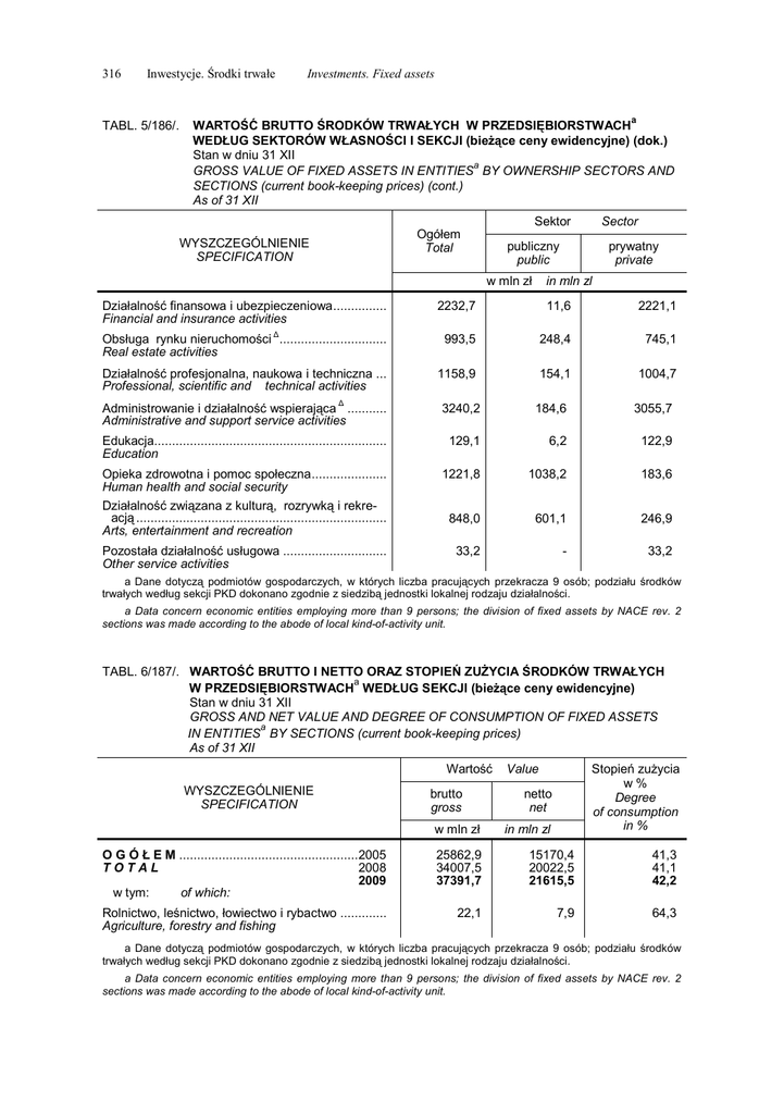 316 Inwestycje. Środki trwałe TABL. 5/186/. Investments. Fixed assets a WARTOŚĆ BRUTTO ŚRODKÓW TRWAŁYCH W PRZEDSIĘBIORSTWACH WEDŁUG SEKTORÓW WŁASNOŚCI I SEKCJI (bieżące ceny ewidencyjne) (dok.) Stan w dniu 31 XII a GROSS VALUE OF FIXED ASSETS IN ENTITIES BY OWNERSHIP SECTORS AND SECTIONS (current book-keeping prices) (cont.) As of 31 XII WYSZCZEGÓLNIENIE SPECIFICATION Sektor Ogółem Total Sector publiczny public w mln zł prywatny private in mln zl Działalność finansowa i ubezpieczeniowa............... Financial and insurance activities 2232,7 11,6 2221,1 Obsługa rynku nieruchomości Δ .............................. Real estate activities 993,5 248,4 745,1 Działalność profesjonalna, naukowa i techniczna ... Professional, scientific and technical activities 1158,9 154,1 1004,7 Administrowanie i działalność wspierająca Δ ........... Administrative and support service activities 3240,2 184,6 3055,7 Edukacja................................................................. Education 129,1 6,2 122,9 Opieka zdrowotna i pomoc społeczna..................... Human health and social security Działalność związana z kulturą, rozrywką i rekreacją ...................................................................... Arts, entertainment and recreation 1221,8 1038,2 183,6 848,0 601,1 246,9 Pozostała działalność usługowa ............................. Other service activities 33,2 - 33,2 a Dane dotyczą podmiotów gospodarczych, w których liczba pracujących przekracza 9 osób; podziału środków trwałych według sekcji PKD dokonano zgodnie z siedzibą jednostki lokalnej rodzaju działalności. a Data concern economic entities employing more than 9 persons; the division of fixed assets by NACE rev. 2 sections was made according to the abode of local kind-of-activity unit. TABL. 6/187/. WARTOŚĆ BRUTTO I NETTO ORAZ STOPIEŃ ZUŻYCIA ŚRODKÓW TRWAŁYCH a W PRZEDSIĘBIORSTWACH WEDŁUG SEKCJI (bieżące ceny ewidencyjne) Stan w dniu 31 XII GROSS AND NET VALUE AND DEGREE OF CONSUMPTION OF FIXED ASSETS a IN ENTITIES BY SECTIONS (current book-keeping prices) As of 31 XII Wartość WYSZCZEGÓLNIENIE SPECIFICATION brutto gross w mln zł Stopień zużycia w% Degree of consumption in % Value netto net in mln zl O G Ó Ł E M .................................................. 2005 TOTAL 2008 2009 w tym: of which: 25862,9 34007,5 37391,7 15170,4 20022,5 21615,5 41,3 41,1 42,2 Rolnictwo, leśnictwo, łowiectwo i rybactwo ............. Agriculture, forestry and fishing 22,1 7,9 64,3 a Dane dotyczą podmiotów gospodarczych, w których liczba pracujących przekracza 9 osób; podziału środków trwałych według sekcji PKD dokonano zgodnie z siedzibą jednostki lokalnej rodzaju działalności. a Data concern economic entities employing more than 9 persons; the division of fixed assets by NACE rev. 2 sections was made according to the abode of local kind-of-activity unit. Inwestycje. Środki trwałe Investments. Fixed assets 317 TABL. 6/187/. WARTOŚĆ BRUTTO I NETTO ORAZ STOPIEŃ ZUŻYCIA ŚRODKÓW TRWAŁYCH a W PRZEDSIĘBIORSTWACH WEDŁUG SEKCJI (bieżące ceny ewidencyjne) (cd.) Stan w dniu 31 XII GROSS AND NET VALUE AND DEGREE OF CONSUMPTION OF FIXED ASSETS a IN ENTITIES BY SECTIONS (current book-keeping prices) (cont.) As of 31 XII Wartość WYSZCZEGÓLNIENIE SPECIFICATION brutto gross w mln zł Przemysł ................................................................ Industry górnictwo i wydobywanie ..................................... mining and quarrying przetwórstwo przemysłowe ................................. manufacturing Value netto net in mln zl Stopień zużycia w% Degree of consumption in % 17285,7 9740,8 43,6 157,3 78,1 50,4 6155,3 3778,0 38,6 8995,1 4933,4 45,2 1978,0 951,3 51,9 Budownictwo .......................................................... Construction 722,3 362,6 49,8 Handel; naprawa pojazdów samochodowych Δ....... Trade; repair of motor vehicles Δ 4972,9 3447,7 30,7 Transport i gospodarka magazynowa ..................... Transportation and storage 1298,6 666,8 48,7 Zakwaterowanie i gastronomia Δ ............................. Accommodation and catering Δ 1283,6 903,8 29,6 Informacja i komunikacja ........................................ Information and communications 1949,0 711,4 63,5 Działalność finansowa i ubezpieczeniowa............... Financial and insurance activities 2232,7 1000,2 55,2 Obsługa rynku nieruchomości Δ .............................. Real estate activities 993,5 727,2 26,8 Działalność profesjonalna, naukowa i techniczna ... Professional, scientific and technical activities 1158,9 503,3 56,6 wytwarzanie i zaopatrywanie w energię elektryczną, gaz, parę wodną i gorącą wodę Δ .................................................... electricity, gas, steam and air conditioning supply dostawa wody; gospodarowanie ściekami i odpadami; rekultywacja Δ .. water supply; sewerage, waste management and remediation activities Administrowanie i działalność wspierająca Δ ........... Administrative and support service activities 3240,2 2181,8 32,7 a Dane dotyczą podmiotów gospodarczych, w których liczba pracujących przekracza 9 osób; podziału środków trwałych według sekcji PKD dokonano zgodnie z siedzibą jednostki lokalnej rodzaju działalności. a Data concern economic entities employing more than 9 persons; the division of fixed assets by NACE rev. 2 sections was made according to the abode of local kind-of-activity unit. 318 Inwestycje. Środki trwałe Investments. Fixed assets TABL. 6/187/. WARTOŚĆ BRUTTO I NETTO ORAZ STOPIEŃ ZUŻYCIA ŚRODKÓW TRWAŁYCH a W PRZEDSIĘBIORSTWACH WEDŁUG SEKCJI (bieżące ceny ewidencyjne) (dok.) Stan w dniu 31 XII GROSS AND NET VALUE AND DEGREE OF CONSUMPTION OF FIXED ASSETS a IN ENTITIES BY SECTIONS (current book-keeping prices) (cont.) As of 31 XII Wartość WYSZCZEGÓLNIENIE SPECIFICATION brutto gross Stopień zużycia w% Degree of consumption in % Value netto net 