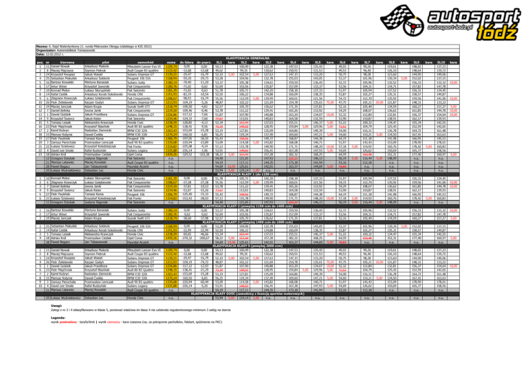Nazwa: 6. Rajd Walentynkowy (1. runda Mistrzostw Okręgu Łódzkiego w KJS 2012) Organizator: Automobilklub Tomaszowski Data: 12.02.2012 r. poz. 1 2 3 4 5 6 7 8 9 10 11 12 13 14 15 16 17 18 19 20 21 22 23 1 2 3 4 5 6 nr 11 8 24 25 16 17 10 14 6 26 19 7 1 9 5 23 2 15 27 3 22 4 18 12 21 28 20 kierowca Daniel Nowak Maciej Majczyna Krzysztof Kwapisz Sebastian Makulski Bartosz Kowalski Artur Winer Konrad Melon Rafał Cieślik Zbigniew Krawczyk Piotr Żelisławski Maciej Janczak Daniel Bylinka Dawid Goździk Krzysztof Świercz Tomasz Lesiak Piotr Majchrzak Kamil Kubryn Mariusz Kotynia Piotr Pauliński Dariusz Pierzchała Łukasz Ścisłowicz David Lee Smale Adrian Król Grzegorz Dziubak Mariusz Latawiec Paweł Bogacz Łukasz Woźniakiewicz pilot Arkadiusz Małecki Szymon Pietruk Jakub Wasiel Arkadiusz Soldecki Martyna Banasiak Krzysztof Jaworski Łukasz Skorupiński Arkadiusz Korab-Sokołowski Łukasz Gołębiewski Kacper Godyń Adam Krupa Iwona Janik Jakub Przedbora Jakub Kister Aleksandra Krawczyk Krzysztof Błaziński Radosław Ziemnicki Dawid Ćwikła Tomasz Kania Przemysław Lemczak Krzysztof Kołodziejczyk Rafał Budzyński Przemysław Cieślak Justyna Stępniak Maciej Kowalski Jan Tabaszewski Sebastian Lec samochód Mitsubishi Lancer Evo VI Audi Coupe B3 quattro Subaru Impreza GT Peugeot 106 S16 Subaru Justy Fiat Cinquecento Fiat Seicento Honda CRX Fiat Cinquecento Subaru Impreza GT Suzuki Swift GTI Fiat Cinquecento Subaru Impreza GT Fiat Seicento Honda Civic Audi 80 B2 quattro BMW E30 320i BMW E30 330i Peugeot 106 Audi 90 B3 quattro Fiat Punto Subaru Legacy Opel Corsa Fiat Seicento Audi Coupe B3 quattro Hyundai Accent Honda Civic suma 1109,74 1122,42 1139,21 1168,94 1180,14 1180,76 1181,39 1191,93 1208,67 1213,93 1218,74 1219,20 1226,86 1234,46 1238,59 1248,15 1263,43 1270,24 1306,79 1330,68 1334,82 1335,88 1439,26 n.u. n.u. n.u. n.u. 10 6 7 9 27 22 12 Konrad Melon Zbigniew Krawczyk Daniel Bylinka Krzysztof Świercz Piotr Pauliński Łukasz Ścisłowicz Grzegorz Dziubak Łukasz Skorupiński Łukasz Gołębiewski Iwona Janik Jakub Kister Tomasz Kania Krzysztof Kołodziejczyk Justyna Stępniak Fiat Seicento Fiat Cinquecento Fiat Cinquecento Fiat Seicento Peugeot 106 Fiat Punto Fiat Seicento 1181,39 1208,67 1219,20 1234,46 1306,79 1334,82 n.u. Martyna Banasiak Krzysztof Jaworski Adam Krupa Subaru Justy Fiat Cinquecento Suzuki Swift GTI 1180,14 1180,76 1218,74 1 2 3 16 Bartosz Kowalski 17 Artur Winer 19 Maciej Janczak 1 2 3 4 25 14 5 18 28 Sebastian Makulski Rafał Cieślik Tomasz Lesiak Adrian Król Paweł Bogacz Arkadiusz Soldecki Arkadiusz Korab-Sokołowski Aleksandra Krawczyk Przemysław Cieślak Jan Tabaszewski Peugeot 106 S16 Honda CRX Honda Civic Opel Corsa Hyundai Accent 1168,94 1191,93 1238,59 1439,26 n.u. 11 8 24 26 1 23 2 15 3 4 21 Daniel Nowak Maciej Majczyna Krzysztof Kwapisz Piotr Żelisławski Dawid Goździk Piotr Majchrzak Kamil Kubryn Mariusz Kotynia Dariusz Pierzchała David Lee Smale Mariusz Latawiec Arkadiusz Małecki Szymon Pietruk Jakub Wasiel Kacper Godyń Jakub Przedbora Krzysztof Błaziński Radosław Ziemnicki Dawid Ćwikła Przemysław Lemczak Rafał Budzyński Maciej Kowalski Mitsubishi Lancer Evo VI Audi Coupe B3 quattro Subaru Impreza GT Subaru Impreza GT Subaru Impreza GT Audi 80 B2 Quattro BMW E30 320i BMW E30 330i Audi 90 B3 quattro Subaru Legacy Audi Coupe B3 quattro 1109,74 1122,42 1139,21 1213,93 1226,86 1248,15 1263,43 1270,24 1330,68 1335,88 n.u. Sebastian Lec Honda Civic 1 2 3 4 5 6 7 8 9 10 20 Łukasz Woźniakiewicz n.u. KLASYFIKACJA GENERALNA SL1 kara SL2 kara SL3 kara SL4 kara 50,13 100,49 122,38 147,53 49,62 99,35 130,62 150,91 52,10 5,00 102,54 5,00 127,63 147,15 53,28 104,96 132,78 155,03 53,37 105,38 134,61 159,50 52,69 103,56 135,87 157,09 51,78 105,71 142,20 158,18 52,50 106,22 134,88 160,09 55,56 112,59 5,00 139,99 160,01 48,87 102,22 121,69 154,78 52,57 105,70 136,62 171,35 53,78 111,22 139,41 165,26 51,87 107,90 140,88 163,20 77,67 113,01 140,83 164,58 53,34 157,44 137,03 155,51 73,30 149,02 128,95 159,84 5,00 53,19 127,81 135,09 164,86 56,25 119,34 137,49 169,60 55,43 158,56 149,72 168,87 53,09 114,58 5,00 143,82 168,08 57,12 115,78 149,90 171,71 53,91 149,02 156,41 167,28 58,22 5,00 157,44 157,28 182,32 54,40 121,65 147,93 237,27 54,19 117,11 144,35 173,18 54,69 10,00 125,61 142,01 163,37 53,94 5,00 124,14 5,00 n.u. n.u. KLASYFIKACJA KLASY 1 (do 1150 ccm) 0,00 0,00 51,78 105,71 142,20 158,18 -27,28 -27,28 55,56 112,59 5,00 139,99 160,01 -37,81 -10,53 53,78 111,22 139,41 165,26 -53,07 -15,26 77,67 113,01 140,83 164,58 -125,40 -72,33 55,43 158,56 149,72 168,87 -153,43 -28,03 57,12 115,78 149,90 171,71 54,40 121,65 147,93 237,27 KLASYFIKACJA KLASY 2 (powyżej 1150 ccm do 1400 ccm) 0,00 0,00 53,37 105,38 134,61 159,50 -0,62 -0,62 52,69 103,56 135,87 157,09 -38,60 -37,98 52,57 105,70 136,62 171,35 KLASYFIKACJA KLASY 3 (powyżej 1400 ccm do 1600 ccm) 0,00 0,00 53,28 104,96 132,78 155,03 -22,99 -22,99 52,50 106,22 134,88 160,09 -69,65 -46,66 53,34 157,44 137,03 155,51 -270,32 -200,67 58,22 5,00 157,44 157,28 182,32 54,69 10,00 125,61 142,01 163,37 KLASYFIKACJA KLASY 5 (powyżej 2000 ccm) 0,00 0,00 50,13 100,49 122,38 147,53 -12,68 -12,68 49,62 99,35 130,62 150,91 -29,47 -16,79 52,10 5,00 102,54 5,00 127,63 147,15 -104,19 -74,72 48,87 102,22 121,69 154,78 -117,12 -12,93 51,87 107,90 140,88 163,20 -138,41 -21,29 73,30 149,02 128,95 159,84 5,00 -153,69 -15,28 53,19 127,81 135,09 164,86 -160,50 -6,81 56,25 119,34 137,49 169,60 -220,94 -60,44 53,09 114,58 5,00 143,82 168,08 -226,14 -5,20 53,91 149,02 156,41 167,28 54,19 117,11 144,35 173,18 KLASYFIKACJA KLASY GOŚĆ (zawodnicy z licencją sportów motorowych) 53,94 5,00 124,14 5,00 n.u. n.u. do lidera 0,00 -12,68 -29,47 -59,20 -70,40 -71,02 -71,65 -82,19 -98,93 -104,19 -109,00 -109,46 -117,12 -124,72 -128,85 -138,41 -153,69 -160,50 -197,05 -220,94 -225,08 -226,14 -329,52 do poprz. 0,00 -12,68 -16,79 -29,73 -11,20 -0,62 -0,63 -10,54 -16,74 -5,26 -4,81 -0,46 -7,66 -7,60 -4,13 -9,56 -15,28 -6,81 -36,55