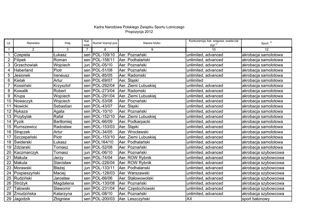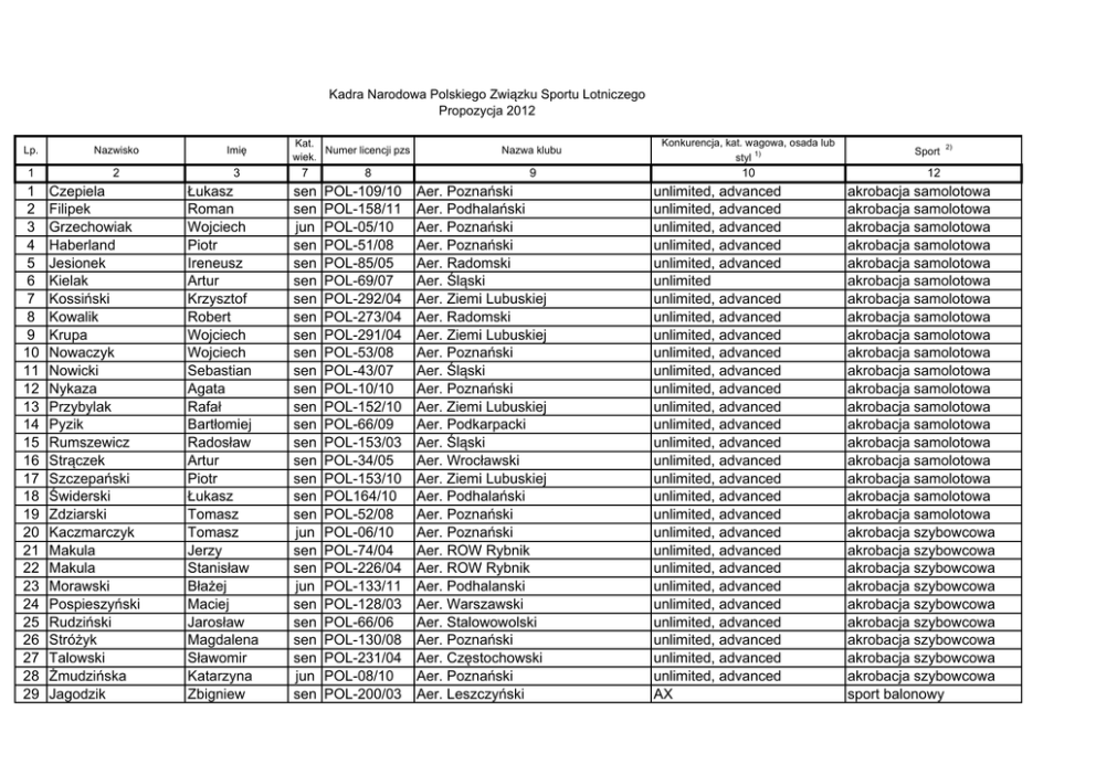 Kadra Narodowa Polskiego Związku Sportu Lotniczego Propozycja 2012 Lp. 1 1 2 3 4 5 6 7 8 9 10 11 12 13 14 15 16 17 18 19 20 21 22 23 24 25 26 27 28 29 Nazwisko 2 Czepiela Filipek Grzechowiak Haberland Jesionek Kielak Kossiński Kowalik Krupa Nowaczyk Nowicki Nykaza Przybylak Pyzik Rumszewicz Strączek Szczepański Świderski Zdziarski Kaczmarczyk Makula Makula Morawski Pospieszyński Rudziński Stróżyk Talowski Żmudzińska Jagodzik Imię 3 Łukasz Roman Wojciech Piotr Ireneusz Artur Krzysztof Robert Wojciech Wojciech Sebastian Agata Rafał Bartłomiej Radosław Artur Piotr Łukasz Tomasz Tomasz Jerzy Stanisław Błażej Maciej Jarosław Magdalena Sławomir Katarzyna Zbigniew Kat. Numer licencji pzs wiek. 7 sen sen jun sen sen sen sen sen sen sen sen sen sen sen sen sen sen sen sen jun sen sen jun sen sen sen sen jun sen 8 POL-109/10 POL-158/11 POL-05/10 POL-51/08 POL-85/05 POL-69/07 POL-292/04 POL-273/04 POL-291/04 POL-53/08 POL-43/07 POL-10/10 POL-152/10 POL-66/09 POL-153/03 POL-34/05 POL-153/10 POL164/10 POL-52/08 POL-06/10 POL-74/04 POL-226/04 POL-133/11 POL-128/03 POL-66/06 POL-130/08 POL-231/04 POL-08/10 POL-200/03 Nazwa klubu 9 Aer. Poznański Aer. Podhalański Aer. Poznański Aer. Poznański Aer. Radomski Aer. Śląski Aer. Ziemi Lubuskiej Aer. Radomski Aer. Ziemi Lubuskiej Aer. Poznański Aer. Śląski Aer. Poznański Aer. Ziemi Lubuskiej Aer. Podkarpacki Aer. Śląski Aer. Wrocławski Aer. Ziemi Lubuskiej Aer. Podhalański Aer. Poznański Aer. Poznański Aer. ROW Rybnik Aer. ROW Rybnik Aer. Podhalanski Aer. Warszawski Aer. Stalowowolski Aer. Poznański Aer. Częstochowski Aer. Poznański Aer. Leszczyński Konkurencja, kat. wagowa, osada lub styl 1) 10 unlimited, advanced unlimited, advanced unlimited, advanced unlimited, advanced unlimited, advanced unlimited unlimited, advanced unlimited, advanced unlimited, advanced unlimited, advanced unlimited, advanced unlimited, advanced unlimited, advanced unlimited, advanced unlimited, advanced unlimited, advanced unlimited, advanced unlimited, advanced unlimited, advanced unlimited, advanced unlimited, advanced unlimited, advanced unlimited, advanced unlimited, advanced unlimited, advanced unlimited, advanced unlimited, advanced unlimited, advanced AX Sport 2) 12 akrobacja samolotowa akrobacja samolotowa akrobacja samolotowa akrobacja samolotowa akrobacja samolotowa akrobacja samolotowa akrobacja samolotowa akrobacja samolotowa akrobacja samolotowa akrobacja samolotowa akrobacja samolotowa akrobacja samolotowa akrobacja samolotowa akrobacja samolotowa akrobacja samolotowa akrobacja samolotowa akrobacja samolotowa akrobacja samolotowa akrobacja samolotowa akrobacja szybowcowa akrobacja szybowcowa akrobacja szybowcowa akrobacja szybowcowa akrobacja szybowcowa akrobacja szybowcowa akrobacja szybowcowa akrobacja szybowcowa akrobacja szybowcowa sport balonowy 30 31 32 33 34 35 36 37 38 39 40 41 42 43 44 45 46 47 48 49 50 51 52 53 54 55 56 57 58 59 60 61 62 63 64 Iwański Nowakowski Jaskólski Zarzycki Dawidziuk Rękas Filus Choma Prawicka Helak Soból Bamberski Dernbach Hawraj Jarmuszczak Jurkiewicz Jurkiewicz Kędzierska Kędzierski Mamona Nawrocki Orwat Ruks Szurgot Tatarczuk Bąk Bernat Bury Ciszkowski Drężek Ficek Furtak Krzyżanowski Malkusz Mańkowski Arkadiusz Bartosz Adam Dariusz Bazyli Mateusz Tomasz Beata Ewa Ewelina Paweł Wojciech Alojzy Robert Mariusz Przemysław Dominika Sylwia Dariusz Wojciech Jakub Henryk Romuald Mieczysław Anna Andrzej Marcin Andrzej Jacek Marian Piotr Marek Grzegorz Andrzej Kamil sen sen sen sen sen jun jun sen sen sen jun sen sen sen sen sen sen sen sen sen sen sen sen sen sen sen sen sen sen sen sen sen sen sen sen POL-86/04 POL-09/03 POL-216/03 POL-134/04 POL-162/04 POL-54/10 POL-41/12 POL-77/06 POL-88/04 POL-35/08 POL-146/08 POL-14/03 POL-116/06 POL-109/05 POL-101/05 POL-115/05 POL-168/08 POL-07/13 POL-69/08 POL-22/07 POL-186/08 POL-11/06 POL-113/05 POL-155/08 POL-164/08 POL-34/12 POL-156/12 POL-52/12 POL-58/12 POL-159/12 POL-68/09 POL-171/11 POL-52/06 POL-360/08 POL-135/08 Aer. Włocławski AX Aer. Włocławski AX Aer. Koniński AX Aer. Łódzki AX Klub Balonowy Białystok AX Aer. Krakowski AX Aer. Krakowski AX Aer. Poznański AX Aer. Leszczyński AX Klub Sportów Balonowych Wrocław AX Aer. Krakowski AX Aer. Dolnośląski sterowce Aer. Warszawski WL1 Aer. Świdnik WL1/WL2 Aer. Poznański AL2/WL2 Aer. Pomorski WL2 Grupa Falco WL2 Aer. Włocławski WL1 Aer. Warszawski AL2 Aer. Ziemi Zamojskiej WL1/WL2/GYR Aer. Włocławski WL1 Wolsztyńskie Stowarzyszenie Lotnicze WL1/WL2/GYR Aer. Poznański WL2 Aer. Włocławski AL2 Aer. Ziemi Zamojskiej AL2 Aer. Częstochowski PF1 Aer. Warszawski PF1 Aer. Warszawski PF1 Aer. Warszawski PF1 Aer. Warszawski PF1 Aer. Krakowski PF1 Aer. Warszawski PF1 Aer. Warszawski PF1 Aer. Warszawski PF1 Aer. Krakowski PF1 sport balonowy sport balonowy sport balonowy sport balonowy sport balonowy sport balonowy sport balonowy sport balonowy sport balonowy sport balonowy sport balonowy sport sterowcowy sport mikrolotowy sport mikrolotowy sport mikrolotowy sport mikrolotowy sport mikrolotowy sport mikrolotowy sport mikrolotowy sport mikrolotowy sport mikrolotowy sport mikrolotowy sport mikrolotowy sport mikrolotowy sport mikrolotowy sport motoparalotniowy sport motoparalotniowy sport motoparalotniowy sport motoparalotniowy sport motoparalotniowy sport motoparalotniowy sport motoparalotniowy sport motoparalotniowy sport motoparalotniowy sport motoparalotniowy 65 66 67 68 69 70 71 72 73 74 75 76 77 78 79 80 81 82 83 84 85 86 87 88 89 90 91 92 93 94 95 96 97 98 99 Pioterczak Piórek Plak Sorn Trzyński Denis Krzysztof Wątroba Źygadło Dembczyński Horbowski Krakowiak Książek Paska Romicki Lejk Balcerzewski Jędrys Kłoss Krupa Krupa Chrząszcz Chrząszcz Darocha Kachaniak Osowski Osowski Radomski Skalik Skrętowicz Sysio Wieczorek Wieczorek Bartkowiak Bill Marek Adam Emilia Mariusz Piotr Marta Tomasz Ireneusz Ryszard Tomasz Maciej Marcin Adam Adam Krzysztof Patrycja Maria Jarosł