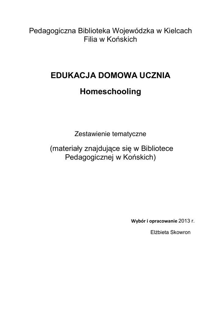 Pedagogiczna Biblioteka Wojewódzka w Kielcach Filia w Końskich EDUKACJA DOMOWA UCZNIA Homeschooling Zestawienie tematyczne (materiały znajdujące się w Bibliotece Pedagogicznej w Końskich) Wybór i opracowanie 2013 r. Elżbieta Skowron Edukacja domowa [ang. Homeschooling] to organizacja procesu kształcenia dzieci przez rodziców w sposób niezależny od systemu szkolnego. Jest alternatywną formą spełniania obowiązku szkolnego. W Polsce mało znaną zarówno wśród pedagogów jak i rodziców. Polacy przywykli do tradycyjnego modelu szkoły. I mimo wielu krytycznych opinii wobec edukacji, niewiele jest odważnych działań innowacyjnych. Tymczasem w wielu krajach funkcjonuje bardzo dynamiczny ruch społeczny skupiający rodziców, którzy sami pragną kierować edukacją swoich dzieci z pominięciem instytucji nazwanej „szkołą”. Niniejsze zestawienie tematyczne przybliża tę tematykę. Zawiera pozycje zwarte i czasopisma a także wykaz ważniejszych stron internetowych ułożone w porządku alfabetycznym., które znajdują się w PBW – Filii Końskie. Wszystkie artykuły z czasopism znaleźć można w czytelni a książki zawierają sygnaturę z numerem danej pozycji. Książki 1. Holt, John Caldwell : Zamiast edukacji : warunki do uczenia się przez działanie. – Kraków : Oficyna Wydawnicza „Impuls”, 2007. – 300 s. – Bibliogr. Sygn. 46735 Wypożyczalnia 2. Pedagogika wczesnoszkolna : dyskursy, problemy, rozwiązania / red. nauk. Dorota Klus-Stańska, Maria Szczepska-Pustkowska . - Warszawa : Wydawnictwo Akademickie i Profesjonalne, 2009. – Bibliogr. (Pedagogika wobec współczesności) S. 206-207 : Homeschooling S. 215-217 : Edukacja bez udziału szkoły ; S.238,300 : Edukacja domowa Sygn.47132 Czytelnia Sygn. 47133 Wypożyczalnia Artykuły z czasopism 3. Bartosik, Paweł : Edukacja domowa własnych dzieci / Paweł Bartosik // „Edukacja i Dialog”. - 2009, nr 2, s.18-27 4. Fazlagić, Jan A. : Tato i mama - moi nauczyciele / Jan A. Fazlagić // „Edukacja i Dialog”. - 2008, nr 2, s.34-35 5. Jakubiak, Krzysztof : Oświeceniowe źródła i inspiracje polskiej myśli pedagogicznej o wychowaniu rodzinnym dzieci w XIX wieku / Krzysztof Jakubiak // „Kwartalnik Pedagogiczny”. - 2006 , nr 2 , s. 75-89 6. Kargul, Józef : Rodzina jako podmiot całożyciowej edukacji dorosłych / Józef Kargul // „ Chowanna”. 2005, nr 2, s.50-55 7. Leżańska, Wiesława : Nauczanie domowe w polskim systemie edukacyjnym / Wiesława Leżańska // „Wychowanie w Przedszkolu”. - 1996, nr 2 , s. 83-90 8. Makowska, Jolanta. [Edukacja domowa - recenzja] / Jolanta Makowska. // „Problemy Opiekuńczo-Wychowawcze”. - 2004, nr 8, s. 61-63 9. Marciniak, Zbigniew : Edukacja domowa nie jest absurdem / Zbigniew Marciniak; rozm. przepr. Beata Igielska // „Problemy Opiekuńczo-Wychowawcze”. - 2008, nr 10, s.7-10 10. Rudkowska, Joanna : Szkoły domowe w USA / Joanna Rudkowska, Natalia Banach // „ Edukacja”. - 2002, nr 1, dod. s.28-30 11. Sawiński, Julian P : Co z edukacją domową w XXI wieku? / Julian P. Sawiński // „Nowa Szkoła”. - 2008, nr10, s.26-29 12. Sawiński, Julian Piotr. : Edukacja domowa w XXI wieku / Julian Piotr Sawiński. // „Nowa Szkoła”. – 2012, nr 2, s. 10-13 13. Siwiec, Jagoda : Edukacja domowa – zapis jednego spotkania / Jagoda Siwiec // „Problemy Opiekuńczo-Wychowawcze”. – 2013, nr 7, s. 7-13 14. Sobecki, Władysław : Domowa szkoła / Władysław Sobecki // „Nowa Szkoła”. 2001, nr 3, s.49 15. Wallett, Steven : Edukacja domowa w USA / Steven Wallett // „Nowa Szkoła”. 2006, nr 7, s. 48-54 16. Wróbel-Lipowa, Krystyna : Nauczyciele domowi dzieci ziemiaństwa polskiego w XIX wieku / Krystyna Wróbel-Lipowa // „Wiadomości Historyczne”. - 2007, nr 5, s. 11-26 Polecane strony internetowe : Blog prowadzony przez rodziców : http://naukapozaszkola.blog.onet.pl/ Edukacja domowa : artykuły [online]. - Tryb dostępu : http://www.edukacjadomowa.piasta.pl/artykuly.html Edukacja domowa w Polsce [online] / Stowarzyszenie Edukacji w Rodzinie. - Tryb dostępu : http://www.edukacjadomowa.pl/