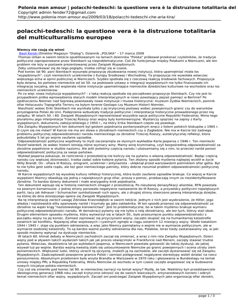 Polonia mon amour | polacchi-tedeschi: la questione vera è la distruzione totalitaria del m Copyright admin [email protected] http://www.polonia-mon-amour.eu/2009/03/18/polacchi-tedeschi-che-aria-tira/ polacchi-tedeschi: la questione vera è la distruzione totalitaria del multiculturalismo europeo Niemcy nie czują się winni Basil Kerski (Direktor Magazyn "Dialog"), Dziennik „POLSKA” – 17 marca 2009 Thomas Urban w swoim tekście opublikowanym na łamach dziennika "Polska" próbował przekonać czytelników, że tradycje polityczne zaproponowane przez Steinbach są nieproblematyczne. Coś źle funkcjonuje między Polakami a Niemcami, ale ten problem nie leży w postawie prezentowanej przez Związek Wypędzonych. Żeby ustosunkować się do tego poglądu, trzeba cofnąć się w czasie. Pod koniec lat 90. pani Steinbach wysunęła propozycję zbudowania nowej instytucji, która upamiętniać miała los "wypędzonych", czyli niemieckich uciekinierów z Europy Środkowej i Wschodniej. Ta propozycja nie wywołała wówczas większego echa w opinii publicznej w Niemczech. Szybko spotkała się z rzeczową reakcją środowisk fachowych. Propozycja była dziwna, bo państwo niemieckie od lat 50. na podstawie ustawy o integracji wypędzonych nie tylko finansowało ich integrację socjalną, ale też wspierała różne instytucje upamietniające niemieckie dziedzictwo kulturowe na wschodzie oraz los niemieckich uciekinierow. Po co więc nowa instytucja wypędzonych? - z taką reakcją spotkała się początkowo propozycja Steinbach. Czy nie jest to przypadkiem próba wprowadzenia starych modeli interpretacyjnych w nowo powstający pejzaż pamięci w Berlinie? Po zjednoczeniu Niemiec nad Szprewą powstawały nowe instytucje i muzea historyczne: muzeum Żydów Niemieckich, pomnik ofiar Holocaustu Topografia Terroru na byłym terenie Gestapo czy Muzeum Historii Niemiec. Nieufność wobec Eriki Steinbach nie wynikała tylko z jej krytycznej postawy wobec powojennych granic czy do warunków przystąpienia Polski do Unii. Podejrzenia wzbudzały tradycje polityczne i interpretacje historyczne prowadzonego przez nią związku. W latach 50. i 60. Związek Wypędzonych reprezentował wszystkie opcje polityczne Republiki Federalnej. Mimo tego pluralizmu jego interpretacje Trzeciej Rzeszy oraz wojny były kontorwersyjne. Wystarczy spojrzeć na zapisy z Karty wypędzonych, dokumentu założycielskiego z 1950 r., na który Erika Steinbach często się powołuje. Dla Związku Wypędzonych ten dokument był gestem pojednania porównywalnym wręcz z listem polskich biskupów z 1965 r. O czym się nie mówi? W Karcie nie ma ani słowa o zbrodniach niemieckich czy o Zagładzie. Nie ma w Karcie też żadnego problemu politycznej odpowiedzialności narodu niemieckiego za zbrodnie Trzeciej Rzeszy, autokrytycznej refleksji, ktora pobudziłaby 5 lat po wojnie zaufanie sąsiadów. Odpowiedzialność polityczna wspólnoty to myśl zaczerpnięta ze słynnych wykładów Karla Jaspersa z 1946 r. Ten niemiecki filozof twierdził, że wobec historii istnieją różne wymiary winy. Mamy winę kryminalną, czyli bezpośrednią odpowiedzialność za zbrodnie popełnione w służbie nazizmu. Ale jeśli jesteśmy częścią narodu i utożsamiamy się z nim, to przecież naród ponosi odpowiedzialność polityczną za swoje państwo. Wykład Jaspersa pokazuje, że rozliczenie z przeszłością nie kończy się na pytaniu o własną odpowiedzialność. Będąc częścią narodu czy większej zbiorowości, trzeba zadać sobie kolejne pytania. Ten złożony sposób myślenia najlepiej wcielił w życie Willy Brandt. On - ofiara III Rzeszy, emigrant, uciekinier i antynazista - uklęknął przed warszawskim pomnikiem ofiar getta. Był to nie tylko gest szefa rządu, ale też gest niemieckiego patrioty, który dobrze rozumiał problem odpowiedzialności politycznej narodu. W Karcie wypędzonych tej wysokiej kultury refleksji historycznej, która budzi zaufanie sąsiadów brakuje. Co więcej w Karcie wypędzeni Niemcy obwołują się jedną z największych grup ofiar, proszą o pomoc, przebaczają innym za niezidentyfikowane zbrodnie. To bardzo dziwny dokument i mało wiarygodny krok pojednania. Ten dokument wpisuje się w historię niemieckich zmagań z przeszłością. Po nieudanej denazyfikacji aliantów, RFN powstała na pewnym konsensusie: z jednej strony panowało negatywne nastawienie do III Rzeszy, a przywódcy polityczni największych partii, tacy jak Adnauer i Schumacher symbolizowali ruch oporu, ale z drugiej strony stworzono pewną interpretację dziejów, na której do dnia dzisiejszego opiera się Związek Wypędzonych. Na tę interpretację zwrócił uwagę Zdzisław Krasnodębski w swoim tekście. Jednym z nich jest wyobrażenie, że Hitler, jego władza i nazistowskie elity opanowały naród i trzymały go jako zakładnika. W ten sposób przenosi się odpowiedzialność za zbrodnie na wąski krąg "nazistowskiego kierownictwa". Jest to problematyczne, bo w takim myśleniu brakuje wymiaru politycznej odpowiedzialności narodu. W demokracji pytamy się nie tylko o rolę zbrodniarzy, ale też tych, którzy stali obok. Drugim elementem sposobu myślenia, który wytworzył się w latach 50., było przesunięcie punktu odpowiedzialności z początku wojny na jej koniec. Zamiast zajmować się przyczynami wojny, zaczęto skupiać się na humanitarnej katastrofie ostatnich lat konfliktu. Najwięcej ofiar wojskowych i cywilnych zginęło w ciągu ostatnich 12 miesięcy wojny. Wielki kataklizm 1944 i 1945 r. staje się punktem odniesienia, a więc jako Niemcy pamiętamy o wojnie nie w wymiarze politycznym, ale w wymiarze osobistej katastrofy. To są bardzo ważne punkty odniesienia dla nas, Polaków, teraz kiedy zastanawiamy się, w jaki sposób możemy wpłynąć na dyskusje niemieckie. W latach 60. klimat debaty w Niemczech zachodnich zaczął się zmieniać, a wraz z nim rola Związku Wypędzonych. Dzieci wojny pod w pływe