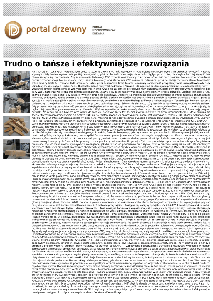 Trudno o tańsze i efektywniejsze rozwiązania Na tradycyjnych tokarkach hydraulicznych podczas toczenia drewnianych nóg występowały ograniczone możliwości wykonania głębokich wytoczeń. Maszyny kopiujące miały bowiem ograniczenia poniżej pewnego łuku, gdyż nóż tokarski przesuwając się w ruchu ciągłym po wzorniku, nie mógł się bardziej zagłębić, bez obawy zacięcia się i zatrzymania. Przy zastosowaniu technologii CNC toczenie wyrafinowanych kształtów nóżek jest dużo prostsze, bowiem noże prowadzone poprzez program mogą być za pomocą śruby i silnika krokowego oraz sterowania CNC dosuwane, odsuwane, przez co nadają toczonym elementom bardzo zróżnicowany kształt. – Tokarki CNC, oferowane także przez hiszpańską firmę Intorex, eliminują konieczność przygotowywania skomplikowanych noży kształtowych, kopiujących – mówi Maciej Olszewski, prezes firmy Technodrewno z Poznania, która jest na polskim rynku przedstawicielem hiszpańskiej firmy. – Wcześniej bowiem skomplikowane wzory na elementach wykonywało się za pomocą profilowych noży kształtowych, które były przygotowywane specjalnie pod dany wzór. Każdorazowo trzeba było przestawiać maszynę, ustawiać czy także wykonywać dosyć skomplikowany proces ostrzenia. Obecnie technologia CNC pozwala znacznie ograniczyć, a w zasadzie wyeliminować noże kształtowe. Dostępne są w niej także dodatkowe elementy osprzętu, takie jak pneumatyczne lunety czy podtrzymki, bardzo pomocne na przykład podczas obróbki cienkich akcesoriów meblowych. Niwelują one lub co najmniej ograniczają drgania, przez co zyskuje na jakości szczególnie obróbka elementów skręcanych, co eliminuje potrzebę długiego szlifowania wykańczającego. Toczenie jest bowiem jednym z podstawowych, ale jednak tylko jednym z elementów procesu technologicznego. Szlifowanie elementu, który jest dobrze i gładko wytoczony jest o wiele szybsze. Gdy przeanalizuje się czasochłonność procesu produkcji galanterii drzewnej, czyli wszelkiego rodzaju nóżek, a szczególnie nóżek toczonych, to okazuje się, że najbardziej czasochłonnym elementem jest szlifowanie. Większe są możliwości wykonania nóg drewnianych Tokarki CNC oferowane przez Intorex mają program autorski. Na rynku nie ma bowiem programów do tokarek, ponieważ są to tak specjalistyczne maszyny, że firmy programistyczne, które zajmują się specjalistycznym oprogramowaniem do maszyn CNC, nie są zainteresowane ich opracowaniem. Inaczej jest w przypadku frezarek CNC, choćby rozbudowanego modelu TMC 1500 Intorex. Program pozwala wykonać na tej maszynie obróbkę dosyć skomplikowanego elementu drewnianego, jak na przykład noga typu „ludwik” lub kolba karabinu. Istnieje bowiem możliwość wgrania programu zewnętrznego, bazującego na popularnych programach do projektowania typu CAD/CAM. – Dzięki rozwiniętym możliwościom technicznym producenci drewnianych akcesoriów meblowych są dzisiaj w stanie sprostać realizacji nawet najbardziej śmiałych projektów, zarówno w zakresie kształtów, wymiarów, kolorów, jak i innych dosyć oryginalnych oczekiwań – mówi Maciej Olszewski. – Dlatego o ile dawniej dominowały nogi toczone, wykonane z drewna bukowego, sosnowego czy brzozowego o profilu delikatnie zwężającym się ku dołowi, to obecnie dużo większe są możliwości wykonania nóg drewnianych o nietypowym kształcie, świetnie komponujących się z nowoczesnymi meblami. W nienagannej jakości, w sposób powtarzalny Żeby nie być gołosłownym, prezes spółki Technodrewno pokazuje modele nóżek meblowych powyginanych w różne strony, o kształcie łuku, z wieloma wyfrezowaniami, ale także o kształcie ostrosłupa czy graniastosłupa. Uzyskanie idealnej powtarzalności pochylenia poszczególnych płaszczyzn nogi jest trudne do uzyskania przy obróbce na kilku prostszych maszynach czy podczas obróbki ręcznej. – Tylko na specjalistycznych centrach obróbczych firmy Intorex drewniane nogi do mebli można wykonywać w nienagannej jakości, w sposób powtarzalny oraz szybko, czyli w praktyce taniej niż na kilku standardowych maszynach stolarskich czy nawet na centrach obróbczych wykonujących jedną czy dwie operacje technologiczne – przekonuje Maciej Olszewski. – Dostępne są technologie i centra o dużej wydajności, wymagające niewielkiego udziału pracownika, którego rola ogranicza się zwykle do zapełniania magazynka buforowego podajnika drewnianymi klockami. Intorex jest producentem wysoko wydajnych i elastycznych frezarek CNC do obróbki drewnianych nóżek, umożliwiających w jednym mocowaniu frezowanie, wiercenie, profilowanie i szlifowanie takich akcesoriów meblowych jak drewniane nogi i nóżki. Maszyny tej firmy, które od 20 lat promuję i sprzedaję na polskim rynku, wykonują przeróżne modele nóżek praktycznie gotowe do bejcowania czy lakierowania, po nieomalże kosmetycznym przeszlifowaniu jednej czy dwóch krawędzi, choć często i to jest niepotrzebne. Cała obróbka w jednym zamocowaniu Wiodący polscy producenci drewnianych akcesoriów meblowych wyposażają się obecnie na przykład w centrum TC-1000 hiszpańskiego producenta. Obsługujący maszynę zajmuje się jedynie zapełnianiem podajnika czy magazynka drewnianymi klockami. Za osłoną agregat obróbczy wykonuje obróbkę wstępną klocka frezem bocznym, ale tak, żeby później podzielić go na dwie części, ponieważ za jednym zamocowaniem powstają… dwie nóżki. Przyspiesza to znacznie czas produkcji takiej nogi, jeżeli jest ona robiona w układzie podwójnym. Głowica frezująca frezuje głównie kształt, potem realizowane jest fazowanie narożników, po czym papierem ściernym 150 zostaje przeszlifowana każda powierzchni nóżki. Po krótkiej chwili operator może zdjąć z uchwytu maszyny dwie identyczne nóżki. Oglądając gotowy element, można go uznać za mało skomplikowany, bo ma kształt ostrosłupa, o 