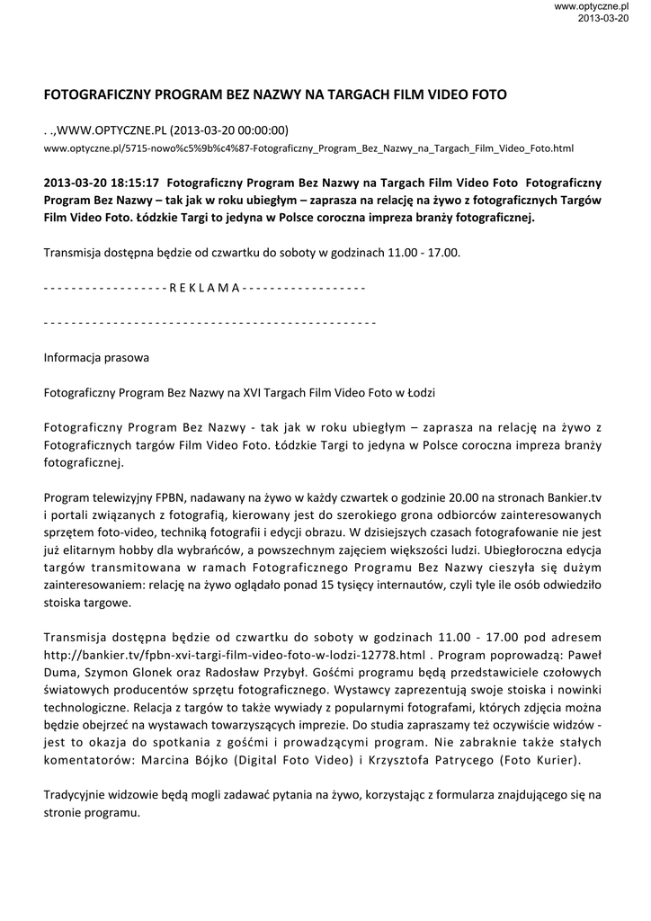 www.optyczne.pl 2013-03-20 FOTOGRAFICZNY PROGRAM BEZ NAZWY NA TARGACH FILM VIDEO FOTO . .,WWW.OPTYCZNE.PL (2013-03-20 00:00:00) www.optyczne.pl/5715-nowo%c5%9b%c4%87-Fotograficzny_Program_Bez_Nazwy_na_Targach_Film_Video_Foto.html 2013-03-20 18:15:17 Fotograficzny Program Bez Nazwy na Targach Film Video Foto Fotograficzny Program Bez Nazwy – tak jak w roku ubiegłym – zaprasza na relację na żywo z fotograficznych Targów Film Video Foto. Łódzkie Targi to jedyna w Polsce coroczna impreza branży fotograficznej. Transmisja dostępna będzie od czwartku do soboty w godzinach 11.00 - 17.00. ------------------REKLAMA----------------------------------------------------------------Informacja prasowa Fotograficzny Program Bez Nazwy na XVI Targach Film Video Foto w Łodzi Fotograficzny Program Bez Nazwy - tak jak w roku ubiegłym – zaprasza na relację na żywo z Fotograficznych targów Film Video Foto. Łódzkie Targi to jedyna w Polsce coroczna impreza branży fotograficznej. Program telewizyjny FPBN, nadawany na żywo w każdy czwartek o godzinie 20.00 na stronach Bankier.tv i portali związanych z fotografią, kierowany jest do szerokiego grona odbiorców zainteresowanych sprzętem foto-video, techniką fotografii i edycji obrazu. W dzisiejszych czasach fotografowanie nie jest już elitarnym hobby dla wybrańców, a powszechnym zajęciem większości ludzi. Ubiegłoroczna edycja targów transmitowana w ramach Fotograficznego Programu Bez Nazwy cieszyła się dużym zainteresowaniem: relację na żywo oglądało ponad 15 tysięcy internautów, czyli tyle ile osób odwiedziło stoiska targowe. Transmisja dostępna będzie od czwartku do soboty w godzinach 11.00 - 17.00 pod adresem http://bankier.tv/fpbn-xvi-targi-film-video-foto-w-lodzi-12778.html . Program poprowadzą: Paweł Duma, Szymon Glonek oraz Radosław Przybył. Gośćmi programu będą przedstawiciele czołowych światowych producentów sprzętu fotograficznego. Wystawcy zaprezentują swoje stoiska i nowinki technologiczne. Relacja z targów to także wywiady z popularnymi fotografami, których zdjęcia można będzie obejrzeć na wystawach towarzyszących imprezie. Do studia zapraszamy też oczywiście widzów jest to okazja do spotkania z gośćmi i prowadzącymi program. Nie zabraknie także stałych komentatorów: Marcina Bójko (Digital Foto Video) i Krzysztofa Patrycego (Foto Kurier). Tradycyjnie widzowie będą mogli zadawać pytania na żywo, korzystając z formularza znajdującego się na stronie programu. www.optyczne.pl 2013-03-20 Robert Olech | źródło FPBN