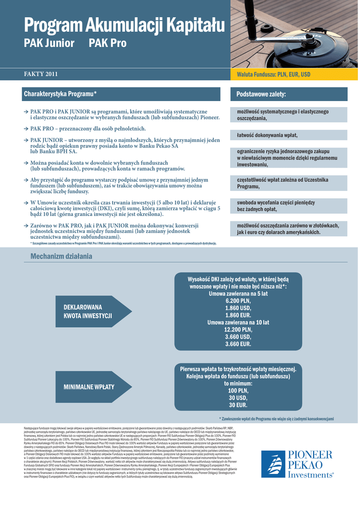Program Akumulacji Kapitału PAK Junior PAK Pro FAKTY 2011 Waluta Funduszu: PLN, EUR, USD Charakterystyka Programu* Podstawowe zalety: PAK PRO i PAK JUNIOR są programami, które umożliwiają systematyczne i elastyczne oszczędzanie w wybranych funduszach (lub subfunduszach) Pioneer. PAK PRO – przeznaczony dla osób pełnoletnich. PAK JUNIOR – utworzony z myślą o najmłodszych, których przynajmniej jeden rodzic bądź opiekun prawny posiada konto w Banku Pekao SA lub Banku BPH SA. Można posiadać konta w dowolnie wybranych funduszach (lub subfunduszach), prowadzących konta w ramach programów. możliwość systematycznego i elastycznego oszczędzania, łatwość dokonywania wpłat, ograniczenie ryzyka jednorazowego zakupu w niewłaściwym momencie dzięki regularnemu inwestowaniu, Aby przystąpić do programu wystarczy podpisać umowę z przynajmniej jednym funduszem (lub subfunduszem), zaś w trakcie obowiązywania umowy można zwiększać liczbę funduszy. częstotliwość wpłat zależna od Uczestnika Programu, W Umowie uczestnik określa czas trwania inwestycji (5 albo 10 lat) i deklaruje całościową kwotę inwestycji (DKI), czyli sumę, którą zamierza wpłacić w ciągu 5 bądź 10 lat (górna granica inwestycji nie jest określona). swoboda wycofania części pieniędzy bez żadnych opłat, Zarówno w PAK PRO, jak i PAK JUNIOR można dokonywać konwersji jednostek uczestnictwa między funduszami (lub zamiany jednostek uczestnictwa między subfunduszami). możliwość oszczędzania zarówno w złotówkach, jak i euro czy dolarach amerykańskich. * Szczegółowe zasady uczestnictwa w Programie PAK Pro i PAK Junior określają warunki uczestnictwa w tych programach, dostępne u prowadzących dystrybucję. Mechanizm działania DEKLAROWANA KWOTA INWESTYCJI Wysokość DKI zależy od waluty, w której będą wnoszone wpłaty i nie może być niższa niż*: Umowa zawierana na 5 lat 6.200 PLN, 1.860 USD, 1.860 EUR. Umowa zawierana na 10 lat 12.200 PLN, 3.660 USD, 3.660 EUR. MINIMALNE WPŁATY Pierwsza wpłata to trzykrotność wpłaty miesięcznej. Kolejna wpłata do funduszu (lub subfunduszu) to minimum: 100 PLN, 30 USD, 30 EUR. * Zawieszenie wpłat do Programu nie wiąże się z żadnymi konsekwencjami Następujące fundusze mogą lokować swoje aktywa w papiery wartościowe emitowane, poręczone lub gwarantowane przez dowolny z następujących podmiotów: Skarb Państwa RP, NBP, jednostkę samorządu terytorialnego, państwo członkowskie UE, jednostkę samorządu terytorialnego państwa należącego do UE, państwo należące do OECD lub międzynarodową instytucję finansową, której członkiem jest Polska lub co najmniej jedno państwo członkowskie UE w następujących proporcjach: Pioneer FIO Subfundusz Pioneer Obligacji Plus do 100%, Pioneer FIO Subfundusz Pioneer Lokacyjny do 100%, Pioneer FIO Subfundusz Pioneer Stabilnego Wzrostu do 85%, Pioneer FIO Subfundusz Pioneer Zrównoważony do 100%, Pioneer Zrównoważony Rynku Amerykańskiego FIO do 65%. Pioneer Obligacji Dolarowych Plus FIO może lokować do 100% wartości aktywów Funduszu w papiery wartościowe poręczone lub gwarantowane przez dowolny z następujących podmiotów: Skarb Państwa, Narodowy Bank Polski, Stany Zjednoczone Ameryki Północnej, Kanadę, państwo członkowskie, jednostkę samorządu terytorialnego państwa członkowskiego, państwo należące do OECD lub międzynarodową instytucję finansową, której członkiem jest Rzeczpospolita Polska lub co najmniej jedno państwo członkowskie, a Pioneer Obligacji Dolarowych FIO może lokować do 100% wartości aktywów Funduszu w papiery wartościowe emitowane, poręczone lub gwarantowane przez podmioty wymienione w 1 części zdania oraz dodatkowo agendy rządowe USA. Ze względu na skład portfela inwestycyjnego subfunduszy należących do Pioneer FIO (znaczny udział instrumentów finansowych o charakterze akcyjnym): Pioneer Akcji Polskich, Pioneer Zrównoważony, wartość netto ich aktywów może charakteryzować się dużą zmiennością. Aktywa subfunduszy należących do Pioneer Funduszy Globalnych SFIO oraz funduszy Pioneer Akcji Amerykańskich, Pioneer Zrównoważony Rynku Amerykańskiego, Pioneer Akcji Europejskich i Pioneer Obligacji Europejskich Plus w znacznej mierze mogą być lokowane w inne kategorie lokat niż papiery wartościowe i instrumenty rynku pieniężnego, tj. w tytuły uczestnictwa funduszy zagranicznych inwestujących głównie w instrumenty finansowe o charakterze udziałowym (nie dotyczy to funduszy zagranicznych, w których tytuły uczestnictwa są lokowane aktywa Subfunduszu Pioneer Obligacji Strategicznych oraz Pioneer Obligacji Europejskich Plus FIO), w związku z czym wartość aktywów netto tych Subfunduszy może charakteryzować się dużą zmiennością. Program Akumulacji Kapitału Wiarygodność i doświadczenie Pioneer Pekao TFI S.A. w Polsce Historia funduszy inwestycyjnych Pioneer rozpoczęła się ponad 80 lat temu w USA utworzeniem funduszu Pioneer Fund. Obecnie Klienci na całym świecie mają do wyboru kilkaset funduszy różnego typu. Najstarsze i największe towarzystwo funduszy inwestycyjnych około 18 mld PLN zarządzanych aktywów i 16% udziału w rynku Firmie zaufało najwięcej klientów na rynku – ponad 600 tysięcy Jedna z najszerszych ofert na rynku – ponad 30 funduszy i subfunduszy Jedna z najlepiej rozpoznawanych marek w branży Warszawa Dublin Boston Nowy Jork Pioneer Investments na świecie Singapur 185 mld EUR zarządzanych aktywów ponad 2000 pracowników zatrudnionych w 28 krajach ponad 120 zarządzających portfelami Boston, Dublin, Singapur - nasze światowe centra inwestycyjne Źródło danych: Pioneer Investments oraz Pioneer Pekao TFI S.A., stan na 31.10.2010 r. Fundusze i subfundusze dostępne w PAK PRO i PAK JUNIOR uszeregowane pod względem potencjału zysku i ryzyka inwestycyjnego Subfundusz Pioneer Akcji Rynków Wschodzących (należy do PFG SFIO) Subfundusz Pioneer Surow