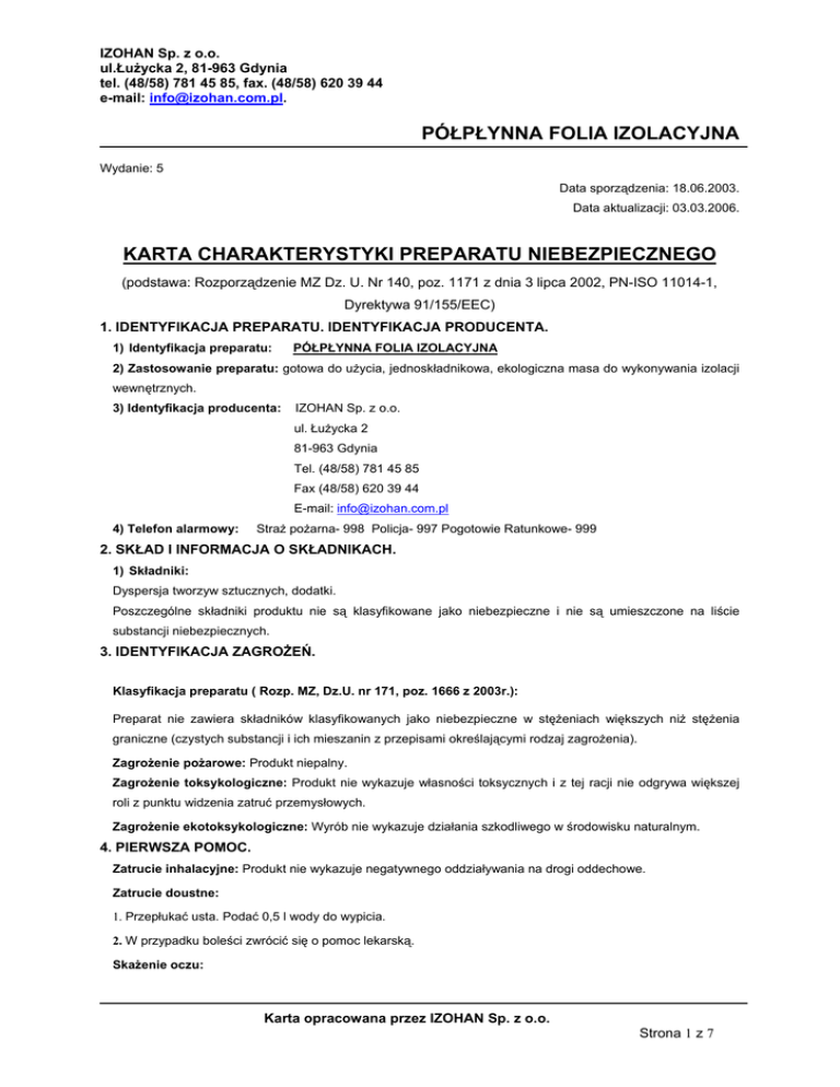 IZOHAN Sp. z o.o. ul.Łużycka 2, 81-963 Gdynia tel. (48/58) 781 45 85, fax. (48/58) 620 39 44 e-mail: [email protected]. PÓŁPŁYNNA FOLIA IZOLACYJNA Wydanie: 5 Data sporządzenia: 18.06.2003. Data aktualizacji: 03.03.2006. KARTA CHARAKTERYSTYKI PREPARATU NIEBEZPIECZNEGO (podstawa: Rozporządzenie MZ Dz. U. Nr 140, poz. 1171 z dnia 3 lipca 2002, PN-ISO 11014-1, Dyrektywa 91/155/EEC) 1. IDENTYFIKACJA PREPARATU. IDENTYFIKACJA PRODUCENTA. 1) Identyfikacja preparatu: PÓŁPŁYNNA FOLIA IZOLACYJNA 2) Zastosowanie preparatu: gotowa do użycia, jednoskładnikowa, ekologiczna masa do wykonywania izolacji wewnętrznych. 3) Identyfikacja producenta: IZOHAN Sp. z o.o. ul. Łużycka 2 81-963 Gdynia Tel. (48/58) 781 45 85 Fax (48/58) 620 39 44 E-mail: [email protected] 4) Telefon alarmowy: Straż pożarna- 998 Policja- 997 Pogotowie Ratunkowe- 999 2. SKŁAD I INFORMACJA O SKŁADNIKACH. 1) Składniki: Dyspersja tworzyw sztucznych, dodatki. Poszczególne składniki produktu nie są klasyfikowane jako niebezpieczne i nie są umieszczone na liście substancji niebezpiecznych. 3. IDENTYFIKACJA ZAGROŻEŃ. Klasyfikacja preparatu ( Rozp. MZ, Dz.U. nr 171, poz. 1666 z 2003r.): Preparat nie zawiera składników klasyfikowanych jako niebezpieczne w stężeniach większych niż stężenia graniczne (czystych substancji i ich mieszanin z przepisami określającymi rodzaj zagrożenia). Zagrożenie pożarowe: Produkt niepalny. Zagrożenie toksykologiczne: Produkt nie wykazuje własności toksycznych i z tej racji nie odgrywa większej roli z punktu widzenia zatruć przemysłowych. Zagrożenie ekotoksykologiczne: Wyrób nie wykazuje działania szkodliwego w środowisku naturalnym. 4. PIERWSZA POMOC. Zatrucie inhalacyjne: Produkt nie wykazuje negatywnego oddziaływania na drogi oddechowe. Zatrucie doustne: 1. Przepłukać usta. Podać 0,5 l wody do wypicia. 2. W przypadku boleści zwrócić się o pomoc lekarską. Skażenie oczu: Karta opracowana przez IZOHAN Sp. z o.o. Strona 1 z 7 IZOHAN Sp. z o.o. ul.Łużycka 2, 81-963 Gdynia tel. (48/58) 781 45 85, fax. (48/58) 620 39 44 e-mail: [email protected]. PÓŁPŁYNNA FOLIA IZOLACYJNA 1. Usunąć szkła kontaktowe. Skażone oczy delikatnie oczyścić mechanicznie. Następnie obficie i długo przemywać tylko zimną wodą, starając się wywijać powieki. Wpuścić 1-2 krople oleju rycynowego dla złagodzenia bólu. Oczy osłonić gazą. 2. Jeśli podrażnienie nie ustępuje, zapewnić konsultację lekarza okulisty. Skażenie skóry: 1. Zmyć skórę przed zaschnięciem produktu ciepłą wodą z mydłem. 2. Zasięgnąć porady dermatologa, gdy wystąpi podrażnienie skóry. 5. POSTĘPOWANIE W PRZYPADKU POŻARU. 1) Właściwe środki gaśnicze: Gaśnice CO2, gaśnice proszkowe z proszkiem gaszącym ABC, gaśnice proszkowe z proszkiem gaszącym BC, gaśnice pianowe, gaśnice płynowe z dodatkowym wodnym roztworem środka. 2) Środki gaśnicze, których nie wolno używać: Brak. 3) Szczególne zagrożenie: Produkt niepalny, 4) Środki ochrony indywidualnej dla strażaków: Ubrania ochronne i niezależna aparatura do oddychania wyposażona w maskę. 6. POSTĘPOWANIE W PRZYPADKU NIEZAMIERZONEGO UWOLNIENIA DO ŚRODOWISKA. 1) Indywidualne środki ostrożności: Specjalne środki nie są konieczne. 2) Środki ostrożności w zakresie ochrony środowiska: Produkt nie wykazuje działania szkodliwego w środowisku naturalnym. 3) Metody oczyszczania: Uszczelnić uszkodzone opakowania, zebrany ze środowiska produkt umieścić w opakowaniu zastępczym. 7. POSTĘPOWANIE Z PREPARATEM I JEGO MAGAZYNOWANIE. 1) Postępowanie z preparatem: Przestrzegać podstawowych zasad bezpieczeństwa i higieny pracy. 2) Magazynowanie: W oryginalnych, właściwie oznakowanych opakowaniach, w suchych pomieszczeniach w o o temperaturze od +5 C do +25 C. Termin przechowywania nie dłużej niż 12 miesięcy od daty produkcji. Przechowywać poza zasięgiem dzieci. 3) Specyficzne zastosowania: Nie dotyczy. 8. KONTROLA NARAŻENIA I ŚRODKI OCHRONY INDYWIDUALNEJ. 1) Parametry kontroli narażenia: ( Rozp. MIPS, Dz. U. 217.1833 z 2002 r. ) Produkt nie zawiera żadnych substancji wymagających monitorowania na stanowisku pracy. 2) Wentylacja: Wentylacja ogólna pomieszczenia. 3) Środki ochrony indywidualnej: Ręce: Ręce zabrudzone podczas pracy należy umyć ciepłą wodą. Oczy: Przy właściwym obchodzeniu się z produktem specjalna ochrona nie jest konieczna. Drogi oddechowe: Przy właściwym obchodzeniu się z produktem specjalna ochrona nie jest konieczna. Skóra i ciało: Fartuchy ochronne. Higiena pracy: Obowiązują przepisy ogólne przemysłowej higieny pracy. 9. WŁAŚCIWOŚCI FIZYKOCHEMICZNE. Karta opracowana przez IZOHAN Sp. z o.o. Strona 2 z 7 IZOHAN Sp. z o.o. ul.Łużycka 2, 81-963 Gdynia tel. (48/58) 781 45 85, fax. (48/58) 620 39 44 e-mail: [email protected]. PÓŁPŁYNNA FOLIA IZOLACYJNA Postać – półpłynna Zapach – charakterystyczny dla dyspersji polimerów. pH- 8 o Temperatura wrzenia – 100 C O Temperatura topnienia - 0 C Temperatura zapłonu – nie dotyczy Temperatura samozapłonu – nie dotyczy Barwa – beżowo-szara Palność – produkt niepalny Właściwości wybuchowe – nie ma niebezpieczeństwa pożaru, czy wybuchu w normalnych warunkach Właściwości utleniające – nieznane Prężność par – nieznana o 3 Gęstość w temperaturze 20 C – 1,34 g/cm Rozpuszczalność: - w wodzie – rozpuszcza się - w innych rozpuszczalnikach – rozpuszcza się w większości rozpuszczalników organicznych Współczynnik podziału n-oktanol/woda – nie dotyczy Inne właściwości - - 10. STABILNOŚĆ I REAKTYWNOŚĆ. W normalnych warunkach produkt stabilny, nie reaguje niebezpiecznie z innymi substancjami. 1) Warunki, których należy unikać : ujemna temperatura. 2) Materiały, których należy unikać: 3) Niebezpieczne produkty rozkładu: - 11. INFORMACJE TOKSYKOLOGICZNE. Drogi narażenia człowieka: Nie odnotowano toksycznego oddziaływania produktu. 1) Toksyczność ostra.