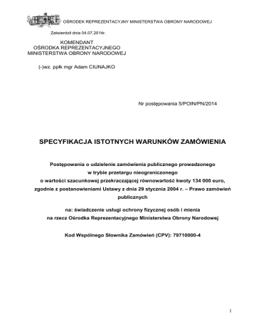 OŚRODEK REPREZENTACYJNY MINISTERSTWA OBRONY NARODOWEJ Zatwierdził dnia 04.07.2014r. KOMENDANT OŚRODKA REPREZENTACYJNEGO MINISTERSTWA OBRONY NARODOWEJ (-)wz. ppłk mgr Adam CIUNAJKO Nr postępowania 5/POIN/PN/2014 SPECYFIKACJA ISTOTNYCH WARUNKÓW ZAMÓWIENIA Postępowania o udzielenie zamówienia publicznego prowadzonego w trybie przetargu nieograniczonego o wartości szacunkowej przekraczającej równowartość kwoty 134 000 euro, zgodnie z postanowieniami Ustawy z dnia 29 stycznia 2004 r. – Prawo zamówień publicznych na: świadczenie usługi ochrony fizycznej osób i mienia na rzecz Ośrodka Reprezentacyjnego Ministerstwa Obrony Narodowej Kod Wspólnego Słownika Zamówień (CPV): 79710000-4 1 OŚRODEK REPREZENTACYJNY MINISTERSTWA OBRONY NARODOWEJ 1. Specyfikacja Istotnych Warunków Zamówienia została sporządzona zgodnie z ustawą z dnia 29 stycznia 2004 r. Prawo zamówień publicznych (tekst jednolity Dz. U. z 2013 r. poz.907, z późn. zm.) i uregulowaniami prawnymi wydanymi na jej podstawie oraz innymi aktami prawnymi. 2. Ilekroć w treści występuje słowo „ustawa”, Zamawiający przywołuje ustawę Prawo zamówień publicznych. 3. Ilekroć w treści występuje słowo „SIWZ” Zamawiający przywołuje Specyfikację Istotnych Warunków Zamówienia. Rozdział 1. Nazwa i adres Zamawiającego. Zamawiający: Ośrodek Reprezentacyjny Ministerstwa Obrony Narodowej. Adres: Nowa Wieś ul. Grodziska 1, 05-800 Pruszków. NIP: 534-00-16-936, Regon: 010427452 Telefon: 22 6 892 000, Faks: 22 6 892 048 http://www.ormon.wp.mil.pl Godziny pracy od 7:30 do 15:30 od poniedziałku do piątku. Rozdział 2. Tryb udzielenia zamówienia. Postępowanie o udzielenie zamówienia prowadzone jest w trybie przetargu nieograniczonego na podstawie ustawy Prawo zamówień publicznych z dnia 29 stycznia 2004 r. (Dz. U. z 2013 r. poz. 907 z późn. zm.) zwanej dalej ustawą. Rozdział 3. Opis przedmiotu zamówienia. 1. Przedmiotem zamówienia jest usługa ochrony terenów, obiektów, urządzeń oraz osób, mienia i porządku na terenie chronionym, realizowana w całodobowym systemie zmianowym na rzecz Ośrodka Reprezentacyjnego Ministerstwa Obrony Narodowej, w: Kompleksie wojskowym nr 3513 („Helenów”), woj. mazowieckie, powiat pruszkowski, gmina Michałowice, Nowa Wieś, ul. Grodziska 1; Kompleksach wojskowych: nr 4274 („Omulew”), woj. warmińsko – mazurskie, powiat szczycieński, gmina Jedwabno i nr 4506 („Czarny Piec”), woj. warmińsko – mazurskie, powiat szczycieński, gmina Jedwabno. Usługa wykonywana przez Wykonawcę w formie Specjalistycznej Uzbrojonej Formacji Ochronnej (SUFO). Kod CPV: 79710000-4. 2. Szczegółowy opis przedmiotu zamówienia określa: opis przedmiotu zamówienia załącznik nr 1 do SIWZ; wzór umowy- załącznik nr 8 do SIWZ. 3. Zamawiający nie dopuszcza składania ofert częściowych. 2 OŚRODEK REPREZENTACYJNY MINISTERSTWA OBRONY NARODOWEJ 4. Zamawiający nie dopuszcza składania ofert wariantowych. 5. Zamawiający nie przewiduje udzielenia zamówień uzupełniających. Rozdział 4. Termin wykonania zmówienia. Zamówienie wykonywane będzie w terminie: 01.11.2014 r. - 30.09.2017 r. Rozdział 5. Warunki udziału w postępowaniu oraz opis sposobu dokonywania oceny spełniania tych warunków. 1. W postępowaniu mogą wziąć udział Wykonawcy, którzy spełniają warunki określone w art. 22 ust.1 ustawy: Wykonawca spełni warunek w sytuacji, kiedy oświadczy, że spełnia warunki określone w art. 22 ust.1 ustawy oraz wykaże, że: 1.1. Posiada uprawnienia do wykonywania określonej działalności lub czynności, jeżeli przepisy prawa nakładają obowiązek ich posiadania. Wykonawca spełni warunek w sytuacji, kiedy wykaże, że posiada: 1.1.1. Aktualną koncesję na prowadzenie działalności gospodarczej w zakresie usług ochrony osób i mienia wydaną przez Ministerstwo Spraw Wewnętrznych; 1.1.2. Świadectwo Bezpieczeństwa Przemysłowego III stopnia potwierdzające zdolność Wykonawcy do ochrony informacji niejawnych oznaczonych klauzulą „POUFNE” lub wyższą; Zamawiający dokona oceny spełnienia przez Wykonawców wyżej wymienionego warunku udziału w postępowaniu na podstawie złożonego oświadczenia o spełnianiu warunków udziału w postępowaniu oraz dokumentach wymienionych w rozdziale 6 pkt 1.2. SIWZ, zgodnie z formułą „spełnia- nie spełnia”. 1.2. Posiada wiedzę i doświadczenie. Wykonawca spełni warunek w sytuacji, kiedy wykaże, że w okresie ostatnich trzech lat przed upływem terminu składania ofert, a jeżeli okres prowadzenia działalności jest krótszy – w tym okresie wykonał, a w przypadku świadczeń okresowych lub ciągłych wykonuje: - co najmniej dwa zamówienia polegające na usłudze ochrony osób i mienia o wartości brutto minimum 2 600 000,00 PLN (słownie: dwa miliony sześćset tysięcy złotych) oraz potwierdzi dowodami, że usługi te zostały wykonane lub są wykonywane należycie. Zamawiający dokona oceny spełnienia przez Wykonawców wyżej wymienionego warunku udziału w postępowaniu na podstawie złożonego oświadczenia o spełnianiu warunków udziału w postępowaniu oraz dokumencie wymienionym w rozdziale 6 pkt 1.3. SIWZ, zgodnie z formułą „spełnia- nie spełnia”. 3 OŚRODEK REPREZENTACYJNY MINISTERSTWA OBRONY NARODOWEJ 1.3. Dysponuje odpowiednim potencjałem technicznym oraz osobami zdolnymi do wykonania zamówienia. 1.3.1. potencjał techniczny; Zamawiający odstępuje od określania szczegółowego warunku w tym zakresie. Zamawiający dokona oceny spełnienia przez Wykonawców wyżej wymienionego warunku udziału w postępowaniu na podstawie złożonego oświadczenia o spełnianiu warunków udziału w postępowaniu, zgodnie z formułą ,,spełnia- nie spełnia”. 1.3.2. osoby zdolne do wykonywania zamówienia; Wykonawca spełni warunek w sytuacji, kiedy wykaże, że dysponuje lub będzie dysponował osobami (w ilości niezbędnej do wykonania zamówienia, określonej w Opisie prz