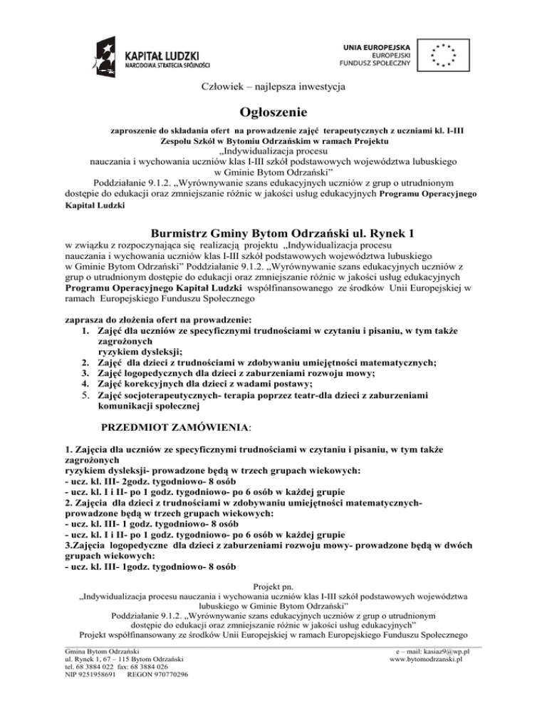 Człowiek – najlepsza inwestycja Ogłoszenie zaproszenie do składania ofert na prowadzenie zajęć terapeutycznych z uczniami kl. I-III Zespołu Szkół w Bytomiu Odrzańskim w ramach Projektu „Indywidualizacja procesu nauczania i wychowania uczniów klas I-III szkół podstawowych województwa lubuskiego w Gminie Bytom Odrzański” Poddziałanie 9.1.2. „Wyrównywanie szans edukacyjnych uczniów z grup o utrudnionym dostępie do edukacji oraz zmniejszanie różnic w jakości usług edukacyjnych Programu Operacyjnego Kapitał Ludzki Burmistrz Gminy Bytom Odrzański ul. Rynek 1 w związku z rozpoczynająca się realizacją projektu „Indywidualizacja procesu nauczania i wychowania uczniów klas I-III szkół podstawowych województwa lubuskiego w Gminie Bytom Odrzański” Poddziałanie 9.1.2. „Wyrównywanie szans edukacyjnych uczniów z grup o utrudnionym dostępie do edukacji oraz zmniejszanie różnic w jakości usług edukacyjnych Programu Operacyjnego Kapitał Ludzki współfinansowanego ze środków Unii Europejskiej w ramach Europejskiego Funduszu Społecznego zaprasza do złożenia ofert na prowadzenie: 1. Zajęć dla uczniów ze specyficznymi trudnościami w czytaniu i pisaniu, w tym także zagrożonych ryzykiem dysleksji; 2. Zajęć dla dzieci z trudnościami w zdobywaniu umiejętności matematycznych; 3. Zajęć logopedycznych dla dzieci z zaburzeniami rozwoju mowy; 4. Zajęć korekcyjnych dla dzieci z wadami postawy; 5. Zajęć socjoterapeutycznych- terapia poprzez teatr-dla dzieci z zaburzeniami komunikacji społecznej PRZEDMIOT ZAMÓWIENIA: 1. Zajęcia dla uczniów ze specyficznymi trudnościami w czytaniu i pisaniu, w tym także zagrożonych ryzykiem dysleksji- prowadzone będą w trzech grupach wiekowych: - ucz. kl. III- 2godz. tygodniowo- 8 osób - ucz. kl. I i II- po 1 godz. tygodniowo- po 6 osób w każdej grupie 2. Zajęcia dla dzieci z trudnościami w zdobywaniu umiejętności matematycznychprowadzone będą w trzech grupach wiekowych: - ucz. kl. III- 1 godz. tygodniowo- 8 osób - ucz. kl. I i II- po 1 godz. tygodniowo- po 6 osób w każdej grupie 3.Zajęcia logopedyczne dla dzieci z zaburzeniami rozwoju mowy- prowadzone będą w dwóch grupach wiekowych: - ucz. kl. III- 1godz. tygodniowo- 8 osób Projekt pn. „Indywidualizacja procesu nauczania i wychowania uczniów klas I-III szkół podstawowych województwa lubuskiego w Gminie Bytom Odrzański” Poddziałanie 9.1.2. „Wyrównywanie szans edukacyjnych uczniów z grup o utrudnionym dostępie do edukacji oraz zmniejszanie różnic w jakości usług edukacyjnych” Projekt współfinansowany ze środków Unii Europejskiej w ramach Europejskiego Funduszu Społecznego _________________________________________________________________________________________________________________ Gmina Bytom Odrzański e – mail: [email protected] ul. Rynek 1, 67 – 115 Bytom Odrzański www.bytomodrzanski.pl tel. 68 3884 022 fax: 68 3884 026 NIP 9251958691 REGON 970770296 Człowiek – najlepsza inwestycja - ucz. kl. I i II- po 1 godz. tygodniowo- po 6 osób w każdej grupie 4. Zajęcia korekcyjnych dla dzieci z wadami postawy-- prowadzone będą w dwóch grupach wiekowych: - ucz. kl. III- 1,5 godz. tygodniowo- 12 osób - ucz. kl. I i II- po 1,5 godz. tygodniowo- 12 osób w grupie 5.Zajęcia socjoterapeutyczne- terapia poprzez teatr-dla dzieci z zaburzeniami komunikacji społecznej - prowadzone będą w trzech grupach wiekowych: - ucz. kl. III- 1 godz. tygodniowo- 8 osób - ucz. kl. I i II- po 1 godz. tygodniowo- po 6 osób w każdej grupie Harmonogram zajęć będzie ustalony po dokonaniu wyboru osób prowadzących. Planowane zatrudnienie osób prowadzących zajęcia na podstawie umowy cywilnoprawnej Okres realizacji zajęć przewiduje się na okres od 01.10.2011r.do 30.06.2013r. bez miesięcy wakacyjnych w roku 2012. Nauczyciel / terapeuta będzie miał obowiązek przygotowania programu zajęć oraz prowadzenia ich wraz z wykorzystaniem zakupionych na ten cel pomocy dydaktycznych oraz własnego doświadczenia, przeprowadzić efektywność działań poprzez testy diagnostyczne, raporty ewaluacyjne, ankiety na początku, w środku i na końcu działań projektowych, prowadzić listę obecności na zajęciach. Grupa docelowa: osoby uczące się , nieaktywne zawodowo, uczniowie klas I-III Zespołu Szkół w Bytomiu Odrzańskim. Zajęcia będą odbywały się na terenie Zespołu Szkół w Bytom Odrzański – ul. Kościelna 9 oraz ul. Kożuchowska 15. 2. Miejsce lub sposób uzyskania zapytania ofertowego: Urząd Miejski Bytom Odrzański 3. Miejsce lub sposób uzyskania informacji oraz dodatkowej dokumentacji określającej szczegółowe warunki udziału w postępowaniu o udzielenie zamówienia: Burmistrz – Jacek Sauter ul. Rynek 1 67-115 Bytom Odrzański tel. (68) 3884 022 4. Kryteria wyboru ofert: Najkorzystniejsza oferta spełniającą wymagania 5. Wymagania, jakie powinny spełniać wykonawcy zamówienia w zakresie dokumentów, oświadczeń [np. posiadanie kwalifikacji, itp.]: I-Do realizacji zajęć opisanych w punktach 1,2 wymagane są: - Studia magisterskie –kierunek nauczanie początkowe Projekt pn. „Indywidualizacja procesu nauczania i wychowania uczniów klas I-III szkół podstawowych województwa lubuskiego w Gminie Bytom Odrzański” Poddziałanie 9.1.2. „Wyrównywanie szans edukacyjnych uczniów z grup o utrudnionym dostępie do edukacji oraz zmniejszanie różnic w jakości usług edukacyjnych” Projekt współfinansowany ze środków Unii Europejskiej w ramach Europejskiego Funduszu Społecznego _________________________________________________________________________________________________________________ Gmina Bytom Odrzański e – mail: [email protected] ul. Rynek 1, 67 – 115 Bytom Odrzański www.bytomodrzanski.pl tel. 68 3884 022 fax: 68 3884 026 NIP 9251958691 REGON 970770296 Człowiek – najlepsza inwestycja - Kurs kwalifikacyjny lub studia podyplomowe terapii pedagogicznej - Doświadczeni