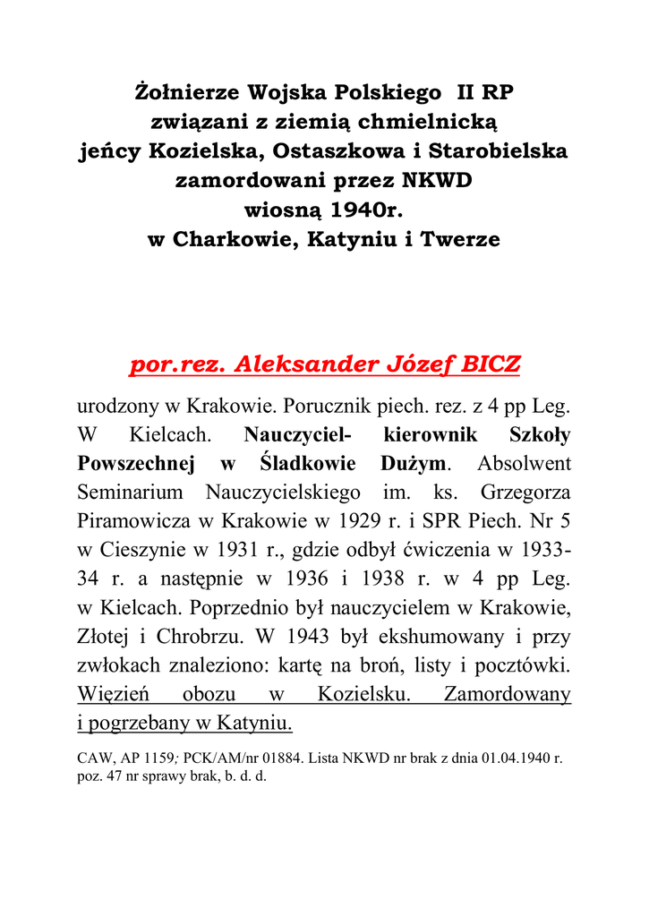 Żołnierze Wojska Polskiego II RP związani z ziemią chmielnicką jeńcy Kozielska, Ostaszkowa i Starobielska zamordowani przez NKWD wiosną 1940r. w Charkowie, Katyniu i Twerze por.rez. Aleksander Józef BICZ urodzony w Krakowie. Porucznik piech. rez. z 4 pp Leg. W Kielcach. Nauczyciel- kierownik Szkoły Powszechnej w Śladkowie Dużym. Absolwent Seminarium Nauczycielskiego im. ks. Grzegorza Piramowicza w Krakowie w 1929 r. i SPR Piech. Nr 5 w Cieszynie w 1931 r., gdzie odbył ćwiczenia w 193334 r. a następnie w 1936 i 1938 r. w 4 pp Leg. w Kielcach. Poprzednio był nauczycielem w Krakowie, Złotej i Chrobrzu. W 1943 był ekshumowany i przy zwłokach znaleziono: kartę na broń, listy i pocztówki. Więzień obozu w Kozielsku. Zamordowany i pogrzebany w Katyniu. CAW, AP 1159; PCK/AM/nr 01884. Lista NKWD nr brak z dnia 01.04.1940 r. poz. 47 nr sprawy brak, b. d. d. por. art.rez. Stanisław PAŁYGA urodzony w Grabowcu. Absolwent Gimnazjum Matematycznego w Kielcach (1930) i SPArt. (1933). Pełnił służbę w 8 pac. W 1939 r. oficer zwiadu 5 baterii art. plot. 5 DP. Prawdopodobnie był kawalerem. b. d. d. Więzień obozu w Starobielsku, zamordowany w Charkowie, pogrzebany w Charkowie- Piatichatkach. L.S. 2630; CAW, Ap 4982; T. Kryska-Karski, Materiały do historii Wojska Polskiego. ppor. rez. Felisk GAWRYŚ urodzony w Osieczku, pow. sandomierski. Absolwent Uniwersytetu Jagiellońskiego (1931) i SPSan. (1932). Po studiach mieszkał i pracował w Chmielniku. Ppor. mianowany ze starszeństwem 01.01.1935 r., przydzielony do 5 Szpitala Okręgowego. Lekarz internista, zamieszkały w Kunowie, pow. opatowski. Żonaty, miał córkę Bogusławę. Więzień obozu w Kozielsku, zamordowany i pogrzebany w Katyniu. CAW, AP 5774; MiD WIH, L.W. 025/1 z 9 IV 1940; AM 1554. ppor. piech. rez. Roman PAWŁOWSKI urodzony w Chmielniku. Ppor. Piech. rez. WP z 76 pp w Grodnie, woj. białostockie. Nauczyciel- kierownik PSP w Sokółce, woj. białostockie. Absolwent Państwowego Seminarium Nauczycielskiego Męskiego w Jędrzejowie w 1920r. i SP Rez. Piech. nr 82 1926r. W Wojsku Polskim służył od 1920r. – uczestnik wojny polsko- bolszewickiej 1919-1920. Walczył w składzie 204 pp. Zdemobilizowany z dniem 05.01.1921r. Mianowany porucznikiem ze starszeństwem 01.09.1929r. z przydziałem do 76 pp. Kierownik Szkoły Powszechnej w Sokólce. Więzień obozu w Starobielsku, zamordowany w Charkowie, pogrzebany w Charkowie-Piatichatkach. b. d. d. L.S. 2517; CAW, Ap 36; ROR 1934. wachm. rez. Władysław MAŁKOWSKI urodzony w Jędrzejówce / obecnie Andrzejówka k/Chmielnika/. Pracownik Nadleśnictwa Ostrołęka, zamieszkały w Durlasach pow. ostrołęcki. W sierpniu 1939 zmobilizowany do Wojska Polskiego Więzień obozu w Ostaszkowie, zamordowany w Twerze, pogrzebany w Miednoje. L. 058/2 (24), 5478- 5-9.05.1940 r.
