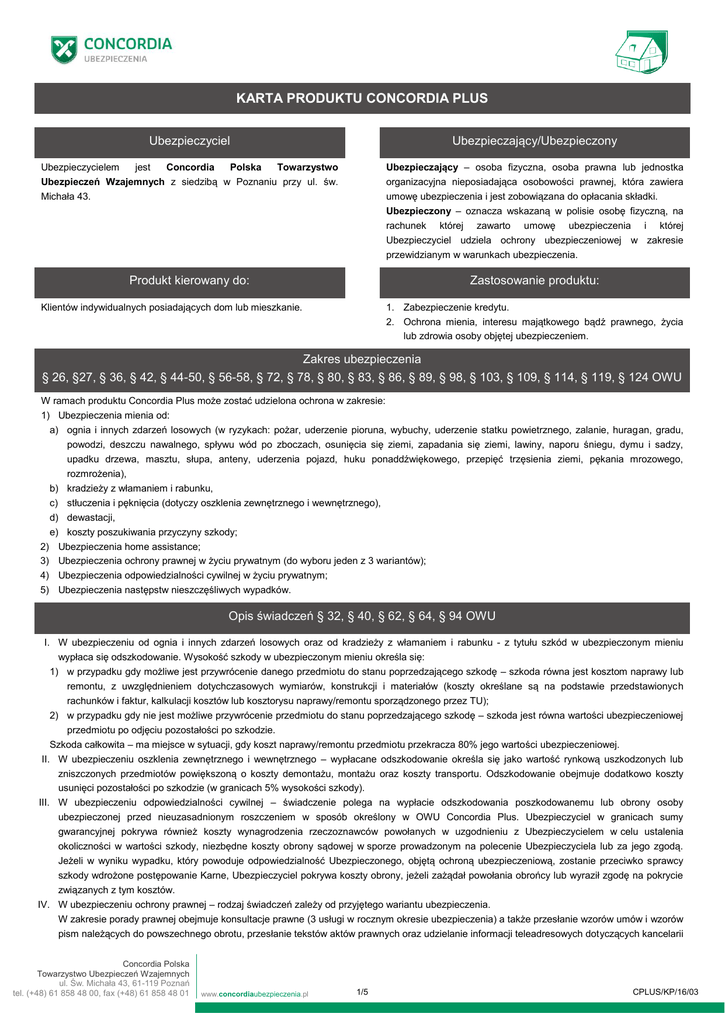 KARTA PRODUKTU CONCORDIA PLUS Ubezpieczyciel Ubezpieczający/Ubezpieczony Ubezpieczycielem jest Concordia Polska Towarzystwo Ubezpieczeń Wzajemnych z siedzibą w Poznaniu przy ul. św. Michała 43. Ubezpieczający – osoba fizyczna, osoba prawna lub jednostka organizacyjna nieposiadająca osobowości prawnej, która zawiera umowę ubezpieczenia i jest zobowiązana do opłacania składki. Ubezpieczony – oznacza wskazaną w polisie osobę fizyczną, na rachunek której zawarto umowę ubezpieczenia i której Ubezpieczyciel udziela ochrony ubezpieczeniowej w zakresie przewidzianym w warunkach ubezpieczenia. Produkt kierowany do: Zastosowanie produktu: Klientów indywidualnych posiadających dom lub mieszkanie. 1. Zabezpieczenie kredytu. 2. Ochrona mienia, interesu majątkowego bądź prawnego, życia lub zdrowia osoby objętej ubezpieczeniem. Zakres ubezpieczenia § 26, §27, § 36, § 42, § 44-50, § 56-58, § 72, § 78, § 80, § 83, § 86, § 89, § 98, § 103, § 109, § 114, § 119, § 124 OWU W ramach produktu Concordia Plus może zostać udzielona ochrona w zakresie: 1) Ubezpieczenia mienia od: a) ognia i innych zdarzeń losowych (w ryzykach: pożar, uderzenie pioruna, wybuchy, uderzenie statku powietrznego, zalanie, huragan, gradu, powodzi, deszczu nawalnego, spływu wód po zboczach, osunięcia się ziemi, zapadania się ziemi, lawiny, naporu śniegu, dymu i sadzy, upadku drzewa, masztu, słupa, anteny, uderzenia pojazd, huku ponaddźwiękowego, przepięć trzęsienia ziemi, pękania mrozowego, rozmrożenia), b) kradzieży z włamaniem i rabunku, c) stłuczenia i pęknięcia (dotyczy oszklenia zewnętrznego i wewnętrznego), d) dewastacji, e) koszty poszukiwania przyczyny szkody; 2) Ubezpieczenia home assistance; 3) Ubezpieczenia ochrony prawnej w życiu prywatnym (do wyboru jeden z 3 wariantów); 4) Ubezpieczenia odpowiedzialności cywilnej w życiu prywatnym; 5) Ubezpieczenia następstw nieszczęśliwych wypadków. Opis świadczeń § 32, § 40, § 62, § 64, § 94 OWU I. W ubezpieczeniu od ognia i innych zdarzeń losowych oraz od kradzieży z włamaniem i rabunku - z tytułu szkód w ubezpieczonym mieniu wypłaca się odszkodowanie. Wysokość szkody w ubezpieczonym mieniu określa się: 1) w przypadku gdy możliwe jest przywrócenie danego przedmiotu do stanu poprzedzającego szkodę – szkoda równa jest kosztom naprawy lub remontu, z uwzględnieniem dotychczasowych wymiarów, konstrukcji i materiałów (koszty określane są na podstawie przedstawionych rachunków i faktur, kalkulacji kosztów lub kosztorysu naprawy/remontu sporządzonego przez TU); 2) w przypadku gdy nie jest możliwe przywrócenie przedmiotu do stanu poprzedzającego szkodę – szkoda jest równa wartości ubezpieczeniowej przedmiotu po odjęciu pozostałości po szkodzie. Szkoda całkowita – ma miejsce w sytuacji, gdy koszt naprawy/remontu przedmiotu przekracza 80% jego wartości ubezpieczeniowej. II. W ubezpieczeniu oszklenia zewnętrznego i wewnętrznego – wypłacane odszkodowanie określa się jako wartość rynkową uszkodzonych lub zniszczonych przedmiotów powiększoną o koszty demontażu, montażu oraz koszty transportu. Odszkodowanie obejmuje dodatkowo koszty usunięci pozostałości po szkodzie (w granicach 5% wysokości szkody). III. W ubezpieczeniu odpowiedzialności cywilnej – świadczenie polega na wypłacie odszkodowania poszkodowanemu lub obrony osoby ubezpieczonej przed nieuzasadnionym roszczeniem w sposób określony w OWU Concordia Plus. Ubezpieczyciel w granicach sumy gwarancyjnej pokrywa również koszty wynagrodzenia rzeczoznawców powołanych w uzgodnieniu z Ubezpieczycielem w celu ustalenia okoliczności w wartości szkody, niezbędne koszty obrony sądowej w sporze prowadzonym na polecenie Ubezpieczyciela lub za jego zgodą. Jeżeli w wyniku wypadku, który powoduje odpowiedzialność Ubezpieczonego, objętą ochroną ubezpieczeniową, zostanie przeciwko sprawcy szkody wdrożone postępowanie Karne, Ubezpieczyciel pokrywa koszty obrony, jeżeli zażądał powołania obrońcy lub wyraził zgodę na pokrycie związanych z tym kosztów. IV. W ubezpieczeniu ochrony prawnej – rodzaj świadczeń zależy od przyjętego wariantu ubezpieczenia. W zakresie porady prawnej obejmuje konsultacje prawne (3 usługi w rocznym okresie ubezpieczenia) a także przesłanie wzorów umów i wzorów pism należących do powszechnego obrotu, przesłanie tekstów aktów prawnych oraz udzielanie informacji teleadresowych dotyczących kancelarii Concordia Polska Towarzystwo Ubezpieczeń Wzajemnych ul. Św. Michała 43, 61-119 Poznań tel. (+48) 61 858 48 00, fax (+48) 61 858 48 01 www.concordiaubezpieczenia.pl 1/5 CPLUS/KP/16/03 KARTA PRODUKTU CONCORDIA PLUS prawnych, notarialnych, biur doradztwa podatkowego, sądów i prokuratur (4 usługi w rocznym okresie ubezpieczenia). W zakresie ubezpieczenia ochrony prawnej Ubezpieczyciel refunduje w zakresie zagwarantowanym w warunkach ubezpieczenia następujące koszty obejmujące niezbędne i celowe wydatki dotyczące obrony interesów prawnych Ubezpieczonego: koszty wynagrodzenia jednego adwokata bądź radcy prawnego, koszty sądowe, zwrot kosztów procesu poniesionych przez stronę przeciwną, koszty postępowania egzekucyjnego, koszty postępowania sądu polubownego, koszty postępowania administracyjnego, koszty poręczenia majątkowego w postępowaniu karnym, koszty notarialne, koszty podróży Ubezpieczonego do sądu zagranicznego, koszty opinii rzeczoznawców w postępowaniu przesądowym. V. W ubezpieczeniu następstw nieszczęśliwych wypadków - rodzaj świadczeń zależy od przyjętego wariantu ubezpieczenia. Śmierć Ubezpieczonego w następstwie nieszczęśliwego wypadku – Ubezpieczyciel wypłaci Uposażonemu sumę ubezpieczenia dotyczącą ryzyka śmierci Ubezpieczonego w następstwie nieszczęśliwego wypadku. Jeżeli zdarzenie nastąpiło w następstwie postrzelenia w trakcie strzelaniny pomiędzy napastnikami i policją lub w następ