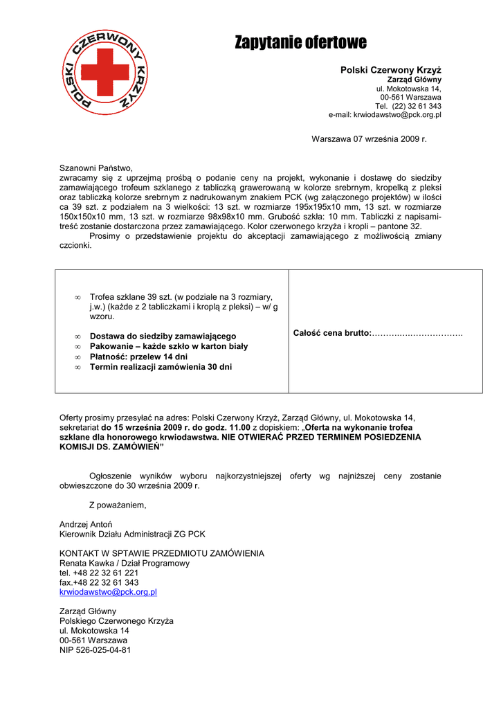 Zapytanie ofertowe Polski Czerwony Krzyż Zarząd Główny ul. Mokotowska 14, 00-561 Warszawa Tel. (22) 32 61 343 e-mail: [email protected] Warszawa 07 września 2009 r. Szanowni Państwo, zwracamy się z uprzejmą prośbą o podanie ceny na projekt, wykonanie i dostawę do siedziby zamawiającego trofeum szklanego z tabliczką grawerowaną w kolorze srebrnym, kropelką z pleksi oraz tabliczką kolorze srebrnym z nadrukowanym znakiem PCK (wg załączonego projektów) w ilości ca 39 szt. z podziałem na 3 wielkości: 13 szt. w rozmiarze 195x195x10 mm, 13 szt. w rozmiarze 150x150x10 mm, 13 szt. w rozmiarze 98x98x10 mm. Grubość szkła: 10 mm. Tabliczki z napisamitreść zostanie dostarczona przez zamawiającego. Kolor czerwonego krzyża i kropli – pantone 32. Prosimy o przedstawienie projektu do akceptacji zamawiającego z możliwością zmiany czcionki. • Trofea szklane 39 szt. (w podziale na 3 rozmiary, j.w.) (każde z 2 tabliczkami i kroplą z pleksi) – w/ g wzoru. • • • • Dostawa do siedziby zamawiającego Pakowanie – każde szkło w karton biały Płatność: przelew 14 dni Termin realizacji zamówienia 30 dni Całość cena brutto:……….….………………. Oferty prosimy przesyłać na adres: Polski Czerwony Krzyż, Zarząd Główny, ul. Mokotowska 14, sekretariat do 15 września 2009 r. do godz. 11.00 z dopiskiem: „Oferta na wykonanie trofea szklane dla honorowego krwiodawstwa. NIE OTWIERAĆ PRZED TERMINEM POSIEDZENIA KOMISJI DS. ZAMÓWIEŃ” Ogłoszenie wyników wyboru najkorzystniejszej obwieszczone do 30 września 2009 r. Z poważaniem, Andrzej Antoń Kierownik Działu Administracji ZG PCK KONTAKT W SPTAWIE PRZEDMIOTU ZAMÓWIENIA Renata Kawka / Dział Programowy tel. +48 22 32 61 221 fax.+48 22 32 61 343 [email protected] Zarząd Główny Polskiego Czerwonego Krzyża ul. Mokotowska 14 00-561 Warszawa NIP 526-025-04-81 oferty wg najniższej ceny zostanie
