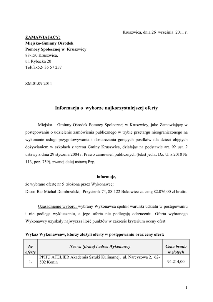 Kruszwica, dnia 26 września 2011 r. ZAMAWIAJĄCY: Miejsko-Gminny Ośrodek Pomocy Społecznej w Kruszwicy 88-150 Kruszwica, ul. Rybacka 20 Tel/fax52- 35 57 257 ZM.01.09.2011 Informacja o wyborze najkorzystniejszej oferty Miejsko – Gminny Ośrodek Pomocy Społecznej w Kruszwicy, jako Zamawiający w postępowaniu o udzielenie zamówienia publicznego w trybie przetargu nieograniczonego na wykonanie usługi przygotowywania i dostarczania gorących posiłków dla dzieci objętych doŜywianiem w szkołach z terenu Gminy Kruszwica, działając na podstawie art. 92 ust. 2 ustawy z dnia 29 stycznia 2004 r. Prawo zamówień publicznych (tekst jedn.: Dz. U. z 2010 Nr 113, poz. 759), zwanej dalej ustawą Pzp, informuje, Ŝe wybrano ofertę nr 5 złoŜona przez Wykonawcę: Disco-Bar Michał Dombrzalski, Przysiersk 74, 88-122 Bukowiec za cenę 82.076,00 zł brutto. Uzasadnienie wyboru: wybrany Wykonawca spełnił warunki udziału w postępowaniu i nie podlega wykluczeniu, a jego oferta nie podlegają odrzuceniu. Oferta wybranego Wykonawcy uzyskały najwyŜszą ilość punktów w zakresie kryterium oceny ofert. Wykaz Wykonawców, którzy złoŜyli oferty w postępowaniu oraz ceny ofert: Nr oferty 1. Nazwa (firma) i adres Wykonawcy PPHU ATELIER Akademia Sztuki Kulinarnej, ul. Narcyzowa 2, 62502 Konin Cena brutto w złotych 94.214,00 1 2. IMPEL Catering Sp. z o. o. ul. ŚlęŜna 118,53-111 Wroclaw Restauracja SZUM LASU S Stefan Augustyniak Suchatówka 14, 88140 Gniewkowo 3. 116.178,00 138.720,00 4. MAŁA GASTRONOMIA Edward Gugała, ul. Mickiewicza 22, 88150 Kruszwica 102.884,00 5. Disco-Bar Michał Dombrzalski, Przysiersk 74, 88-122 Bukowiec 82.076,00 6. CES „SERVITUS” ul. Szosa Bydgoska 1a, 87-100 Toruń Restauracja EDEN Grzegorz Świtała, ul. Sobieskiego 25, 88-140 Gniewkowo 90.457,00 7. 100.861,00 Punktacja przyznana ofertom wg kryterium oceny ofert i łączna punktacja: Nr oferty 1. 2. 3. 4. 5. 6. 7. Nazwa (firma) i adres Wykonawcy PPHU ATELIER Akademia Sztuki Kulinarnej, ul. Narcyzowa 2, 62-502 Konin IMPEL Catering Sp. z o. o. ul. ŚlęŜna 118, 53-111 Wroclaw Restauracja SZUM LASU S Stefan Augustyniak Suchatówka 14, 88-140 Gniewkowo MAŁA GASTRONOMIA Edward Gugała, ul. Mickiewicza 22, 88-150 Kruszwica Disco-Bar Michał Dombrzalski, Przysiersk 74, 88-122 Bukowiec CES „SERVITUS” ul. Szosa Bydgoska 1a, 87-100 Toruń Restauracja EDEN Grzegorz Świtała, ul. Sobieskiego 25, 88-140 Gniewkowo Cena ofertowa brutto (zł) Razem ilość punktów 94.214,00 Ilość punktów w kryterium cena - waga kryterium 100 % 87,12 116.178,00 70,65 70,65 87,12 138.720,00 Wykonawca wykluczony 102.884,00 Wykonawca wykluczony 82.076,00 100,00 100,00 90.457,00 Oferta odrzucona 100.861,00 81,38 81,38 2