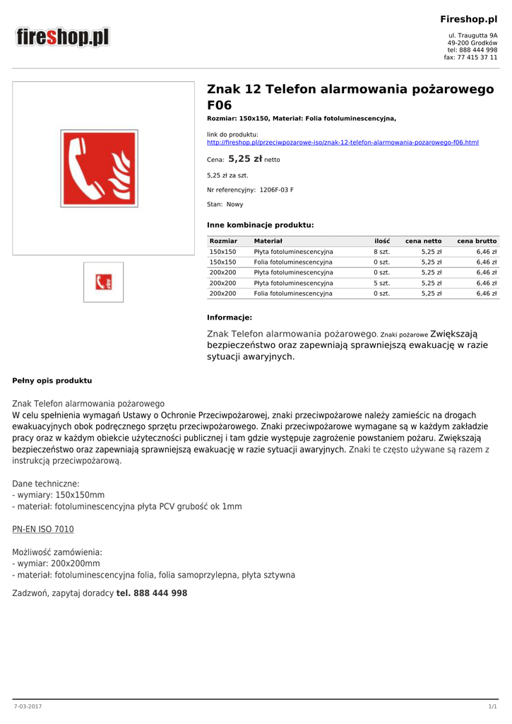 Fireshop.pl ul. Traugutta 9A 49-200 Grodków tel: 888 444 998 fax: 77 415 37 11 Znak 12 Telefon alarmowania pożarowego F06 Rozmiar: 150x150, Materiał: Folia fotoluminescencyjna, link do produktu: http://fireshop.pl/przeciwpozarowe-iso/znak-12-telefon-alarmowania-pozarowego-f06.html Cena: 5,25 zł netto 5,25 zł za szt. Nr referencyjny: 1206F-03 F Stan: Nowy Inne kombinacje produktu: Rozmiar Materiał ilość cena netto cena brutto 150x150 Płyta fotoluminescencyjna 8 szt. 5,25 zł 6,46 zł 150x150 Folia fotoluminescencyjna 0 szt. 5,25 zł 6,46 zł 200x200 Płyta fotoluminescencyjna 0 szt. 5,25 zł 6,46 zł 200x200 Płyta fotoluminescencyjna 5 szt. 5,25 zł 6,46 zł 200x200 Folia fotoluminescencyjna 0 szt. 5,25 zł 6,46 zł Informacje: Znak Telefon alarmowania pożarowego. Znaki pożarowe Zwiększają bezpieczeństwo oraz zapewniają sprawniejszą ewakuację w razie sytuacji awaryjnych. Pełny opis produktu Znak Telefon alarmowania pożarowego W celu spełnienia wymagań Ustawy o Ochronie Przeciwpożarowej, znaki przeciwpożarowe należy zamieścic na drogach ewakuacyjnych obok podręcznego sprzętu przeciwpożarowego. Znaki przeciwpożarowe wymagane są w każdym zakładzie pracy oraz w każdym obiekcie użyteczności publicznej i tam gdzie występuje zagrożenie powstaniem pożaru. Zwiększają bezpieczeństwo oraz zapewniają sprawniejszą ewakuację w razie sytuacji awaryjnych. Znaki te często używane są razem z instrukcją przeciwpożarową. Dane techniczne: - wymiary: 150x150mm - materiał: fotoluminescencyjna płyta PCV grubość ok 1mm PN-EN ISO 7010 Możliwość zamówienia: - wymiar: 200x200mm - materiał: fotoluminescencyjna folia, folia samoprzylepna, płyta sztywna Zadzwoń, zapytaj doradcy tel. 888 444 998 7-03-2017 1/1