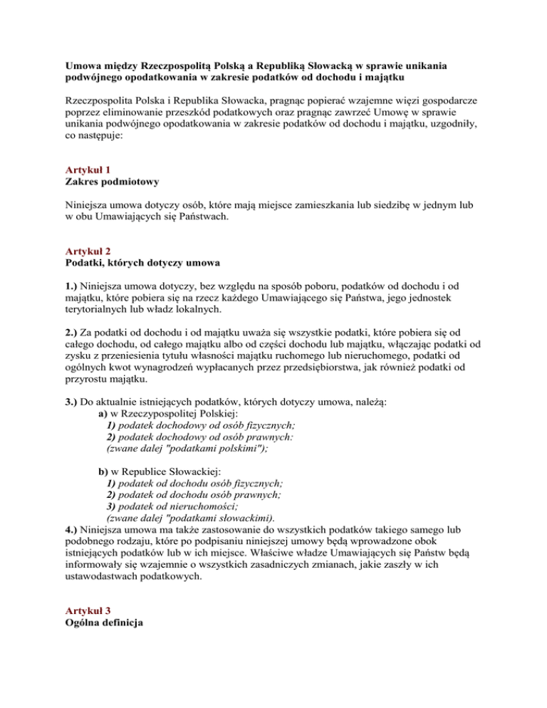 Umowa między Rzeczpospolitą Polską a Republiką Słowacką w sprawie unikania podwójnego opodatkowania w zakresie podatków od dochodu i majątku Rzeczpospolita Polska i Republika Słowacka, pragnąc popierać wzajemne więzi gospodarcze poprzez eliminowanie przeszkód podatkowych oraz pragnąc zawrzeć Umowę w sprawie unikania podwójnego opodatkowania w zakresie podatków od dochodu i majątku, uzgodniły, co następuje: Artykuł 1 Zakres podmiotowy Niniejsza umowa dotyczy osób, które mają miejsce zamieszkania lub siedzibę w jednym lub w obu Umawiających się Państwach. Artykuł 2 Podatki, których dotyczy umowa 1.) Niniejsza umowa dotyczy, bez względu na sposób poboru, podatków od dochodu i od majątku, które pobiera się na rzecz każdego Umawiającego się Państwa, jego jednostek terytorialnych lub władz lokalnych. 2.) Za podatki od dochodu i od majątku uważa się wszystkie podatki, które pobiera się od całego dochodu, od całego majątku albo od części dochodu lub majątku, włączając podatki od zysku z przeniesienia tytułu własności majątku ruchomego lub nieruchomego, podatki od ogólnych kwot wynagrodzeń wypłacanych przez przedsiębiorstwa, jak również podatki od przyrostu majątku. 3.) Do aktualnie istniejących podatków, których dotyczy umowa, należą: a) w Rzeczypospolitej Polskiej: 1) podatek dochodowy od osób fizycznych; 2) podatek dochodowy od osób prawnych: (zwane dalej "podatkami polskimi"); b) w Republice Słowackiej: 1) podatek od dochodu osób fizycznych; 2) podatek od dochodu osób prawnych; 3) podatek od nieruchomości; (zwane dalej "podatkami słowackimi). 4.) Niniejsza umowa ma także zastosowanie do wszystkich podatków takiego samego lub podobnego rodzaju, które po podpisaniu niniejszej umowy będą wprowadzone obok istniejących podatków lub w ich miejsce. Właściwe władze Umawiających się Państw będą informowały się wzajemnie o wszystkich zasadniczych zmianach, jakie zaszły w ich ustawodastwach podatkowych. Artykuł 3 Ogólna definicja 1.) W rozumieniu niniejszej umowy, jeżeli z kontekstu nie wynika inaczej: a) określenie "Polska" użyte w sensie geograficznym oznacza terytorium Rzeczypospolitej Polskiej, w tym każdy obszar poza jej wodami terytorialnymi, na którym na mocy ustawodawstwa Polski i zgodnie z prawem międzynarodowym Polska może sprawować suwerenne prawa do dna morskiego, jego podglebia i ich zasobów naturalnych; b) określenie "Słowacja" oznacza Republikę Słowacką; c) określenia "Umawiające się Państwo" i "drugie Umawiające się Państwo" oznaczają, zależnie od kontekstu, Polskę lub Republikę Słowacką; d) określenie "osoba" obejmuje osobę fizyczną, spółkę oraz każde inne zrzeszenie osób; e) określenie "spółka" oznacza każdą osobę prawną lub każdą jednostkę, którą dla celów podatkowych traktuje się jako osobę prawną; f) określenia "przedsiębiorstwo jednego Umawiającego się Państwa" i "przedsiębiorstwo drugiego Umawiającego się Państwa" oznaczają odpowiednio przedsiębiorstwo prowadzone przez osobę mającą miejsce zamieszkania lub siedzibę w Umawiającym się Państwie i przedsiębiorstwo prowadzone przez osobę mającą miejsce zamieszkania lub siedzibę w drugim Umawiającym się Państwie; g) określenie "obywatel" oznacza: 1) wszelkie osoby fizyczne, posiadające obywatelstwo Umawiającego się Państwa; 2) wszelkie osoby prawne, spółki osobowe i stowarzyszenia utworzone na podstawie ustawodawstwa obowiązującego w Umawiającym się Państwie; h) określenie "komunikacja międzynarodowa" oznacza wszelki transport statkiem, statkiem powietrznym, koleją lub pojazdem drogowym eksploatowanym przez przedsiębiorstwo, którego miejsce faktycznego zarządu znajduje się w Umawiającym się Państwie, z wyjątkiem przypadku, gdy taki transport jest wykonywany wyłącznie między miejscami położonymi w drugim umawiającym się Państwie; i) określenie "właściwe władze" oznacza: 1) w przypadku Polski - Ministra Finansów lub jego upoważnionego przedstawiciela; 2) w przypadku Republiki Słowackiej - Ministra Finansów lub jego upoważnionego przedstawiciela. 2.) Przy stosowaniu niniejszej umowy przez Umawiające się Państwo, jeżeli z kontekstu nie wynika inaczej, każde określenie w niej nie zdefiniowane będzie miało takie znaczenie, jakie przyjmuje się według prawa tego państwa w zakresie podatków, do których ma zastosowanie niniejsza umowa. Artykuł 4 Miejsce zamieszkania lub siedziba 1.) W rozumieniu niniejszej umowy określenie "osoba mająca miejsce zamieszkania lub siedzibę w Umawiającym się Państwie" oznacza każdą osobę, która zgodnie z prawem tego Państwa podlega tam opodatkowaniu z uwagi na miejsce zamieszkania, miejsce stałego pobytu, miejsce zarządu albo inne kryterium o podobnym charakterze. Określenie powyższe nie obejmuje żadnej osoby, która podlega opodatkowaniu w tym Państwie w zakresie dochodu osiąganego ze źródła tylko w tym Państwie lub z tytułu majątku położonego w tym Państwie. 2.) Jeżeli stosownie do postanowień ustępu 1 osoba fizyczna ma miejsce zamieszkania w obu Umawiających się Państwach, to jej status określa się w następujący sposób: a) osobę uważa się za mającą miejsce zamieszkania w tym Umawiającym się Państwie, w którym ma ona stałe miejsce zamieszkania; jeżeli ma ona stałe miejsce w obu Umawiających się Państwach, to uważa się ją za mającą miejsce zamieszkania w tym Umawiającym się Państwie, w którym znajduje się ośrodek jej interesów osobistych i gospodarczych (ośrodek interesów życiowych); b) jeżeli nie można ustalić, w którym Umawiającym się Państwie osoba ma ośrodek interesów życiowych, albo, jeżeli nie posiada ona stałego miejsca zamieszkania w żadnym u Umawiających się Państw, to uważa się, że ma ona miejsce zamieszkania w tym Umawiającym się Państwie, w którym zwykle przebywa; c) jeżeli przebywa ona 