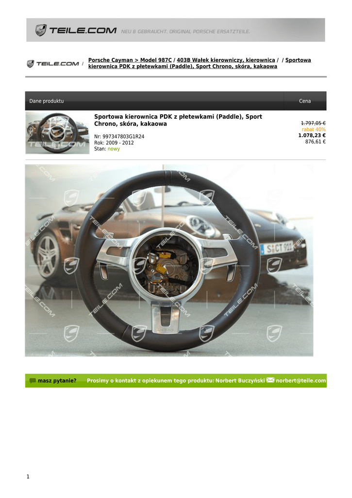 Porsche Cayman > Model 987C / 403B Wałek kierowniczy, kierownica / / Sportowa kierownica PDK z płetewkami (Paddle), Sport Chrono, skóra, kakaowa Dane produktu Cena Sportowa kierownica PDK z płetewkami (Paddle), Sport Chrono, skóra, kakaowa Nr: 997347803G1R24 Rok: 2009 - 2012 Stan: nowy masz pytanie? 1 Prosimy o kontakt z opiekunem tego produktu: Norbert Buczyński 1.797,05 € rabat 40% 1.078,23 € 876,61 € [email protected]