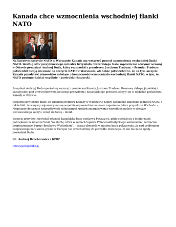 Kanada chce wzmocnienia wschodniej flanki NATO Na lipcowym szczycie NATO w Warszawie Kanada ma wesprzeć pomysł wzmocnienia wschodniej flanki NATO. Według słów prezydenckiego ministra Krzysztofa Szczerskiego takie zapewnienie otrzymał wczoraj w Ottawie prezydent Andrzej Duda, który rozmawiał z premierem Justinem Trudeau. – Premier Trudeau potwierdził swoją obecność na szczycie NATO w Warszawie, ale także potwierdził to, że na tym szczycie Kanada przedstawi stanowisko mówiące o konieczności wzmocnienia wschodniej flanki NATO, o tym, że NATO powinno działać wspólnie – powiedział Szczerski. Prezydent Andrzej Duda spotkał się wczoraj z premierem Kanady Justinem Trudeau. Rozmowy delegacji polskiej i kanadyjskiej pod przewodnictwem polskiego prezydenta i kanadyjskiego premiera odbyły się w siedzibie parlamentu Kanady w Ottawie. Szczerski powiedział także, że zdaniem premiera Kanady w Warszawie należy podkreślić znaczenie jedności NATO, a także fakt, że wszyscy sojusznicy muszą wspólnie odpowiedzieć na nowe zagrożenie, które przyszło ze Wschodu. – Negocjacje dotyczące szczegółowych technicznych ustaleń zaangażowania wszystkich państw w decyzje warszawskiego szczytu wciąż się toczą – dodał. Wczoraj prezydent odwiedził również kanadyjską bazę wojskową Petawawa, gdzie spotkał się z żołnierzami i podziękował w imieniu Polski "za służbę, która w ramach Sojuszu Północnoatlantyckiego wzmacniała i wzmacnia bezpieczeństwo Europy Środkowo-Wschodniej". – Wasza obecność w naszym kraju pokazywała, że nad problemem bezprawnego naruszenia granic w Europie nie przechodzimy do porządku dziennego, że nie ma na to zgody – powiedział Duda. fot. Andrzej Hrechorowicz / KPRP telewizjarepublika.pl