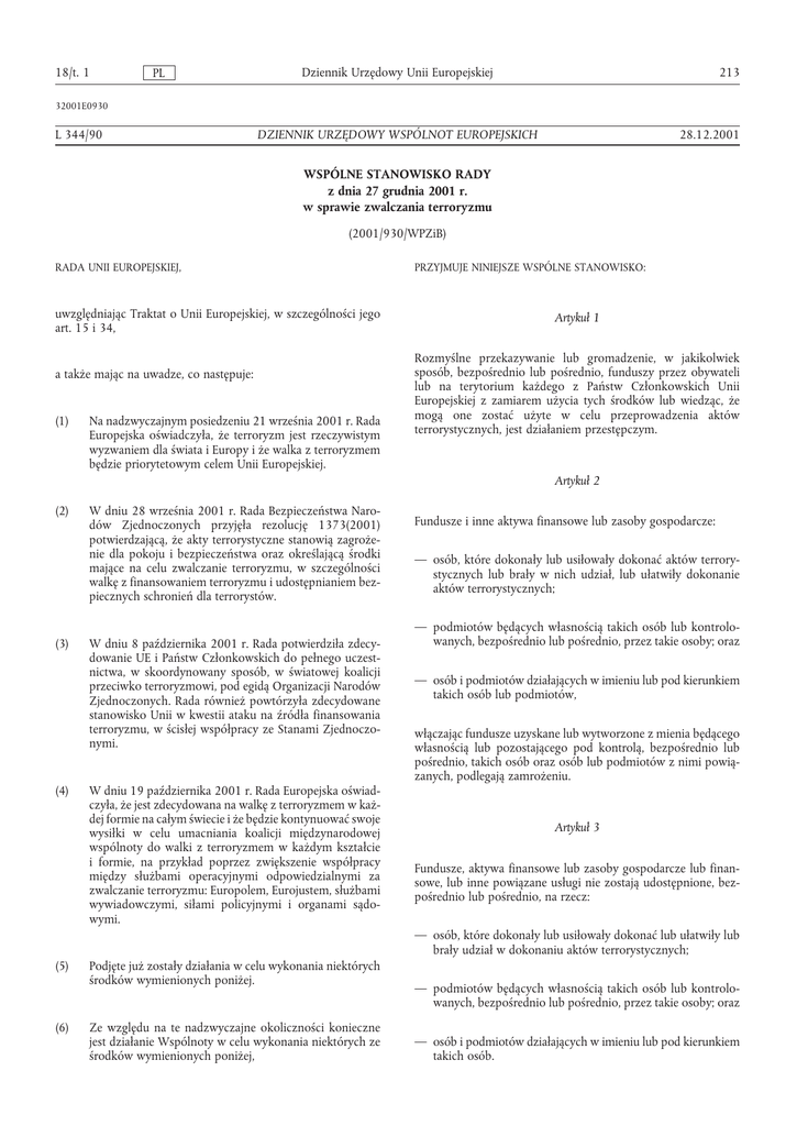 18/t. 1 PL Dziennik Urzędowy Unii Europejskiej 213 32001E0930 L 344/90 DZIENNIK URZĘDOWY WSPÓLNOT EUROPEJSKICH 28.12.2001 WSPÓLNE STANOWISKO RADY z dnia 27 grudnia 2001 r. w sprawie zwalczania terroryzmu (2001/930/WPZiB) RADA UNII EUROPEJSKIEJ, uwzględniając Traktat o Unii Europejskiej, w szczególności jego art. 15 i 34, a także mając na uwadze, co następuje: (1) Na nadzwyczajnym posiedzeniu 21 września 2001 r. Rada Europejska oświadczyła, że terroryzm jest rzeczywistym wyzwaniem dla świata i Europy i że walka z terroryzmem będzie priorytetowym celem Unii Europejskiej. PRZYJMUJE NINIEJSZE WSPÓLNE STANOWISKO: Artykuł 1 Rozmyślne przekazywanie lub gromadzenie, w jakikolwiek sposób, bezpośrednio lub pośrednio, funduszy przez obywateli lub na terytorium każdego z Państw Członkowskich Unii Europejskiej z zamiarem użycia tych środków lub wiedząc, że mogą one zostać użyte w celu przeprowadzenia aktów terrorystycznych, jest działaniem przestępczym. Artykuł 2 (2) (3) (4) W dniu 28 września 2001 r. Rada Bezpieczeństwa Narodów Zjednoczonych przyjęła rezolucję 1373(2001) potwierdzającą, że akty terrorystyczne stanowią zagrożenie dla pokoju i bezpieczeństwa oraz określającą środki mające na celu zwalczanie terroryzmu, w szczególności walkę z finansowaniem terroryzmu i udostępnianiem bezpiecznych schronień dla terrorystów. W dniu 8 października 2001 r. Rada potwierdziła zdecydowanie UE i Państw Członkowskich do pełnego uczestnictwa, w skoordynowany sposób, w światowej koalicji przeciwko terroryzmowi, pod egidą Organizacji Narodów Zjednoczonych. Rada również powtórzyła zdecydowane stanowisko Unii w kwestii ataku na źródła finansowania terroryzmu, w ścisłej współpracy ze Stanami Zjednoczonymi. W dniu 19 października 2001 r. Rada Europejska oświadczyła, że jest zdecydowana na walkę z terroryzmem w każdej formie na całym świecie i że będzie kontynuować swoje wysiłki w celu umacniania koalicji międzynarodowej wspólnoty do walki z terroryzmem w każdym kształcie i formie, na przykład poprzez zwiększenie współpracy między służbami operacyjnymi odpowiedzialnymi za zwalczanie terroryzmu: Europolem, Eurojustem, służbami wywiadowczymi, siłami policyjnymi i organami sądowymi. Fundusze i inne aktywa finansowe lub zasoby gospodarcze: — osób, które dokonały lub usiłowały dokonać aktów terrorystycznych lub brały w nich udział, lub ułatwiły dokonanie aktów terrorystycznych; — podmiotów będących własnością takich osób lub kontrolowanych, bezpośrednio lub pośrednio, przez takie osoby; oraz — osób i podmiotów działających w imieniu lub pod kierunkiem takich osób lub podmiotów, włączając fundusze uzyskane lub wytworzone z mienia będącego własnością lub pozostającego pod kontrolą, bezpośrednio lub pośrednio, takich osób oraz osób lub podmiotów z nimi powiązanych, podlegają zamrożeniu. Artykuł 3 Fundusze, aktywa finansowe lub zasoby gospodarcze lub finansowe, lub inne powiązane usługi nie zostają udostępnione, bezpośrednio lub pośrednio, na rzecz: — osób, które dokonały lub usiłowały dokonać lub ułatwiły lub brały udział w dokonaniu aktów terrorystycznych; (5) (6) Podjęte już zostały działania w celu wykonania niektórych środków wymienionych poniżej. Ze względu na te nadzwyczajne okoliczności konieczne jest działanie Wspólnoty w celu wykonania niektórych ze środków wymienionych poniżej, — podmiotów będących własnością takich osób lub kontrolowanych, bezpośrednio lub pośrednio, przez takie osoby; oraz — osób i podmiotów działających w imieniu lub pod kierunkiem takich osób. 214 Dziennik Urzędowy Unii Europejskiej PL 18/t. 1 Artykuł 4 Artykuł 11 W celu zwalczania każdej formy wspierania, czynnego lub biernego, podmiotów lub osób związanych z aktami terrorystycznymi, podejmuje się środki włącznie ze środkami mającymi na celu zwalczanie werbowania członków grup terrorystycznych i eliminowanie zaopatrywania terrorystów w broń. Podejmuje się kroki w celu zwiększenia i przyspieszenia wymiany informacji operacyjnych, szczególnie dotyczących działań lub przemieszczania się terrorystów lub siatek terrorystycznych; podrobionych lub sfałszowanych dokumentów podróży; handlu bronią, materiałami wybuchowymi lub materiałami wrażliwymi; stosowania technologii łączności przez grupy terrorystyczne; a także zagrożenia stwarzanego przez posiadanie broni masowego rażenia przez grupy terrorystyczne. Artykuł 5 Podejmuje się kroki w celu zapobieżenia dokonywania aktów terrorystycznych, włączając w to zapewnienie wczesnego ostrzegania między Państwami Członkowskimi lub między Państwami Członkowskimi i państwami trzecimi poprzez wymianę informacji. Artykuł 6 Odmawia się bezpiecznego schronienia tym, którzy finansują, planują, wspierają lub dokonują aktów terrorystycznych, lub zapewniają bezpieczne schronienie. Artykuł 7 Osobom, które finansują, planują, ułatwiają lub dokonują aktów terrorystycznych, uniemożliwia się wykorzystywanie terytoriów Państw Członkowskich Unii Europejskiej w tych celach, skierowanych przeciwko Państwom Członkowskim lub państwom trzecim lub ich obywatelom. Artykuł 8 Osoby, które uczestniczą w finansowaniu, planowaniu, przygotowywaniu lub dokonywaniu aktów terrorystycznych lub we wspieraniu aktów terrorystycznych, zostają postawione przed sądem; takie akty terrorystyczne uznaje się w przepisach ustawowych i wykonawczych Państw Członkowskich za poważne przestępstwa, a kara należycie odzwierciedla wagę takich aktów terrorystycznych. Artykuł 9 Państwa Członkowskie zapewniają sobie wzajemnie, jak również państwom trzecim, najszerszą możliwą pomoc w związku z dochodzeniami kryminalnymi lub postępowaniami kryminalnymi odnoszącymi się do finansowania lub wspierania aktów terrorystycznych, zgodnie z prawem międzynarodo