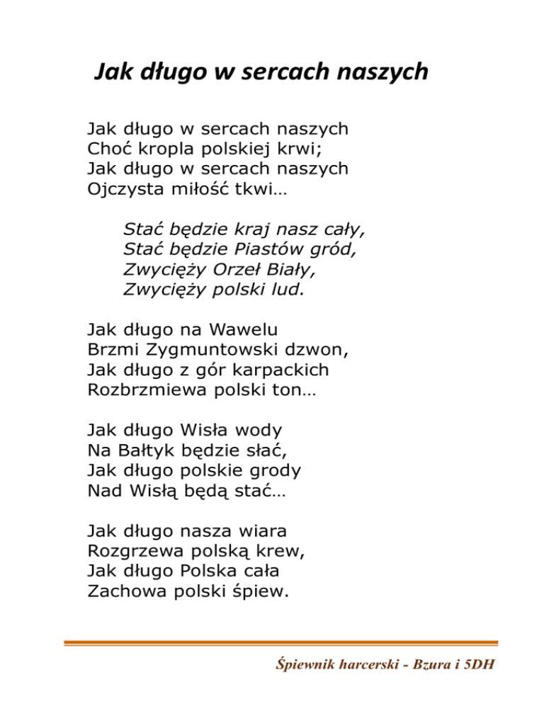 Jak długo w sercach naszych Jak długo w sercach naszych Choć kropla polskiej krwi; Jak długo w sercach naszych Ojczysta miłość tkwi… Stać będzie kraj nasz cały, Stać będzie Piastów gród, Zwycięży Orzeł Biały, Zwycięży polski lud. Jak długo na Wawelu Brzmi Zygmuntowski dzwon, Jak długo z gór karpackich Rozbrzmiewa polski ton… Jak długo Wisła wody Na Bałtyk będzie słać, Jak długo polskie grody Nad Wisłą będą stać… Jak długo nasza wiara Rozgrzewa polską krew, Jak długo Polska cała Zachowa polski śpiew. Śpiewnik harcerski - Bzura i 5DH