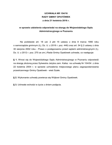 UCHWA A NR 154/16 RADY GMINY OPATÓWEK z dnia 21 kwietnia 2016 r. w sprawie udzielenia odpowiedzi na skarg- do Wojewódzkiego S1du Administracyjnego w Poznaniu Na podstawie art. 18 ust. 2 pkt 15 ustawy z dnia 8 marca 1990 roku o samorz dzie gminnym (t.j. Dz. U. z 2016 r. poz. 446) oraz art. 54 § 2 ustawy z dnia 30 sierpnia 2002 roku - Prawo o post(powaniu przed s dami administracyjnymi (t.j. Dz. U. z 2012 r. poz. 270 ze zm.) Rada Gminy Opatówek uchwala, co nast(puje: § 1. Wnosi si( do Wojewódzkiego S du Administracyjnego w Poznaniu odpowied5 na skarg( z6o7on przez Sylwestra Je7yka zam. Kalisz na uchwa6( Nr 104/04 z dnia 22 kwietnia 2004 r. w sprawie uchwalenia miejscowego planu zagospodarowania przestrzennego Gminy Opatówek - wie; Sza6e. § 2. Wykonanie uchwa6y powierza si( Wójtowi Gminy Opatówek. § 3. Uchwa6a wchodzi w 7ycie z dniem podj(cia. UZASADNIENIE do Uchwa9y Nr 154/16 Rady Gminy Opatówek z dnia 21 kwietnia 2016 r. w sprawie udzielenia odpowiedzi na skarg- do Wojewódzkiego S1du Administracyjnego w Poznaniu Zgodnie z art. 54 ustawy z dnia 30 sierpnia 2012 r. - Prawo o post(powaniu przed s dami administracyjnymi (t.j. Dz. U. z 2012 r. poz. 270 ze zm.) skarg( do s du administracyjnego wnosi si( za po;rednictwem organu, którego dzia6anie jest przedmiotem skargi. Organ gminy obowi zany jest przekaza> skarg( w6a;ciwemu s dowi wraz z aktami sprawy i odpowiedzi na skarg( w terminie trzydziestu dni od dnia jej wniesienia. W zwi zku z powy7szym podj(cie uchwa6y jest uzasadnione.