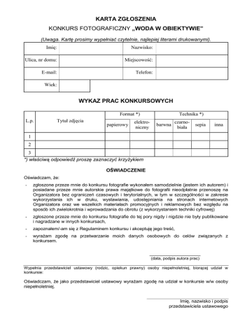 KARTA ZGŁOSZENIA KONKURS FOTOGRAFICZNY „WODA W OBIEKTYWIE” (Uwaga. Kartę prosimy wypełniać czytelnie, najlepiej literami drukowanymi). Imię: Nazwisko: Ulica, nr domu: Miejscowość: E-mail: Telefon: Wiek: WYKAZ PRAC KONKURSOWYCH Format *) L.p. Tytuł zdjęcia papierowy Technika *) elektroniczny barwna czarnobiała sepia inna 1 2 3 *) właściwą odpowiedź proszę zaznaczyć krzyŜykiem OŚWIADCZENIE Oświadczam, Ŝe: - zgłoszone przeze mnie do konkursu fotografie wykonałem samodzielnie (jestem ich autorem) i posiadane przeze mnie autorskie prawa majątkowe do fotografii nieodpłatnie przenoszę na Organizatora bez ograniczeń czasowych i terytorialnych, w tym w szczególności w zakresie wykorzystania ich w druku, wystawiania, udostępniania na stronach internetowych Organizatora oraz we wszelkich materiałach promocyjnych i reklamowych bez względu na sposób ich zwielokrotnia i wprowadzania do obrotu (z wykorzystaniem techniki cyfrowej) - zgłoszone przeze mnie do konkursu fotografie do tej pory nigdy i nigdzie nie były publikowane i nagradzane w innych konkursach, - zapoznałem/-am się z Regulaminem konkursu i akceptuję jego treść, - wyraŜam zgodę na przetwarzanie moich danych osobowych do celów związanych z konkursem. __________________ (data, podpis autora prac) Wypełnia przedstawiciel ustawowy (rodzic, opiekun prawny) osoby niepełnoletniej, biorącej udział w konkursie: Oświadczam, Ŝe jako przedstawiciel ustawowy wyraŜam zgodę na udział w konkursie w/w osoby niepełnoletniej. Imię, nazwisko i podpis przedstawiciela ustawowego