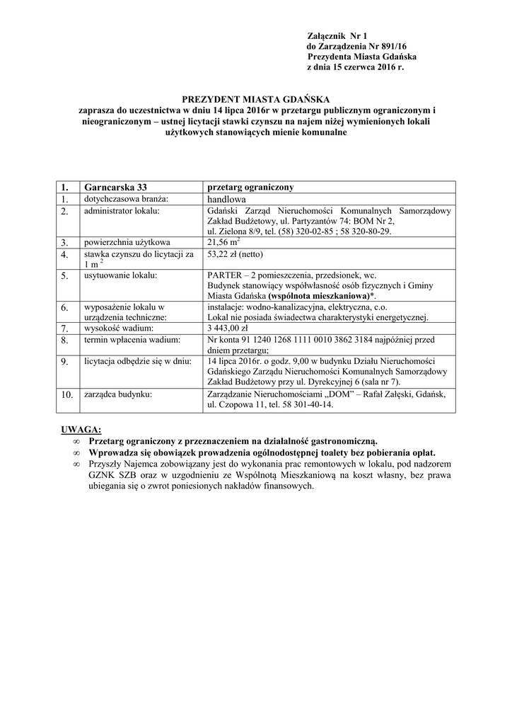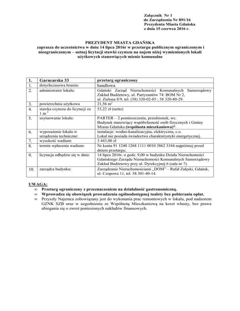 Załącznik Nr 1 do Zarządzenia Nr 891/16 Prezydenta Miasta Gdańska z dnia 15 czerwca 2016 r. PREZYDENT MIASTA GDAŃSKA zaprasza do uczestnictwa w dniu 14 lipca 2016r w przetargu publicznym ograniczonym i nieograniczonym – ustnej licytacji stawki czynszu na najem niżej wymienionych lokali użytkowych stanowiących mienie komunalne 1. 1. 2. 3. 4. 5. Garncarska 33 dotychczasowa branża: administrator lokalu: powierzchnia użytkowa stawka czynszu do licytacji za 1m2 usytuowanie lokalu: 7. 8. wyposażenie lokalu w urządzenia techniczne: wysokość wadium: termin wpłacenia wadium: 9. licytacja odbędzie się w dniu: 10. zarządca budynku: 6. przetarg ograniczony handlowa Gdański Zarząd Nieruchomości Komunalnych Samorządowy Zakład Budżetowy, ul. Partyzantów 74: BOM Nr 2, ul. Zielona 8/9, tel. (58) 320-02-85 ; 58 320-80-29. 21,56 m2 53,22 zł (netto) PARTER – 2 pomieszczenia, przedsionek, wc. Budynek stanowiący współwłasność osób fizycznych i Gminy Miasta Gdańska (wspólnota mieszkaniowa)*. instalacje: wodno-kanalizacyjna, elektryczna, c.o. Lokal nie posiada świadectwa charakterystyki energetycznej. 3 443,00 zł Nr konta 91 1240 1268 1111 0010 3862 3184 najpóźniej przed dniem przetargu; 14 lipca 2016r. o godz. 9,00 w budynku Działu Nieruchomości Gdańskiego Zarządu Nieruchomości Komunalnych Samorządowy Zakład Budżetowy przy ul. Dyrekcyjnej 6 (sala nr 7). Zarządzanie Nieruchomościami „DOM” – Rafał Załęski, Gdańsk, ul. Czopowa 11, tel. 58 301-40-14. UWAGA: • Przetarg ograniczony z przeznaczeniem na działalność gastronomiczną. • Wprowadza się obowiązek prowadzenia ogólnodostępnej toalety bez pobierania opłat. • Przyszły Najemca zobowiązany jest do wykonania prac remontowych w lokalu, pod nadzorem GZNK SZB oraz w uzgodnieniu ze Wspólnotą Mieszkaniową na koszt własny, bez prawa ubiegania się o zwrot poniesionych nakładów finansowych. 2. 1. 2. 3. 4. 5. Jana Husa 15 dotychczasowa branża: administrator lokalu: powierzchnia użytkowa stawka czynszu do licytacji za 1m2 usytuowanie lokalu: 7. 8. wyposażenie lokalu w urządzenia techniczne: wysokość wadium: termin wpłacenia wadium: 9. licytacja odbędzie się w dniu: 10. zarządca budynku: 6. usługowa Gdański Zarząd Nieruchomości Komunalnych Samorządowy Zakład Budżetowy, ul. Partyzantów 74: BOM Nr 7, ul. Mściwoja II 44, tel. (58) 512-30-56. 19,92 m2 27,77 zł (netto) PARTER – 1 pomieszczenie, wc. Budynek stanowiący współwłasność osób fizycznych i Gminy Miasta Gdańska (wspólnota mieszkaniowa)*. instalacje: wodno-kanalizacyjna, elektryczna. Lokal nie posiada świadectwa charakterystyki energetycznej. 1 660,00 zł Nr konta 91 1240 1268 1111 0010 3862 3184 najpóźniej przed dniem przetargu; 14 lipca 2016r. o godz. 9,20 w budynku Działu Nieruchomości Gdańskiego Zarządu Nieruchomości Komunalnych Samorządowy Zakład Budżetowy przy ul. Dyrekcyjnej 6 (sala nr 7). Z.B.M. i S-KA – Spółka Jawna A. Tutaj i Wspólnicy, Gdańsk, ul. Żeromskiego 1-2, tel. 58 552-43-45. UWAGA: • Przyszły Najemca zobowiązany jest do wykonania prac remontowych w lokalu, pod nadzorem GZNK SZB oraz w uzgodnieniu ze Wspólnotą Mieszkaniową na koszt własny, bez prawa ubiegania się o zwrot poniesionych nakładów finansowych. 3. 1. 2. 3. 4. 5. Mariacka 34/36 dotychczasowa branża: administrator lokalu: powierzchnia użytkowa stawka czynszu do licytacji za 1m2 usytuowanie lokalu: 7. 8. wyposażenie lokalu w urządzenia techniczne: wysokość wadium: termin wpłacenia wadium: 9. licytacja odbędzie się w dniu: 10. zarządca budynku: 6. przetarg ograniczony biurowa Gdański Zarząd Nieruchomości Komunalnych Samorządowy Zakład Budżetowy, ul. Partyzantów 74: BOM Nr 2, ul. Zielona 8/9, tel. (58) 320-80-31; 58 320-80-29. 69,80 m2 45,95 zł (netto) PARTER – 3 pomieszczenia, korytarz – powierzchnia parteru 48,28m². I PIĘTRO – 1 pomieszczenie, korytarz, wc. oraz antresola o powierzchni 1,99m² - nie zalicza się do powierzchni lokalu. Wejście do lokalu od strony ulicy oraz z klatki schodowej. Budynek stanowiący współwłasność osób fizycznych i Gminy Miasta Gdańska (wspólnota mieszkaniowa)*. instalacje: wodno-kanalizacyjna, elektryczna, c.o. Lokal nie posiada świadectwa charakterystyki energetycznej. 9 622,00 zł Nr konta 91 1240 1268 1111 0010 3862 3184 najpóźniej przed dniem przetargu; 14 lipca 2016r.o godz.9,40 w budynku Działu Nieruchomości Gdańskiego Zarządu Nieruchomości Komunalnych Samorządowy Zakład Budżetowy przy ul. Dyrekcyjnej 6 (sala nr 7). Zarządzanie Nieruchomościami „ATTYKA”, Gdańsk, ul. Kotwiczników 10AB, tel. (58) 301-36-39. UWAGA: • Przetarg ograniczony z przeznaczeniem na działalność: usługi jubilersko-bursztynnicze. • Przyszły Najemca zobowiązany jest do wykonania prac remontowych w lokalu, pod nadzorem GZNK SZB oraz w uzgodnieniu ze Wspólnotą Mieszkaniową na koszt własny, bez prawa ubiegania się o zwrot poniesionych nakładów finansowych. 4. Mariana Seredyńskiego 7B 1. 2. dotychczasowa branża: administrator lokalu: 3. 4. powierzchnia użytkowa stawka czynszu do licytacji za 1m2 usytuowanie lokalu: 5. 6. wyposażenie lokalu w urządzenia techniczne: 7. 8. wysokość wadium: termin wpłacenia wadium: 9. licytacja odbędzie się w dniu: 10. zarządca budynku: handlowa Gdański Zarząd Nieruchomości Komunalnych Samorządowy Zakład Budżetowy, ul. Partyzantów 74: BOM Nr 2, ul. Zielona 8/9, tel. (58) 301-65-41; 58 320-80-29. 61,74 m2 9,58 zł (netto) PARTER – 3 pomieszczenia, wc. Budynek stanowiący współwłasność osób fizycznych i Gminy Miasta Gdańska (wspólnota mieszkaniowa)*. instalacje: wodno-kanalizacyjna, do wymiany elektryczna, brak wentylacji. Lokal nie posiada świadectwa charakterystyki energetycznej. 1 775,00 zł Nr konta 91 1240 1268 1111 0010 3862 3184 najpóźniej przed dniem przetargu; 14 lipca 2016r.o godz.10,00 w budynku Działu Nieruchomości Gdańskiego Zarządu Nieruchomości Komunalnych 