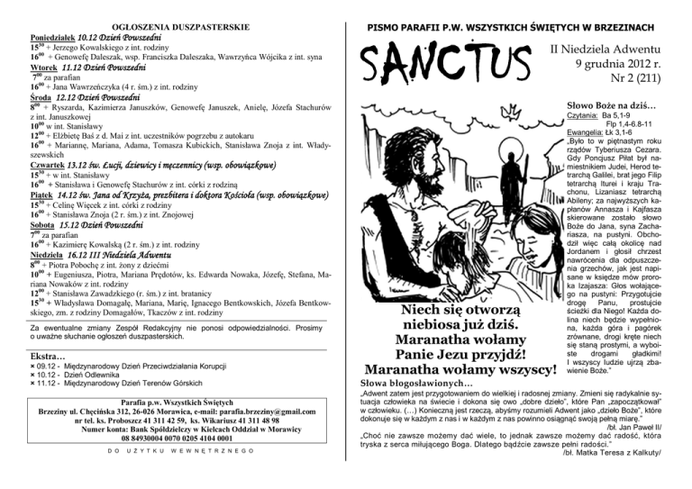 OGŁOSZENIA DUSZPASTERSKIE Poniedziałek 10.12 Dzień Powszedni 1530 + Jerzego Kowalskiego z int. rodziny 1600 + Genowefę Daleszak, wsp. Franciszka Daleszaka, Wawrzyńca Wójcika z int. syna Wtorek 11.12 Dzień Powszedni 700 za parafian 1600 + Jana Wawrzeńczyka (4 r. śm.) z int. rodziny Środa 12.12 Dzień Powszedni 800 + Ryszarda, Kazimierza Januszków, Genowefę Januszek, Anielę, Józefa Stachurów z int. Januszkowej 1000 w int. Stanisławy 1200 + Elżbietę Baś z d. Mai z int. uczestników pogrzebu z autokaru 1600 + Mariannę, Mariana, Adama, Tomasza Kubickich, Stanisława Znoja z int. Władyszewskich Czwartek 13.12 św. Łucji, dziewicy i męczennicy (wsp. obowiązkowe) 1530 + w int. Stanisławy 1600 + Stanisława i Genowefę Stachurów z int. córki z rodziną Piątek 14.12 św. Jana od Krzyża, prezbitera i doktora Kościoła (wsp. obowiązkowe) 1530 + Celinę Więcek z int. córki z rodziny 1600 + Stanisława Znoja (2 r. śm.) z int. Znojowej Sobota 15.12 Dzień Powszedni 700 za parafian 1600 + Kazimierę Kowalską (2 r. śm.) z int. rodziny Niedziela 16.12 III Niedziela Adwentu 800 + Piotra Pobochę z int. żony z dziećmi 1000 + Eugeniusza, Piotra, Mariana Prędotów, ks. Edwarda Nowaka, Józefę, Stefana, Mariana Nowaków z int. rodziny 1200 + Stanisława Zawadzkiego (r. śm.) z int. bratanicy 1530 + Władysława Domagałę, Mariana, Marię, Ignacego Bentkowskich, Józefa Bentkowskiego, zm. z rodziny Domagałów, Tkaczów z int. rodziny Za ewentualne zmiany Zespół Redakcyjny nie ponosi odpowiedzialności. Prosimy o uważne słuchanie ogłoszeń duszpasterskich. Ekstra… × 09.12 - Międzynarodowy Dzień Przeciwdziałania Korupcji × 10.12 - Dzień Odlewnika × 11.12 - Międzynarodowy Dzień Terenów Górskich Parafia p.w. Wszystkich Świętych Brzeziny ul. Chęcińska 312, 26-026 Morawica, e-mail: [email protected] nr tel. ks. Proboszcz 41 311 42 59, ks. Wikariusz 41 311 48 98 Numer konta: Bank Spółdzielczy w Kielcach Oddział w Morawicy 08 84930004 0070 0205 4104 0001 D O U Ż Y T K U W E W N Ę T R Z N E G O PISMO PARAFII P.W. WSZYSTKICH ŚWIĘTYCH W BRZEZINACH SANCTUS II Niedziela Adwentu 9 grudnia 2012 r. Nr 2 (211) Słowo Boże na dziś… Niech się otworzą niebiosa już dziś. Maranatha wołamy Panie Jezu przyjdź! Maranatha wołamy wszyscy! Czytania: Ba 5,1-9 Flp 1,4-6.8-11 Ewangelia: Łk 3,1-6 „Było to w piętnastym roku rządów Tyberiusza Cezara. Gdy Poncjusz Piłat był namiestnikiem Judei, Herod tetrarchą Galilei, brat jego Filip tetrarchą Iturei i kraju Trachonu, Lizaniasz tetrarchą Abileny; za najwyższych kapłanów Annasza i Kajfasza skierowane zostało słowo Boże do Jana, syna Zachariasza, na pustyni. Obchodził więc całą okolicę nad Jordanem i głosił chrzest nawrócenia dla odpuszczenia grzechów, jak jest napisane w księdze mów proroka Izajasza: Głos wołającego na pustyni: Przygotujcie drogę Panu, prostujcie ścieżki dla Niego! Każda dolina niech będzie wypełniona, każda góra i pagórek zrównane, drogi kręte niech się staną prostymi, a wyboiste drogami gładkimi! I wszyscy ludzie ujrzą zbawienie Boże.” Słowa błogosławionych… „Adwent zatem jest przygotowaniem do wielkiej i radosnej zmiany. Zmieni się radykalnie sytuacja człowieka na świecie i dokona się owo „dobre dzieło”, które Pan „zapoczątkował” w człowieku. (…) Konieczną jest rzeczą, abyśmy rozumieli Adwent jako „dzieło Boże”, które dokonuje się w każdym z nas i w każdym z nas powinno osiągnąć swoją pełną miarę.” /bł. Jan Paweł II/ „Choć nie zawsze możemy dać wiele, to jednak zawsze możemy dać radość, która tryska z serca miłującego Boga. Dlatego bądźcie zawsze pełni radości.” /bł. Matka Teresa z Kalkuty/ A w parafii… Boży człowiek… - św. Piotr Fourier (9 grudnia) ▪ Dziś przeżywamy drugą Niedzielę Adwentu, zachęcamy do codziennego uczestniczenia w Roratach ▪ W zakrystii można już zakupić opłatek oraz świece Wigilijnego Dzieła Pomocy Dzieciom. ▪ Dziś w Polsce już po raz trzynasty obchodzony jest Dzień modlitwy i pomocy materialnej Kościołowi na Wschodzie. Piotr Fourier urodził się 30 listopada 1565 r. w Mirecourt w Lotaryngii (Francja). Szczególnie czcił Najświętszą Marię Pannę. W wieku 20 lat wstąpił w Chamouoy, niedaleko rodzinnej miejscowości, do klasztoru kanoników regularnych. Swoją postawą pełną modlitwy i ascezy nie pasował do tego klasztoru, gdzie reguła była luźno traktowana. Zaproponowano mu trzy probostwa do wyboru, by się go pozbyć. Nie budzi zdziwienia to, że wybrał sobie plebanię w Matincourt. Było to miejsce, gdzie mieszkali ludzie o najniższych dochodach, a zepsucie i moralny upadek parafian wymagał od Piotra ciężkiej pracy. Piotr wiedział, że nieznajomość religii jest głównym powodem niewiary i bezbożności w tej okolicy. Cieszył się takim posłuchem, że nawet gdy przychodził po swoich wiernych do karczmy, szli z nim bez oporu na nabożeństwa. W zdobywaniu dusz był nieprzejednany. Odwiedzał zatwardziałych grzeszników, padając im do nóg z błaganiem o nawrócenie. Po upływie trzech lat jego parafia należała do wzorowych. Niestrudzony Piotr, nazywany "ojcem z Matincourt", nawrócił swoją świątobliwością i naukami tysiące niedowiarków i rozgrzał wiarę obojętnych. W okolicy mieszało wielu rzemieślników. Aby im pomóc i ukrócić praktyki lichwiarzy, utworzył bank kredytowy bez odsetek. Walczył też z ogólną niewiedzą, tworząc bezpłatne szkoły dla chłopców. Nauką dziewcząt zajęły się siostry zakonne. Ten zakon był również jego dziełem. Zgłosiło się bowiem do niego kilka dziewcząt, które chciały żyć w dziewictwie i poświęcić się Panu. Po zastanowieniu i konsultacji z innymi pobożnymi ludźmi, przepisał owym dziewicom regułę świętego Augustyna i nazwał je "Kongregacją Matki Bożej" (NotreDame).Ostatnią Mszę św. odprawił w uroczystość Niepokalanego