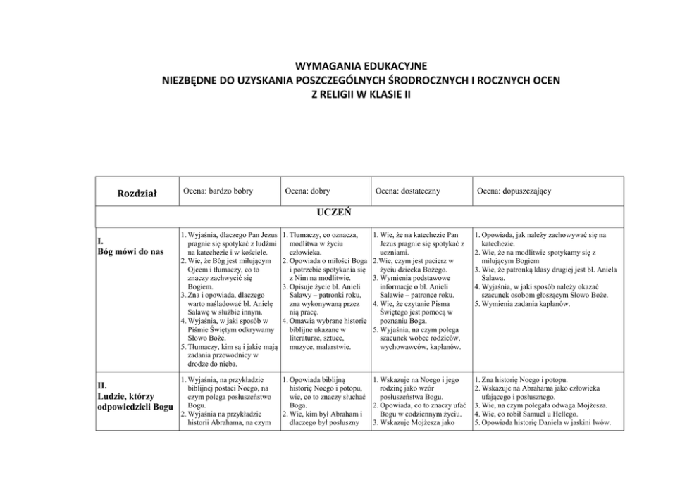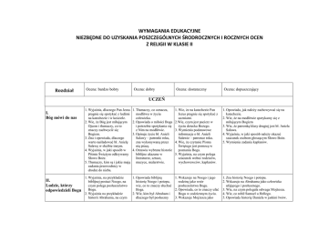 WYMAGANIA EDUKACYJNE NIEZBĘDNE DO UZYSKANIA POSZCZEGÓLNYCH ŚRODROCZNYCH I ROCZNYCH OCEN Z RELIGII W KLASIE II Rozdział Ocena: bardzo bobry Ocena: dobry Ocena: dostateczny Ocena: dopuszczający UCZEŃ I. Bóg mówi do nas II. Ludzie, którzy odpowiedzieli Bogu 1. Wyjaśnia, dlaczego Pan Jezus pragnie się spotykać z ludźmi na katechezie i w kościele. 2. Wie, że Bóg jest miłującym Ojcem i tłumaczy, co to znaczy zachwycić się Bogiem. 3. Zna i opowiada, dlaczego warto naśladować bł. Anielę Salawę w służbie innym. 4. Wyjaśnia, w jaki sposób w Piśmie Świętym odkrywamy Słowo Boże. 5. Tłumaczy, kim są i jakie mają zadania przewodnicy w drodze do nieba. 1. Tłumaczy, co oznacza, modlitwa w życiu człowieka. 2. Opowiada o miłości Boga i potrzebie spotykania się z Nim na modlitwie. 3. Opisuje życie bł. Anieli Salawy – patronki roku, zna wykonywaną przez nią pracę. 4. Omawia wybrane historie biblijne ukazane w literaturze, sztuce, muzyce, malarstwie. 1. Wie, że na katechezie Pan Jezus pragnie się spotykać z uczniami. 2.Wie, czym jest pacierz w życiu dziecka Bożego. 3. Wymienia podstawowe informacje o bł. Anieli Salawie – patronce roku. 4. Wie, że czytanie Pisma Świętego jest pomocą w poznaniu Boga. 5. Wyjaśnia, na czym polega szacunek wobec rodziców, wychowawców, kapłanów. 1. Wyjaśnia, na przykładzie biblijnej postaci Noego, na czym polega posłuszeństwo Bogu. 2. Wyjaśnia na przykładzie historii Abrahama, na czym 1. Opowiada biblijną 1. Wskazuje na Noego i jego historię Noego i potopu, rodzinę jako wzór wie, co to znaczy słuchać posłuszeństwa Bogu. Boga. 2. Opowiada, co to znaczy ufać 2. Wie, kim był Abraham i Bogu w codziennym życiu. dlaczego był posłuszny 3. Wskazuje Mojżesza jako 1. Opowiada, jak należy zachowywać się na katechezie. 2. Wie, że na modlitwie spotykamy się z miłującym Bogiem 3. Wie, że patronką klasy drugiej jest bł. Aniela Salawa. 4. Wyjaśnia, w jaki sposób należy okazać szacunek osobom głoszącym Słowo Boże. 5. Wymienia zadania kapłanów. 1. Zna historię Noego i potopu. 2. Wskazuje na Abrahama jako człowieka ufającego i posłusznego. 3. Wie, na czym polegała odwaga Mojżesza. 4. Wie, co robił Samuel u Hellego. 5. Opowiada historię Daniela w jaskini lwów. polega zaufanie Bogu. 3. Wyjaśnia, co to znaczy wierzyć w Boga tak jak Mojżesz. 4. Wyjaśnia, co to znaczy wsłuchiwać się w głos Boga tak jak Samuel. 5. Wyjaśnia na przykładzie Daniela, czym jest miłość i wierność prawu Bożemu. 6. Opowiada o powołaniu Jonasza i wyjaśnia, na czym polega odwaga w wyznawaniu wiary. 7. Wie, że modlitwa różańcowa przybliża do Jezusa i pomaga w przygotowaniu do spotkania z Nim w Eucharystii. 8. Wyjaśnia, dlaczego chrześcijanie odmawiają różaniec. 1. Wyjaśnia pojęcie Abba i Bogu. 3. Opowiada, w jaki sposób Mojżesz wypełniał wolę Pana Boga. 4. Opowiada, w jaki sposób Samuel rozpoznał głos Boga. 5. Wie, kim jest prorok Daniel, na czym polega jego zaufanie Bogu. 6. Wskazuje na Jonasza i jego konsekwencje ucieczki przed Bogiem. 7. Wskazuje na modlitwę różańcową jako spotkanie z Jezusem i Maryją. 8. Zna tajemnice różańca, wie, że jest to szczególne spotkanie z Maryją i Jezusem. człowieka wypełniającego 6. Wie, dlaczego nie należy uciekać przed wolę Bożą. Bogiem. 4. Wskazuje na Samuela 7. Wymienia modlitwy odmawiane podczas słuchającego głosu Boga na różańca. modlitwie. 8. Z pomocą nauczyciela wymienia modlitwy i 5. Rozumie, na czym polega omawia wybrane tajemnice różańcowe. zaufanie Bogu w trudnościach. 6. Zna historię o Jonaszu i jego powołaniu. 7. Wyjaśnia, dlaczego wspólnie modlimy się na różańcu. 8. Wie, jak należy odmawiać różaniec. 1. Wie, że Pan Jezus nauczył 1. Wie, dlaczego codziennie odmawia się modlitwę Ojcze nasz. 2. Wie, w jaki sposób na o świętości imienia Boga w 3.Wyjaśnia, czym jest modlitwie chwalić imię Boga. modlitwie Ojcze nasz. Królestwo Boże na ziemi. 3. Opowiada, jak troszczyć się o 3. Wyjaśnia i wie, co to jest 4. Wie, jak rozpoznać wolę Królestwo Boże na ziemi. Królestwo Boże i jak żyć Bożą i wypełniać ją w 4. Opowiada o poznawaniu woli zasadami Królestwa Bożego. życiu. Bożej w życiu. 4. Zna sposoby odkrywania woli 5. Wyjaśnia znaczenie 5. Wie, co to znaczy szanować Bożej w codziennym życiu. pokarmu w codziennym pokarm, a zwłaszcza chleb. 5. Wyjaśnia, na czym polega życiu i potrafi modlić się 6. Rozumie, że warunkiem brak pożywienia w świecie i za ludzi głodujących. otrzymania przebaczenia od potrzeba dzielenia się. 6. Wyjaśnia, że Bóg Boga jest przebaczenie 6. Wskazuje na potrzebę przebacza nam winy i uczy innym. przebaczenia, wyjaśnia, na przebaczania. 7. Zna sposoby walki z czym polega przebaczenie 7. Wie, czym jest pokusa i pokusami i wie, na czym Boga i ludzi. wyjaśnia, na czym polega polega przezwyciężanie 7. Wyjaśnia pojęcie pokusa i Boża pomoc w słabości. jego źródło, wymienia przezwyciężaniu zła. 8. Wie, że trzeba się troszczyć o III. okoliczności powstania nas Modlitwy Pańskiej. Jezus uczy nas modlitwy Ojcze nasz. 2. Wyjaśnia, dlaczego imię Boga jest święte. rozmawiać z Ojcem 2. Wskazuje i wyjaśnia prawdy 1. Wie, że Modlitwa Pańska jest najpiękniejszą rozmową z Bogiem. 2. Zna i wymienia postawy na modlitwie. 3. Wie, że Królestwo Boże jest na ziemi i w niebie. 4. Wskazuje na pragnienia ludzi w wypełnieniu woli Bożej. 5. Opowiada, jak być wdzięcznym za pokarm. 6. Wie, że na modlitwie przepraszamy za zło, rozumie, co to znaczy przebaczyć. 7. Rozumie, czym jest pokusa 8. Wie, że Bóg pragnie wszystkich zbawić. sposoby walki z pokusami. 8. Opowiada, na czym 8. Wyjaśnia pojęcia: zbawienie, polega zbawienie ludzi. niebo, wieczność. IV. My odpowiadamy Bogu V. Dziękujemy Bogu zbawienie swoje i wszystkich ludzi. 1. Wyjaśnia, na czym polegała zgoda Maryi i jej posłuszeństwo wobec Boga. 2. Wskazuje na Ja
