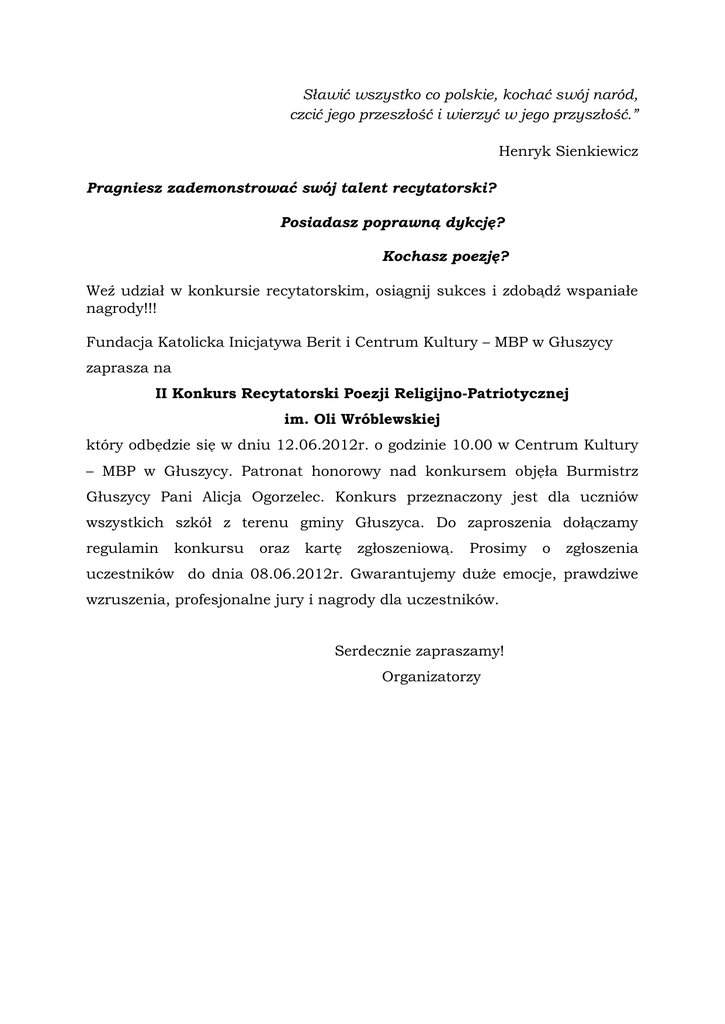Sławić wszystko co polskie, kochać swój naród, czcić jego przeszłość i wierzyć w jego przyszłość.” Henryk Sienkiewicz Pragniesz zademonstrować swój talent recytatorski? Posiadasz poprawną dykcję? Kochasz poezję? Weź udział w konkursie recytatorskim, osiągnij sukces i zdobądź wspaniałe nagrody!!! Fundacja Katolicka Inicjatywa Berit i Centrum Kultury – MBP w Głuszycy zaprasza na II Konkurs Recytatorski Poezji Religijno-Patriotycznej im. Oli Wróblewskiej który odbędzie się w dniu 12.06.2012r. o godzinie 10.00 w Centrum Kultury – MBP w Głuszycy. Patronat honorowy nad konkursem objęła Burmistrz Głuszycy Pani Alicja Ogorzelec. Konkurs przeznaczony jest dla uczniów wszystkich szkół z terenu gminy Głuszyca. Do zaproszenia dołączamy regulamin konkursu oraz kartę zgłoszeniową. Prosimy o zgłoszenia uczestników do dnia 08.06.2012r. Gwarantujemy duże emocje, prawdziwe wzruszenia, profesjonalne jury i nagrody dla uczestników. Serdecznie zapraszamy! Organizatorzy