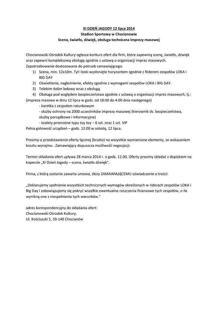 XI DZIEŃ JAGODY 12 lipca 2014 Stadion Sportowy w Chocianowie Scena, światło, dźwięk, obsługa techniczna imprezy masowej Chocianowski Ośrodek Kultury ogłasza konkurs ofert dla firm, które zapewnią scenę, światło, dźwięk oraz zapewni kompleksową obsługę zgodnie z ustawą o organizacji imprez masowych. Zapotrzebowanie dostosowane do potrzeb zamawiającego: 1) Scena, min. 12x10m. Tył i boki wysłonięte horyzontem zgodnie z Riderem zespołów LOKA i BIG DAY 2) Oświetlenie, nagłośnienie, efekty zgodnie z wymogami zespołów LOKA i BIG DAY. 3) Telebim 4x6m ledowy wraz z obsługą. 4) Obsługa pod względem bezpieczeństwa zgodnie z ustawą o organizacji imprez masowych, tj.: (impreza masowa w dniu 12 lipca w godz. od 18:00 do 4:00 dnia następnego) - karetka z zespołem ratunkowym - służby ochrony na 2000 uczestników imprezy masowej (kierownik ds. bezpieczeństwa, służby porządkowe i informacyjne) - toalety przenośne typu toy toy – 6 szt. oraz 1 szt. VIP Pełna gotowość urządzeń – godz. 12:00 w sobotę, 12 lipca. Prosimy o przedstawienie oferty łącznej (brutto) na wszystkie wymienione elementy, ze wskazaniem kosztu wynajmu . Zamawiający dopuszcza możliwość negocjacji. Termin składania ofert upływa 28 marca 2014 r. o godz. 12.00. Oferty prosimy składać z dopiskiem na kopercie „XI Dzień Jagody – scena, światło dźwięk". Firma, z którą zostanie zawarta umowa, złoży ZAMAWIAJĄCEMU oświadczenie o treści: „Deklarujemy spełnienie wszystkich technicznych wymogów określonych w riderach zespołów LOKA i Big Day i zobowiązujemy się pokryć wszelkie ewentualne roszczenia finansowe tych zespołów, o ile wynikną one z niespełnienia tych warunków." adres korespondencyjny do składania ofert: Chocianowski Ośrodek Kultury, Ul. Kościuszki 5, 59-140 Chocianów