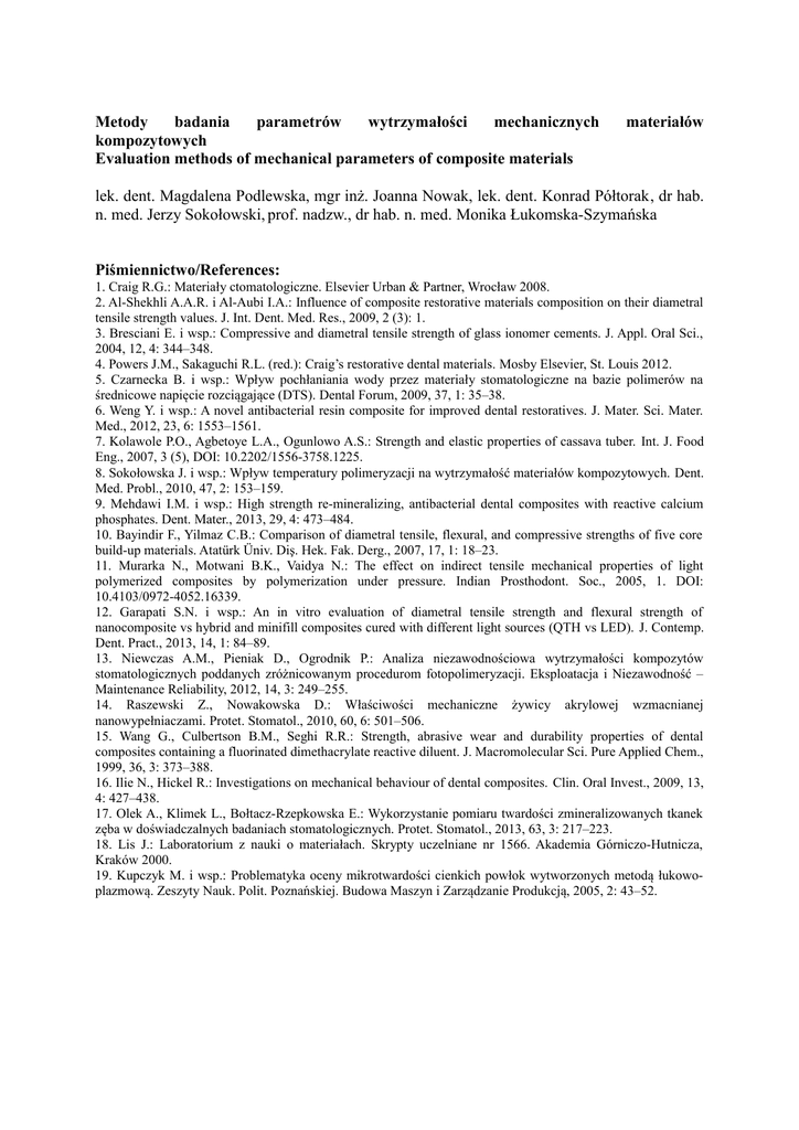 Metody badania parametrów wytrzymałości mechanicznych kompozytowych Evaluation methods of mechanical parameters of composite materials materiałów lek. dent. Magdalena Podlewska, mgr inż. Joanna Nowak, lek. dent. Konrad Półtorak, dr hab. n. med. Jerzy Sokołowski, prof. nadzw., dr hab. n. med. Monika Łukomska-Szymańska Piśmiennictwo/References: 1. Craig R.G.: Materiały ctomatologiczne. Elsevier Urban & Partner, Wrocław 2008. 2. Al-Shekhli A.A.R. i Al-Aubi I.A.: Influence of composite restorative materials composition on their diametral tensile strength values. J. Int. Dent. Med. Res., 2009, 2 (3): 1. 3. Bresciani E. i wsp.: Compressive and diametral tensile strength of glass ionomer cements. J. Appl. Oral Sci., 2004, 12, 4: 344–348. 4. Powers J.M., Sakaguchi R.L. (red.): Craig’s restorative dental materials. Mosby Elsevier, St. Louis 2012. 5. Czarnecka B. i wsp.: Wpływ pochłaniania wody przez materiały stomatologiczne na bazie polimerów na średnicowe napięcie rozciągające (DTS). Dental Forum, 2009, 37, 1: 35–38. 6. Weng Y. i wsp.: A novel antibacterial resin composite for improved dental restoratives. J. Mater. Sci. Mater. Med., 2012, 23, 6: 1553–1561. 7. Kolawole P.O., Agbetoye L.A., Ogunlowo A.S.: Strength and elastic properties of cassava tuber. Int. J. Food Eng., 2007, 3 (5), DOI: 10.2202/1556-3758.1225. 8. Sokołowska J. i wsp.: Wpływ temperatury polimeryzacji na wytrzymałość materiałów kompozytowych. Dent. Med. Probl., 2010, 47, 2: 153–159. 9. Mehdawi I.M. i wsp.: High strength re-mineralizing, antibacterial dental composites with reactive calcium phosphates. Dent. Mater., 2013, 29, 4: 473–484. 10. Bayindir F., Yilmaz C.B.: Comparison of diametral tensile, flexural, and compressive strengths of five core build-up materials. Atatürk Üniv. Diş. Hek. Fak. Derg., 2007, 17, 1: 18–23. 11. Murarka N., Motwani B.K., Vaidya N.: The effect on indirect tensile mechanical properties of light polymerized composites by polymerization under pressure. Indian Prosthodont. Soc., 2005, 1. DOI: 10.4103/0972-4052.16339. 12. Garapati S.N. i wsp.: An in vitro evaluation of diametral tensile strength and flexural strength of nanocomposite vs hybrid and minifill composites cured with different light sources (QTH vs LED). J. Contemp. Dent. Pract., 2013, 14, 1: 84–89. 13. Niewczas A.M., Pieniak D., Ogrodnik P.: Analiza niezawodnościowa wytrzymałości kompozytów stomatologicznych poddanych zróżnicowanym procedurom fotopolimeryzacji. Eksploatacja i Niezawodność – Maintenance Reliability, 2012, 14, 3: 249–255. 14. Raszewski Z., Nowakowska D.: Właściwości mechaniczne żywicy akrylowej wzmacnianej nanowypełniaczami. Protet. Stomatol., 2010, 60, 6: 501–506. 15. Wang G., Culbertson B.M., Seghi R.R.: Strength, abrasive wear and durability properties of dental composites containing a fluorinated dimethacrylate reactive diluent. J. Macromolecular Sci. Pure Applied Chem., 1999, 36, 3: 373–388. 16. Ilie N., Hickel R.: Investigations on mechanical behaviour of dental composites. Clin. Oral Invest., 2009, 13, 4: 427–438. 17. Olek A., Klimek L., Bołtacz-Rzepkowska E.: Wykorzystanie pomiaru twardości zmineralizowanych tkanek zęba w doświadczalnych badaniach stomatologicznych. Protet. Stomatol., 2013, 63, 3: 217–223. 18. Lis J.: Laboratorium z nauki o materiałach. Skrypty uczelniane nr 1566. Akademia Górniczo-Hutnicza, Kraków 2000. 19. Kupczyk M. i wsp.: Problematyka oceny mikrotwardości cienkich powłok wytworzonych metodą łukowoplazmową. Zeszyty Nauk. Polit. Poznańskiej. Budowa Maszyn i Zarządzanie Produkcją, 2005, 2: 43–52.