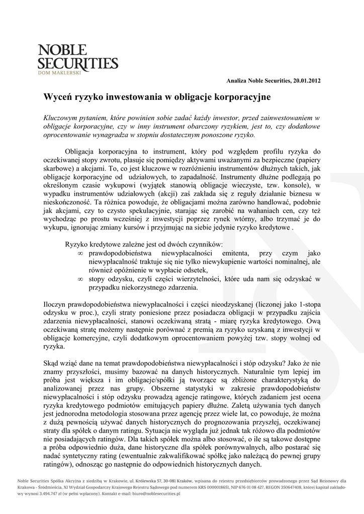 Analiza Noble Securities, 20.01.2012 Wyceń ryzyko inwestowania w obligacje korporacyjne Kluczowym pytaniem, które powinien sobie zadać każdy inwestor, przed zainwestowaniem w obligacje korporacyjne, czy w inny instrument obarczony ryzykiem, jest to, czy dodatkowe oprocentowanie wynagradza w stopniu dostatecznym ponoszone ryzyko. Obligacja korporacyjna to instrument, który pod względem profilu ryzyka do oczekiwanej stopy zwrotu, plasuje się pomiędzy aktywami uważanymi za bezpieczne (papiery skarbowe) a akcjami. To, co jest kluczowe w rozróżnieniu instrumentów dłużnych takich, jak obligacje korporacyjne od udziałowych, to zapadalność. Instrumenty dłużne podlegają po określonym czasie wykupowi (wyjątek stanowią obligacje wieczyste, tzw. konsole), w wypadku instrumentów udziałowych (akcji) zaś zakłada się z reguły działanie biznesu w nieskończoność. Ta różnica powoduje, że obligacjami można zarówno handlować, podobnie jak akcjami, czy to czysto spekulacyjnie, starając się zarobić na wahaniach cen, czy też wychodząc po prostu wcześniej z inwestycji poprzez rynek wtórny, albo trzymać je do wykupu, ignorując zmiany kursów i przyjmując na siebie jedynie ryzyko kredytowe . Ryzyko kredytowe zależne jest od dwóch czynników: • prawdopodobieństwa niewypłacalności emitenta, przy czym jako niewypłacalność traktuje się nie tylko niewykupienie wartości nominalnej, ale również opóźnienie w wypłacie odsetek, • stopy odzysku, czyli części wierzytelności, które uda nam się odzyskać w przypadku niekorzystnego zdarzenia. Iloczyn prawdopodobieństwa niewypłacalności i części nieodzyskanej (liczonej jako 1-stopa odzysku w proc.), czyli straty poniesione przez posiadacza obligacji w przypadku zajścia zdarzenia niewypłacalności, stanowi oczekiwaną stratą - miarę ryzyka kredytowego. Ową oczekiwaną stratę możemy następnie porównać z premią za ryzyko uzyskaną z inwestycji w obligacje komercyjne, czyli dodatkowym oprocentowaniem powyżej tzw. stopy wolnej od ryzyka. Skąd wziąć dane na temat prawdopodobieństwa niewypłacalności i stóp odzysku? Jako że nie znamy przyszłości, musimy bazować na danych historycznych. Naturalnie tym lepiej im próba jest większa i im obligacje/spółki ją tworzące są zbliżone charakterystyką do analizowanej przez nas grupy. Obszerne statystyki w zakresie prawdopodobieństw niewypłacalności i stóp odzysku prowadzą agencje ratingowe, których zadaniem jest ocena ryzyka kredytowego podmiotów emitujących papiery dłużne. Zaletą używania tych danych jest jednorodna metodologia stosowana przez agencję przez wiele lat, co powoduje, że można z dużą pewnością używać danych historycznych do prognozowania przyszłej, oczekiwanej straty dla spółek o danym ratingu. Sytuacja nie wygląda już jednak tak różowo dla podmiotów nie posiadających ratingów. Dla takich spółek można albo stosować, o ile są takowe dostępne a próba odpowiednio duża, dane historyczne dla spółek porównywalnych, albo postarać się nadać syntetyczny rating (ewentualnie zakwalifikować spółkę jako należącą do pewnej grupy ratingów), odnosząc go następnie do odpowiednich historycznych danych. Zobaczmy więc jak wyglądają przykładowe dane udostępniane przez agencję Moody’s. Tabela nr 1 pokazuje skumulowane prawdopodobieństwa niewypłacalności w okresie od 1 do 5 lat dla spółek o wybranych ratingach. Tabela 1. Skumulowane prawdopodobieństwa niewypłacalności dla wybranych ratingów, na podstawie danych z lat 1983-2010 (dane w proc.) rating/rok 1 2 3 4 5 Aaa 0 0,016 0,016 0,048 0,086 A1 0,061 0,0217 0,461 0,672 0,855 Ba1 0,709 1,986 3,721 5,546 7,226 B3 7,584 16,097 24,299 31,262 37,199 Ca-C 38,739 50,58 59,678 66,353 71,652 inwestycyjny 0,095 0,274 0,508 0,769 1,054 spekulacyjny 4,944 10,195 15,233 19,671 23,477 średnia 1,819 3,717 5,485 6,988 8,241 Źródło: Moody’s, Corporate Default and Recovery Rates, 1920 Tabela nr 2 przedstawia zaś średnie stopy odzysku dla obligacji umieszczonych w różnych pozycjach w hierarchii struktury długu w przedsiębiorstwie. Warto zauważyć, że stopy odzysku szacowane są nie na podstawie realnie odzyskanych środków, tylko na podstawie cen obligacji zaobserwowanych 30 dni po niewypłacalności, przyjmuje się tym samym, że na względnie płynnym i efektywnym rynku, ceny te wiernie odzwierciedlają zdyskontowane, przyszłe przepływy z tytułu odzysku wierzytelności. Tabela 2. Średnie stopy odzysku z niewypłacalnych obligacji korporacyjnych, emitowanych przez spółki posiadające rating Moody’s (dane w proc.) transza obligacji/lata senioralna, zabezpieczona senioralna, niezabezpieczona senioralna, podporządkowana podporządkowana junior podporządkowana 2009 65,6 51,6 28 58,3 0 Źródło: Moody’s, Corporate Default and Recovery Rates, 1920-2010 2010 56,3 26,5 21,7 0 bd 1987-2010 63,5 49,2 29,4 29,3 18,4 Jak Catalyst wycenia ryzyko? Średnia (w okresie rocznym) rentowność polskich, 3 letnich obligacji skarbowych wynosi 4,89 proc., natomiast średnie bieżące oprocentowanie obligacji notowanych na Catalyst 6,18 proc., co implikuje premię za ryzyko w wysokości 1,29 proc. Ponad połowę wielkości całego korporacyjnego segmentu rynku Catalyst stanowią jednak obligacje drogowe Banku Gospodarstwa Krajowego, które gwarantowane są przez Skarb Państwa. Po oczyszczeniu danych z emisji banków (wszystkich, nie tylko BGK) średnie oprocentowanie bieżącego okresu wzrasta o prawie 3 p.p., do 9,14 proc., a wraz z nim premia za ryzyko do 4,25 proc. Najwięcej polskich obligacji korporacyjnych posiada 3 letnie, pierwotne okresy do wykupu, przyjmijmy więc skumulowane prawdopodobieństwa niewypłacalności w okresie 3 lat. Z danych prawdopodobieństw niewypłacalności i stóp odzysku obliczmy oczekiwaną stratę a następnie sprowadźmy ją (stosując średnią geometryczną) do okresu rocznego, tak żeby umożliwić poró