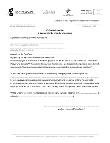 Załącznik nr 4 do Regulaminu uczestnictwa w projekcie …………......................................... (miejscowość i data) ............................................................ pieczęć szkoły / placówki oświatowej Oświadczenie o zapewnieniu wkładu własnego Dyrektor szkoły / placówki oświatowej, .................................................................................................................................... (pełna nazwa szkoły/placówki oświatowej) ..................................................................................................................................... (adres szkoły/placówki oświatowej) oświadcza, że Pan/Pani ..................................................................................................... legitymujący/a się dowodem osobistym seria / nr ............................................................... uczestniczący/a w szkoleniu w ramach projektu nr POKL.09.04.00-24-001/11 pn. „PEWNIAK Pozytywna Energia W Nauczaniu I Aktywnym Kształceniu - podnoszenie kompetencji zawodowych nauczycielek/li edukacji przedszkolnej i edukacji wczesnoszkolnej województwa śląskiego”: a) jest zatrudniony/a w szkole/placówce oświatowej, której organem prowadzącym jest ............................................................................................................................................................. b) jest nauczycielem/nauczycielką zatrudnionym/zatrudnioną w oparciu o Kartę Nauczyciela; c) będzie uczestniczył/a w szkoleniu w wymiarze 40 godzin w czasie i w ramach obowiązków, które wynikają z art. 42 ust.1 oraz art.42 ust.2 pkt.3 ustawy z dnia 26 stycznia 1982r. Karta Nauczyciela; Wkład własny w formie wynagrodzenia nauczyciela wyniesie łącznie min. ............................. zł (słownie: ……………………………………………………………………..). .................................................................................................... (podpis i pieczęć Pracodawcy) Projekt współfinansowany ze środków Unii Europejskiej w ramach Europejskiego Funduszu Społecznego Informacja w sprawie wniesienia wkładu własnego w postaci wynagrodzeń wypłacanych przez osobę trzecią: Zgodnie z „Zasadami Finansowania Programu Operacyjnego Kapitał Ludzki”, rozdział 1, punkt 1.3.3 – dotyczy to wkładu własnego wnoszonego w formie wynagrodzeń wypłacanych przez osobę trzecią – wynagrodzenia wypłacane przez stronę trzecią na rzecz uczestników projektu są kwalifikowalne pod warunkiem, że zostały poniesione zgodnie z przepisami krajowymi, w tym zasadami dotyczącymi rachunkowości. Jednocześnie wysokość wkładu wynikającego z wynagrodzeń wypłacanych przez stronę trzecią na rzecz uczestników projektu w ramach Programu Operacyjnego Kapitał Ludzki musi wynikać z dokumentacji księgowej podmiotu wypłacającego i może podlegać kontroli. Wkład własny w formie wynagrodzeń wypłacanych przez stronę trzecią należy odnosić do wysokości wynagrodzenia uczestników projektu w momencie udzielania im danej formy wsparcia. Wkład ten powinien zostać wyliczony proporcjonalnie do czasu udziału w projekcie. W ramach projektu każda szkoła/placówka oświatowa, której pracownicy uczestniczą w szkoleniu, zobowiązana jest poprzez przepisy Regulaminu uczestnictwa w projekcie oraz przepisy Programu Operacyjnego Kapitał Ludzi do wniesienia wkładu własnego. W praktyce oznacza to, iż Kandydat wraz z formularzem zgłoszeniowym składa oświadczenie podpisane przez dyrektora szkoły/placówki oświatowej będące jednocześnie deklaracją wniesienia takiego wkładu. Tym samym co miesiąc (jeżeli poszczególne dni szkolenia przypadają w różnych miesiącach to dla każdego miesiąca osobno) należy przedłożyć u Beneficjenta oświadczenie o wniesieniu wkładu własnego. Oświadczenie takie powinno zostać wypełnione i zatwierdzone przez szkołę/placówkę oświatową, w której zatrudniony jest uczestnik projektu. Oświadczenie powinno być sporządzone oddzielnie dla każdego szkolenia – w okresie miesięcznym. Wkład wniesiony będzie w formie wynagrodzeń pracowników uczestniczących w projekcie. Wniesienie wkładu nie wiąże się z obowiązkiem dodatkowych świadczeń pieniężnych na rzecz projektu. Jest to tylko i wyłącznie przekazanie informacji na temat kwoty wynagrodzenia uczestnika projektu, za okres, w którym w godzinach pracy korzysta ze szkolenia pn. „PEWNIAK - Pozytywna Energia W Nauczaniu I Aktywnym Kształceniu - podnoszenie kompetencji zawodowych nauczycielek/li edukacji przedszkolnej i edukacji wczesnoszkolnej województwa śląskiego” – chodzi więc o kwotę wynagrodzenia za konkretną liczbę godzin spędzonych na szkoleniu. UWAGI 1. 2. 3. 4. 5. 6. 7. W ramach miesięcznego wynagrodzenia kwalifikowane będą składki wynagrodzenia zgodnie z obowiązującymi Wytycznymi w zakresie kwalifikowania wydatków w ramach Programu Operacyjnego Kapitał Ludzki. Według ww. dokumentu będą to zasadniczo wszystkie składki wynagrodzenia, tj. wynagrodzenie brutto, składki pracodawcy na ubezpieczenia społeczne, składki na Fundusz Pracy oraz odpisy na Zakładowy Fundusz Świadczeń Socjalnych, z wyłączeniem wpłat dokonywanych przez pracodawców zgodnie z ustawą z dnia 27 sierpnia 1997r. o rehabilitacji zawodowej i społecznej osób niepełnosprawnych oraz zatrudnieniu osób niepełnosprawnych na Państwowy Fundusz Rehabilitacji Osób Niepełnosprawnych. Wkładem własnym będą wynagrodzenia i/lub dodatki należne osobom naliczone w proporcji odpowiadającej okresowi szkolenia lub kursów o ile odbywają się one w godzinach pracy. Zgodnie z art. 42 ustawy z dnia 26 stycznia 1982 r. Karta Nauczyciela w ramach czasu pracy oraz ustalonego wynagrodzenia nauczyciel obowiązany jest realizować m. in. zajęcia i czynności związane z przygotowaniem się do zajęć, samokształceniem i dosk
