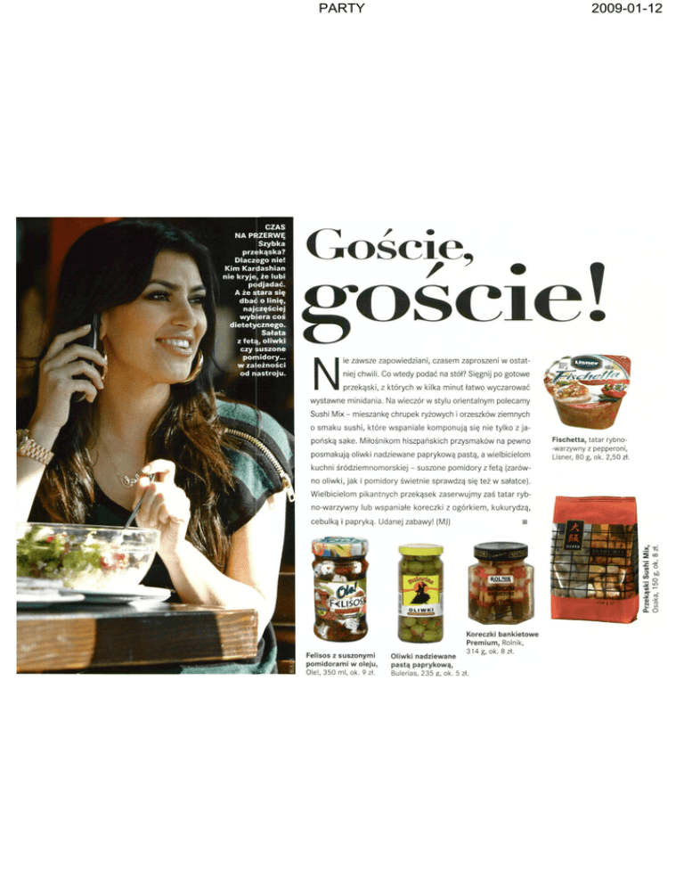 PARTY CZAS NA PRZERWĘ Szybka przekąska? Dlaczego nie! Kim Kardashian nie kryje, że lubi podjadać. A że stara się dbać o linię, najczęściej wybiera coś dietetycznego. Sałata midory... zależności i nastroju. 2009-01-12 Goście, N f ie zawsze zapowiedziani, czasem zaproszeni w ostat niej chwili. Co wtedy podać na stół? Sięgnij po gotowe przekąski, z których w kilka minut łatwo wyczarować wystawne minidania. Na wieczór w stylu orientalnym polecamy Sushi Mix - mieszankę chrupek ryżowych i orzeszków ziemnych o smaku sushi, które wspaniale komponują się nie tylko z ja pońską sake. Miłośnikom hiszpańskich przysmaków na pewno posmakują oliwki nadziewane paprykową pastą, a wielbicielom Fischetta, tatar rybno-warzywny z pepperoni, Lisner, 80 g, ok. 2,50 zł. kuchni śródziemnomorskiej - suszone pomidory z fetą (zarów no oliwki, jak i pomidory świetnie sprawdzą się też w sałatce). Wielbicielom pikantnych przekąsek zaserwujmy zaś tatar rybno-warzywny lub wspaniałe koreczki z ogórkiem, kukurydzą, • cebulką i papryką. Udanej zabawy! (MJ) ! i- RLIS0 Felisos z suszonymi pomidorami w oleju, Ole!, 350 m1, ok. 9 zt. Koreczki bankietowe Premium, Rolnik, 314 g, ok. 8 zł. Oliwki nadziewane pastą paprykową, Bulerias, 235 g, ok. 5 zt.