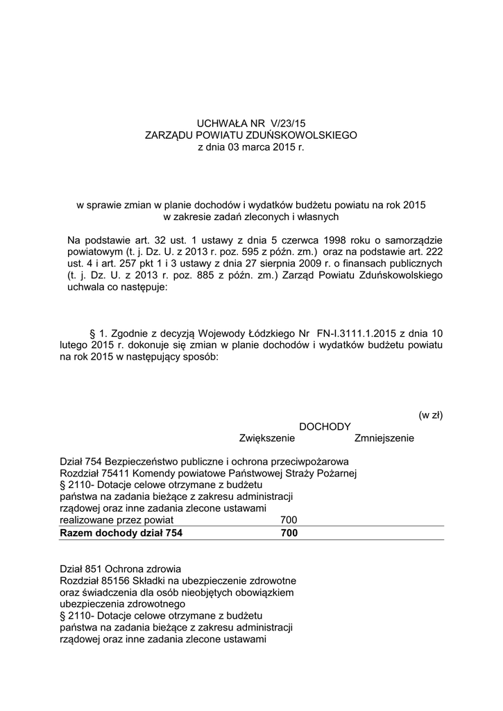 UCHWAŁA NR V/23/15 ZARZĄDU POWIATU ZDUŃSKOWOLSKIEGO z dnia 03 marca 2015 r. w sprawie zmian w planie dochodów i wydatków budżetu powiatu na rok 2015 w zakresie zadań zleconych i własnych Na podstawie art. 32 ust. 1 ustawy z dnia 5 czerwca 1998 roku o samorządzie powiatowym (t. j. Dz. U. z 2013 r. poz. 595 z późn. zm.) oraz na podstawie art. 222 ust. 4 i art. 257 pkt 1 i 3 ustawy z dnia 27 sierpnia 2009 r. o finansach publicznych (t. j. Dz. U. z 2013 r. poz. 885 z późn. zm.) Zarząd Powiatu Zduńskowolskiego uchwala co następuje: § 1. Zgodnie z decyzją Wojewody Łódzkiego Nr FN-I.3111.1.2015 z dnia 10 lutego 2015 r. dokonuje się zmian w planie dochodów i wydatków budżetu powiatu na rok 2015 w następujący sposób: (w zł) DOCHODY Zwiększenie Zmniejszenie Dział 754 Bezpieczeństwo publiczne i ochrona przeciwpożarowa Rozdział 75411 Komendy powiatowe Państwowej Straży Pożarnej § 2110- Dotacje celowe otrzymane z budżetu państwa na zadania bieżące z zakresu administracji rządowej oraz inne zadania zlecone ustawami realizowane przez powiat 700 Razem dochody dział 754 700 Dział 851 Ochrona zdrowia Rozdział 85156 Składki na ubezpieczenie zdrowotne oraz świadczenia dla osób nieobjętych obowiązkiem ubezpieczenia zdrowotnego § 2110- Dotacje celowe otrzymane z budżetu państwa na zadania bieżące z zakresu administracji rządowej oraz inne zadania zlecone ustawami realizowane przez powiat Razem dochody dział 851 54 900 54 900 Dział 852 Pomoc społeczna Rozdział 85202 Domy pomocy społecznej § 2130- Dotacje celowe otrzymane z budżetu państwa na realizację bieżących zadań własnych powiatu 34 974 Rozdział 85203 Ośrodki wsparcia § 2110- Dotacje celowe otrzymane z budżetu państwa na zadania bieżące z zakresu administracji rządowej oraz inne zadania zlecone ustawami realizowane przez powiat 18 841 Rozdział 85205 Zadania w zakresie przeciwdziałania przemocy w rodzinie § 2110- Dotacje celowe otrzymane z budżetu państwa na zadania bieżące z zakresu administracji rządowej oraz inne zadania zlecone ustawami realizowane przez powiat 4 230 Razem dochody dział 852 58 045 Dział 853 Pozostałe zadania w zakresie polityki społecznej Rozdział 85321 Zespoły do spraw orzekania o niepełnosprawności § 2110- Dotacje celowe otrzymane z budżetu państwa na zadania bieżące z zakresu administracji rządowej oraz inne zadania zlecone ustawami realizowane przez powiat 7 086 Razem dochody dział 853 7 086 Ogółem dochody 113 645 7 086 Ogółem dochody per saldo 106 559 (w zł) WYDATKI Zwiększenie Zmniejszenie Rozdział 71020 Organizacja targów i wystaw -wydatki bieżące 12 300 z tego: -wynagrodzenia i składki od nich naliczane 12 300 -wydatki związane z realizacją zadań statutowych jednostek budżetowych Razem wydatki dział 710 12 300 Dział 754 Bezpieczeństwo publiczne i ochrona przeciwpożarowa Rozdział 75411 Komendy powiatowe Państwowej Straży Pożarnej -wydatki bieżące 700 z tego: -świadczenia na rzecz osób fizycznych 700 Razem wydatki dział 754 700 Dział 851 Ochrona zdrowia Rozdział 85156 Składki na ubezpieczenie zdrowotne oraz świadczenia 12 300 12 300 12 300 dla osób nieobjętych obowiązkiem ubezpieczenia zdrowotnego -wydatki bieżące 54 900 z tego: -wydatki związane z realizacją zadań statutowych jednostek budżetowych 54 900 Razem wydatki dział 851 54 900 Dział 852 Pomoc społeczna Rozdział 85202 Domy pomocy społecznej -wydatki bieżące z tego: -wynagrodzenia i składki od nich naliczane Rozdział 85203 Ośrodki wsparcia -wydatki bieżące z tego: -wynagrodzenia i składki od nich naliczane 34 974 34 974 34 974 34 974 18 841 18 841 Rozdział 85205 Zadania w zakresie przeciwdziałania przemocy w rodzinie -wydatki bieżące (zadania zlecone) 4 230 z tego: -wynagrodzenia i składki od nich naliczane 4 230 -wydatki bieżące (zadania własne) z tego: -wynagrodzenia i składki od nich naliczane Rozdział 85295 Pozostała działalność -wydatki bieżące z tego: -wydatki związane z realizacją zadań statutowych jednostek budżetowych Razem wydatki dział 852 6 000 6 000 40 974 40 974 99 019 Dział 853 Pozostałe zadania w zakresie polityki społecznej Rozdział 85321 Zespoły do spraw orzekania o niepełnosprawności -wydatki bieżące z tego: -wynagrodzenia i składki od nich naliczane -wydatki związane z realizacją zadań statutowych jednostek budżetowych Razem wydatki dział 853 Ogółem wydatki 166 919 Ogółem wydatki per saldo 106 559 40 974 7 086 6 068 1 018 7 086 60 360 § 2. Uchwała wchodzi w życie z dniem podjęcia i podlega ogłoszeniu. Przewodniczący Zarządu: Wojciech Rychlik Członkowie Zarządu: Marcin Łabędzki Feliks Pacewicz Hanna Iwaniuk Adam Kaczmarek