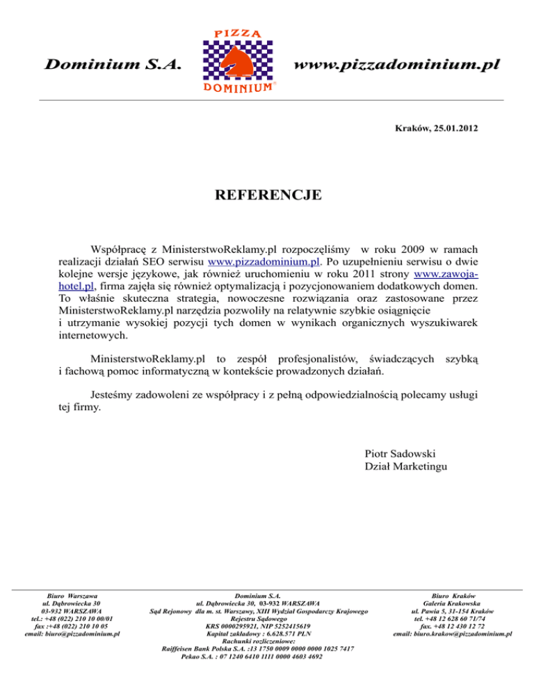Dominium S.A. www.pizzadominium.pl R Kraków, 25.01.2012 REFERENCJE Współpracę z MinisterstwoReklamy.pl rozpoczęliśmy w roku 2009 w ramach realizacji działań SEO serwisu www.pizzadominium.pl. Po uzupełnieniu serwisu o dwie kolejne wersje językowe, jak również uruchomieniu w roku 2011 strony www.zawojahotel.pl, firma zajęła się również optymalizacją i pozycjonowaniem dodatkowych domen. To właśnie skuteczna strategia, nowoczesne rozwiązania oraz zastosowane przez MinisterstwoReklamy.pl narzędzia pozwoliły na relatywnie szybkie osiągnięcie i utrzymanie wysokiej pozycji tych domen w wynikach organicznych wyszukiwarek internetowych. MinisterstwoReklamy.pl to zespół profesjonalistów, świadczących szybką i fachową pomoc informatyczną w kontekście prowadzonych działań. Jesteśmy zadowoleni ze współpracy i z pełną odpowiedzialnością polecamy usługi tej firmy. Piotr Sadowski Dział Marketingu Biuro Warszawa ul. Dąbrowiecka 30 03-932 WARSZAWA tel.: +48 (022) 210 10 00/01 fax :+48 (022) 210 10 05 email: [email protected] Dominium S.A. ul. Dąbrowiecka 30, 03-932 WARSZAWA Sąd Rejonowy dla m. st. Warszawy, XIII Wydział Gospodarczy Krajowego Rejestru Sądowego KRS 0000295921, NIP 5252415619 Kapitał zakładowy : 6.628.571 PLN Rachunki rozliczeniowe: Raiffeisen Bank Polska S.A. :13 1750 0009 0000 0000 1025 7417 Pekao S.A. : 07 1240 6410 1111 0000 4603 4692 Biuro Kraków Galeria Krakowska ul. Pawia 5, 31-154 Kraków tel. +48 12 628 60 71/74 fax. +48 12 430 12 72 email: [email protected]