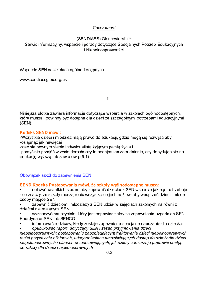 Cover page! (SENDIASS) Gloucestershire Serwis informacyjny, wsparcie i porady dotyczące Specjalnych Potrzeb Edukacyjnych i Niepełnosprawności Wsparcie SEN w szkołach ogólnodostępnych www.sendiassglos.org.uk 1 Niniejsza ulotka zawiera informacje dotyczące wsparcia w szkołach ogólnodostępnych, które muszą i powinny być dotępne dla dzieci ze szczególnymi potrzebami edukacyjnymi (SEN). Kodeks SEND mówi: -Wszystkie dzieci i młodzież mają prawo do edukacji, gdzie mogą się rozwijać aby: -osiągnąć jak nawięcej -stać się pewnym siebie indywidualistą żyjącym pełnią życia i -pomyślnie przejść w życie dorosłe czy to podejmując zatrudnienie, czy decydując się na edukację wyższą lub zawodową.(6.1) Obowiązek szkół do zapewnienia SEN SEND Kodeks Postępowania mówi, że szkoły ogólnodostępne muszą: • dołożyć wszelkich starań, aby zapewnić dziecku z SEN wsparcie jakiego potrzebuje - co znaczy, że szkoły muszą robić wszystko co jest możliwe aby wesprzeć dzieci i młode osoby mające SEN • zapewnić dzieciom i młodzieży z SEN udział w zajęciach szkolnych na równi z dziećmi nie mającymi SEN. • wyznaczyć nauczyciela, który jest odpowiedzialny za zapewnienie uzgodnień SENKoordynator SEN lub SENCO • informować rodziców, kiedy zostaje zapewnione specjalne nauczanie dla dziecka • opublikować raport dotyczący SEN i zasad przyjmowania dzieci niepełnosprawnych: postępowaniu zapobiegającym traktowania dzieci niepełnosprawnych mniej przychylnie niż innych, udogodnieniach umożliwiających dostęp do szkoły dla dzieci niepełnosprawnych i planach przedstawiających, jak szkoły zamierzają poprawić dostęp do szkoły dla dzieci niepełnosprawnych 6.2 2 Co oznacza wsparcie SEN? Każde dziecko mające specjalne potrzeby edukacyjne powinno otrzymać wsparcie SEN. Oznacza to pomoc dodatkową lub inną od wsparcia udzielanego dla większości innych dzieci w tym samym wieku. (In the circle )-”Celem wsparcia SEN, jest pomoc dzieciom i młodzieży w osiągnięciu wyników lub celów w nauczaniu ustalonych przez szkołę wspólnie z rodzicami i samymi uczniami”) Każda szkoła musi publikować raport o zapewnieniu SEN przez szkołę. Informację tą można znaleźć na stronie internetowej szkoły. Równie dobrze o informacje dotyczące zapewnienia SEN należy poprosić Nauczyciela Twojego dziecka bądż Koordynatora od Specjalnych Potrzeb Edukacyjnych. Lokalna Oferta publikowana przez Władze Lokalne Gloucestershire, również ustala jakiego wsparcia oczekuje od placówek przedszkolych, szkół i kolegiów wobec dzieci i młodzieży mających SEN lub niepełnosprawność. Wsparcie SEN może przybierać wiele form uwzględniając: • specjalny program nauczania dla Twojego dziecka • dodatkowa pomoc ze strony nauczyciela lub asystenta wspierającego w nauce • wykonywanie lub zmiana materiałów i urządzeń • współpraca z Twoim dzieckiem w małej grupie • obserwacja Twojego dziecka w klasie, na przerwach i prowadzenie notatek • pomaganie w uczestniczeniu w zajęciach lekcyjnych • sprawdzanie poziomu zrozumienia i zachęcanie do zadawania pytań oraz do próbowania rzeczy, które może dziecku sprawiać trudność • pomaganie innym dzieciom we współpracy z Twoim dzieckiem lub wspólnej zabawie podczas przerw • wsparcie Twojego dziecka w potrzebach fizycznych lub higienie osobistej, jak np.: spożywanie posiłków, bezpieczne poruszanie się po szkole, korzystanie z toalety, pomoc w ubieraniu się • porada i dodatkowa pomoc ze strony specjalistów, wyspecjalizowanych nauczycieli, psychologów edukacyjnych i terapeutow. Jeśli szkoła chce porozmawiać ze specjalistami, najpierw powinno zostać to omówione z rodzicami. 3 Kto decyduje o rodzaju wsparcia SEN jakie moje dziecko otrzymuje? SEND Kodeks mówi: Wychowawcy klas i nauczyciele, wspierani przez przewodniczącego zespołu, powinni przeprowadzać regularne oszacowanie potępów wszystkich uczniów, aby zidentyfikować uczniów z mniejszymi postępami.Biorąc pod uwagę ich wiek i indywidualne okoliczności. (6.17) Wtedy szkoła powinna zadecydować o tym, czy Twoje dziecko potrzebuje wsparcia SEN. Szkoła powinna to omówić z Tobą i Twoim dzieckiem. Jesli uczeń ma 16lat i więcej, szkoła powinna skontaktować się bezpośrednio z nim. Zdarza się, że to właśnie Ty jesteś pierwszą osobą, która zaobserwuje szczególne potrzeby edukacyjne u Twojego dziecka. Jeśli wydaje Ci się, że Twoje dziecko może potrzebować wsparcia SEN, powinieneś porozmawiać z nauczycielem Twojego dziecka lub Koordynatorem od specjalnych potrzeb edukacyjnych. Jeśli nie jesteś zadowlony/a ze wsparcia jakie otrzymuje Twoje dziecko należy porozmawiać z Kordynatorem od Specjanych Potrzeb Edukacyjnych lub dyrektorem. Więcej informacji można zasięgnąć w ulotce: „Gdzie mogę znależć więcej informacji, porad i wspracia?” Stopniowy podejście Kiedy u Twojego dziecka została zindentyfikowana potrzeba wsparcia SEN, szkoła powinna zastosować stopniowe podejście, oparte na 4 stopniach. Są to: Oszacowanie Plan Kontrola/ Przegląd Działanie (In the circle): SEND Kodeks mówi: U dziecka, kórego rozpoznano SEN, szkoły powinny podjąć kroki, aby usunąć wszelkie barriery w nauczaniu i zapewnić efektywne, specjalne udogodnienia edukacyjne. (6.44) 4 Oszacowanie Nauczyciele powinni współpracować z Koordynatorem zajmującym się Specjalnymi Potrzebami Edukacyjnymi, aby uzyskać dostęp do potrzeb dziecka i zapewnić właściwe wsparcie.Powinnineś/powinnaś zostać poinformowany/a i kiedy jest to możliwe należy zasięgnąć opini Twojego dziecka. SEND Kodeks Postępowania mówi: Szkoły powinny poważnie brać pod uwagę skargi złożone przez rodziców (6.45) Zdarza się, że szkoły potrzebują porady od nauczyciela specjalisty lub osoby profesjonalnej medycznej.Powinno najpierw to zostać omówione z Tobą. Plan Szkoła Twojego dziecka powinna poinformowa
