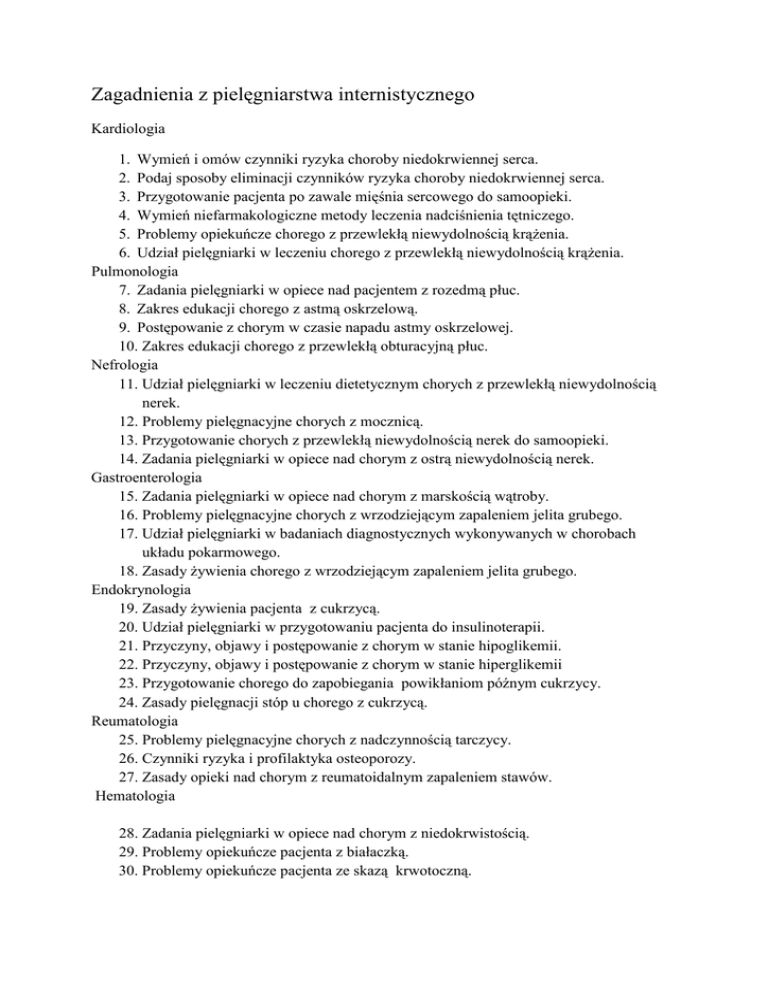 Zagadnienia z pielęgniarstwa internistycznego Kardiologia 1. Wymień i omów czynniki ryzyka choroby niedokrwiennej serca. 2. Podaj sposoby eliminacji czynników ryzyka choroby niedokrwiennej serca. 3. Przygotowanie pacjenta po zawale mięśnia sercowego do samoopieki. 4. Wymień niefarmakologiczne metody leczenia nadciśnienia tętniczego. 5. Problemy opiekuńcze chorego z przewlekłą niewydolnością krążenia. 6. Udział pielęgniarki w leczeniu chorego z przewlekłą niewydolnością krążenia. Pulmonologia 7. Zadania pielęgniarki w opiece nad pacjentem z rozedmą płuc. 8. Zakres edukacji chorego z astmą oskrzelową. 9. Postępowanie z chorym w czasie napadu astmy oskrzelowej. 10. Zakres edukacji chorego z przewlekłą obturacyjną płuc. Nefrologia 11. Udział pielęgniarki w leczeniu dietetycznym chorych z przewlekłą niewydolnością nerek. 12. Problemy pielęgnacyjne chorych z mocznicą. 13. Przygotowanie chorych z przewlekłą niewydolnością nerek do samoopieki. 14. Zadania pielęgniarki w opiece nad chorym z ostrą niewydolnością nerek. Gastroenterologia 15. Zadania pielęgniarki w opiece nad chorym z marskością wątroby. 16. Problemy pielęgnacyjne chorych z wrzodziejącym zapaleniem jelita grubego. 17. Udział pielęgniarki w badaniach diagnostycznych wykonywanych w chorobach układu pokarmowego. 18. Zasady żywienia chorego z wrzodziejącym zapaleniem jelita grubego. Endokrynologia 19. Zasady żywienia pacjenta z cukrzycą. 20. Udział pielęgniarki w przygotowaniu pacjenta do insulinoterapii. 21. Przyczyny, objawy i postępowanie z chorym w stanie hipoglikemii. 22. Przyczyny, objawy i postępowanie z chorym w stanie hiperglikemii 23. Przygotowanie chorego do zapobiegania powikłaniom późnym cukrzycy. 24. Zasady pielęgnacji stóp u chorego z cukrzycą. Reumatologia 25. Problemy pielęgnacyjne chorych z nadczynnością tarczycy. 26. Czynniki ryzyka i profilaktyka osteoporozy. 27. Zasady opieki nad chorym z reumatoidalnym zapaleniem stawów. Hematologia 28. Zadania pielęgniarki w opiece nad chorym z niedokrwistością. 29. Problemy opiekuńcze pacjenta z białaczką. 30. Problemy opiekuńcze pacjenta ze skazą krwotoczną.